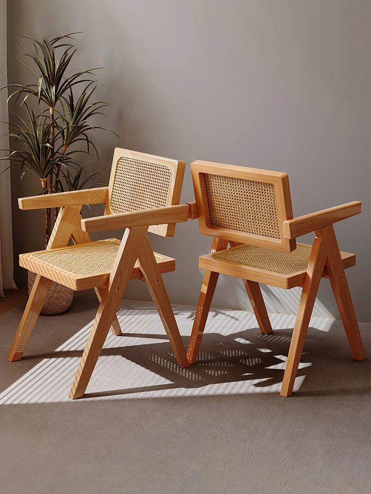 2024年新作!天然木材使用の家庭用ダイニングチェア - ヴィンテージ風のチャンディガールチェア、無垢材とラタン編みのリラックスした雰囲気をお楽しみください。おしゃれで機能的な一脚をお見逃しなく!