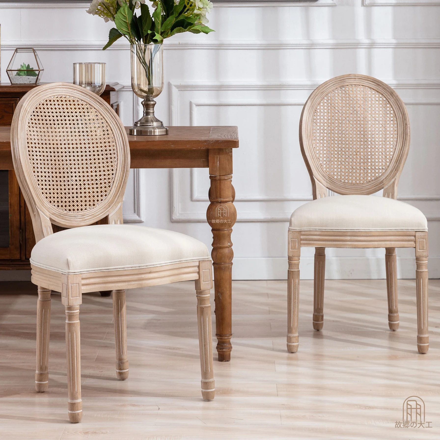 高級感漂う実木製ダイニングテーブルセット|レトロな背もたれ付きフランス風ラタン編みダイニングチェア|リラックスできる家庭用チェア|グリーンアイデザインの特別な椅子で、食事の時間をより特別に!