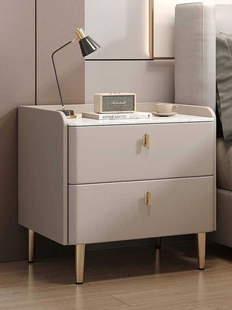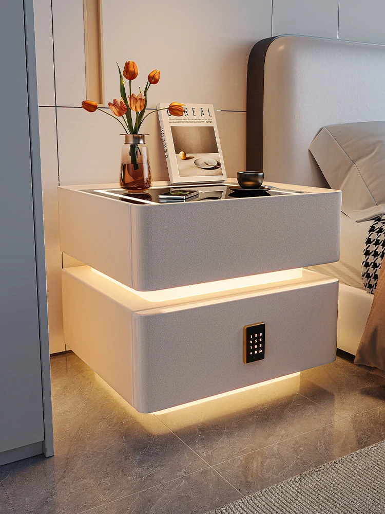 2025年新作!イタリアンスタイルの高級感あふれる無垢材ナイトテーブル - シンプルでモダンなデザイン、皮革仕上げ、スマート機能付きのベッドサイドキャビネットで、洗練された寝室空間を演出!