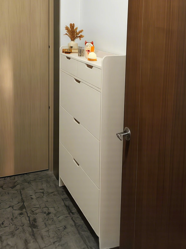 スリムなデザインの玄関収納!2025年新作、家用・エントランス用の超薄型靴棚。壁に寄せて使える便利な一体型シューズキャビネット。限られたスペースを有効活用し、すっきりとした玄関を演出します!