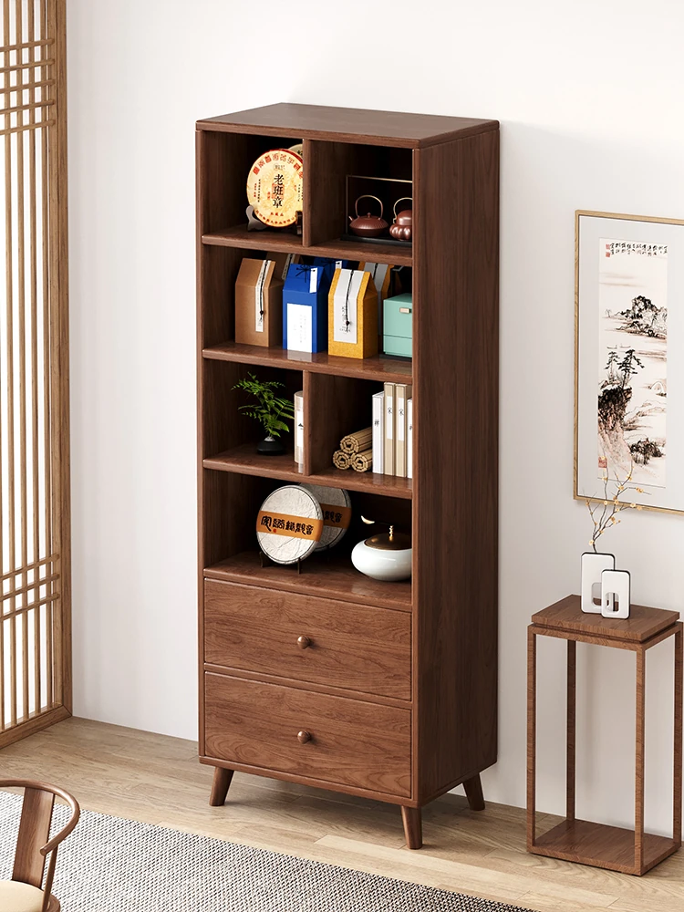 天然木材使用のスタイリッシュなフロア書棚!リビングにぴったりな壁面収納キャビネット。学生にも最適な多段階のスリムデザインで、限られたスペースを最大限に活用。収納力抜群でお部屋がすっきり!
