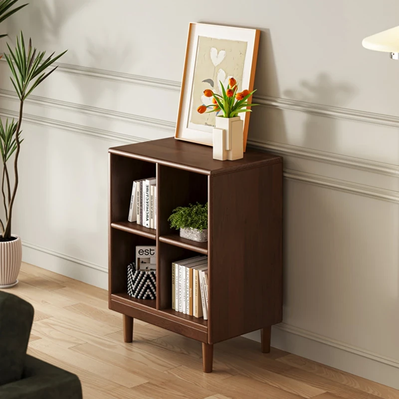 ウォールナット色の無垢材書棚・収納ラック、リビングにぴったりのフロアタイプ!壁に寄せて設置できる省スペース型コーナー書庫、スタイリッシュな収納でお部屋をスッキリ整理!