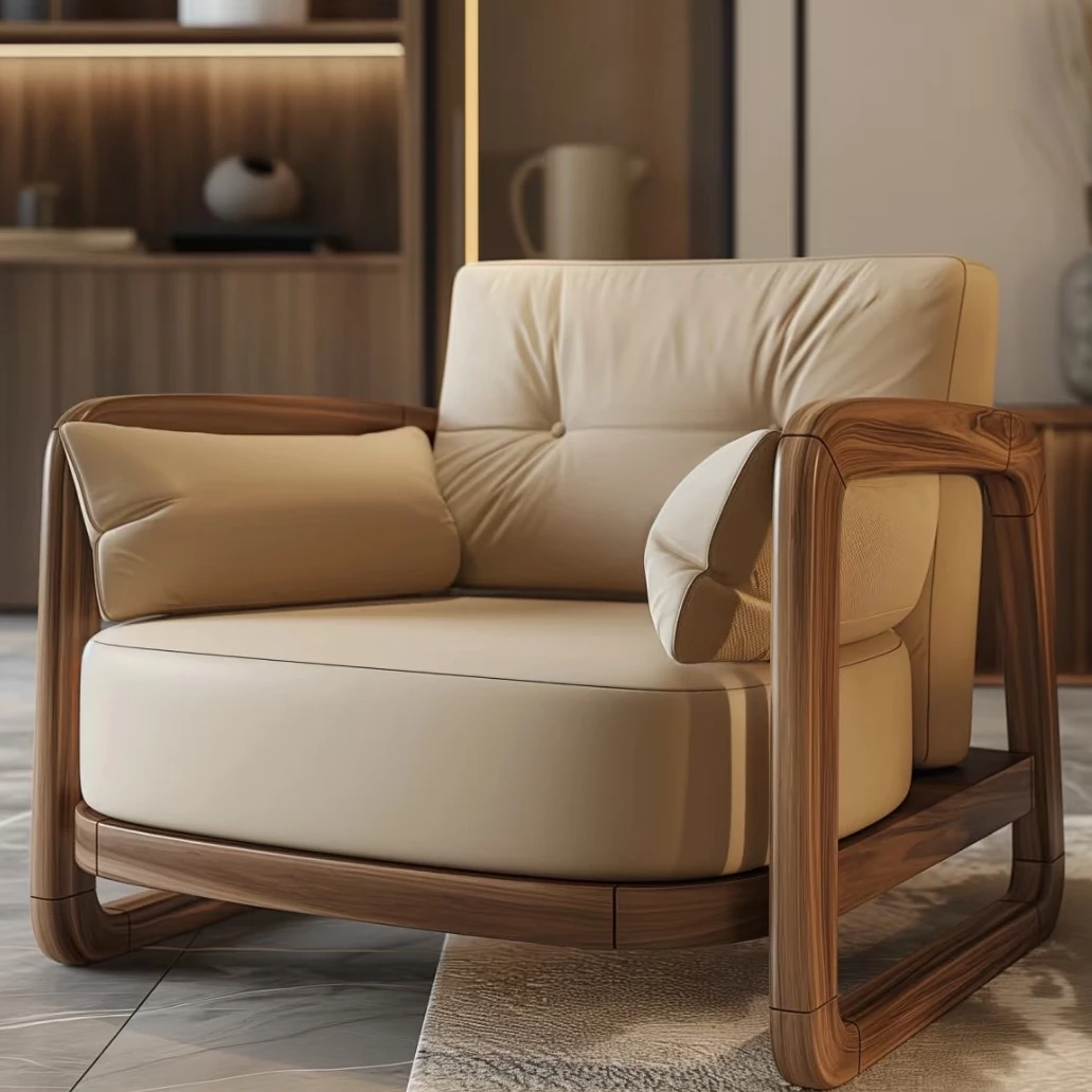 2025 New Chinese-Style Solid Wood Sofa - Modern Minimalist Leather Sofa for Living Room, Available in Walnut Color, Perfect for Various Room Sizes