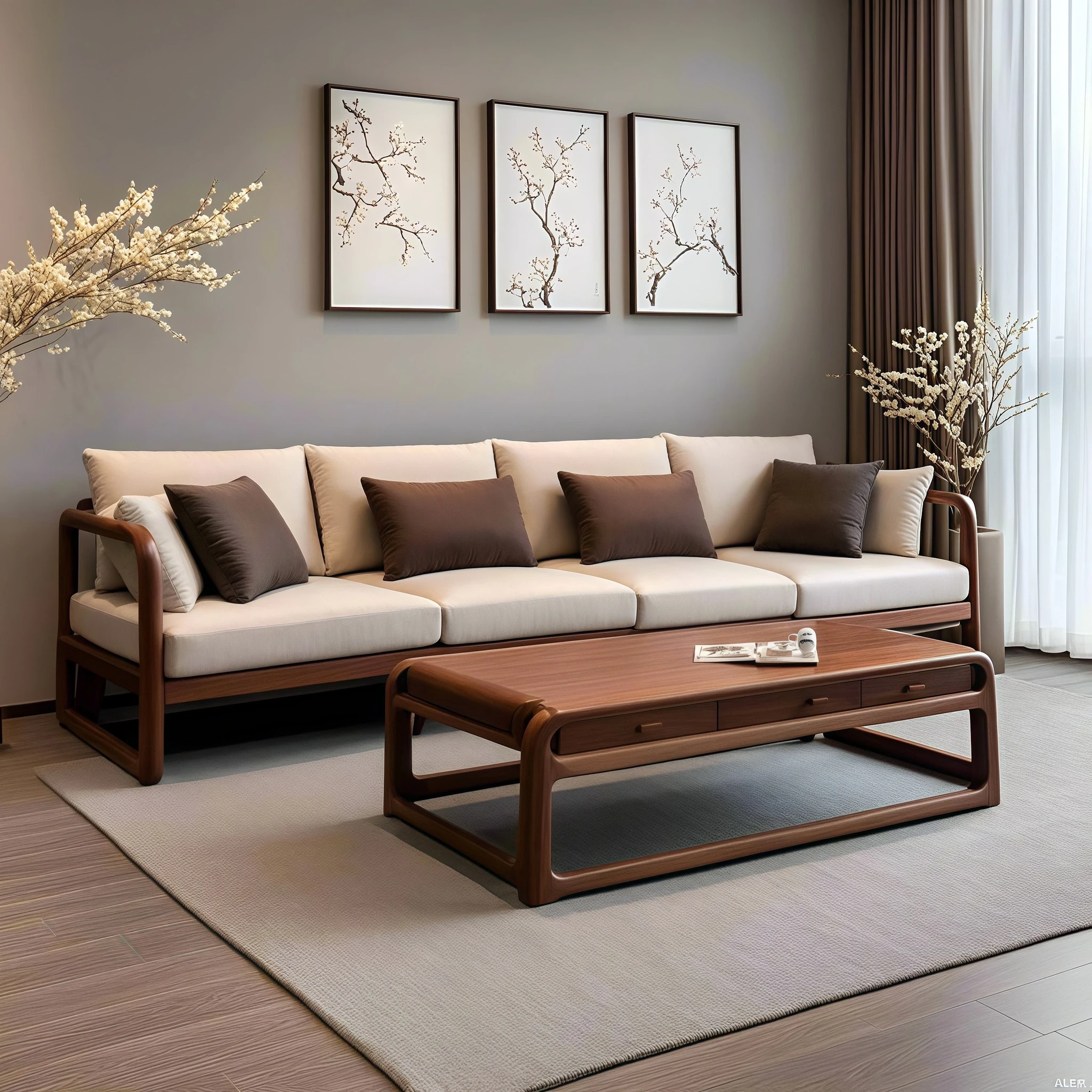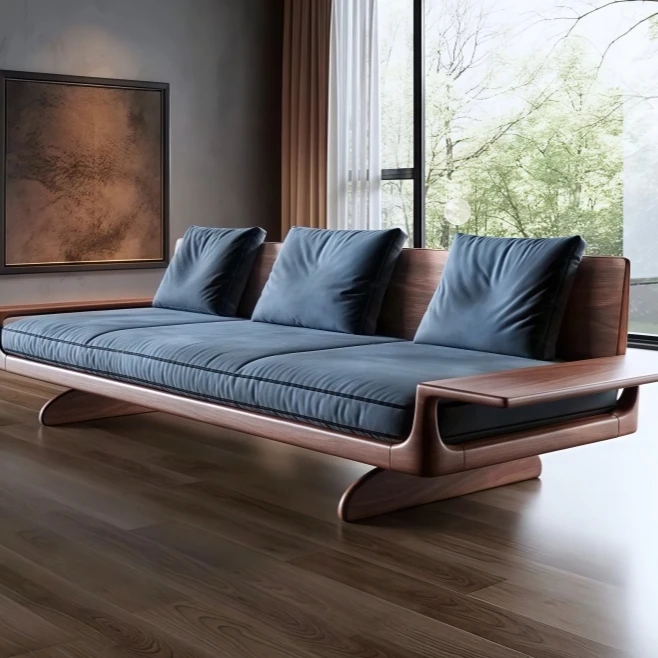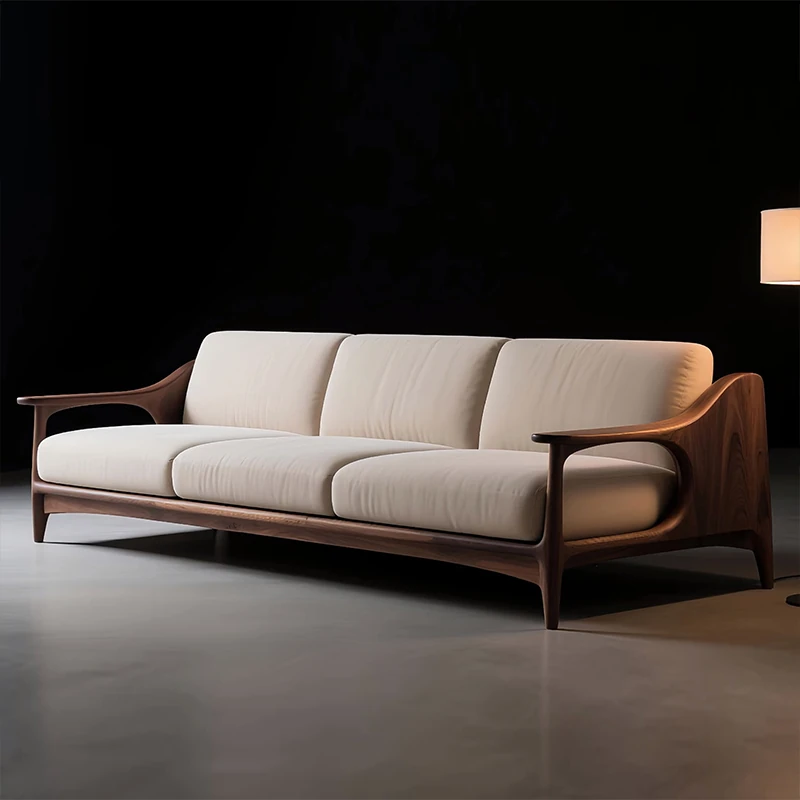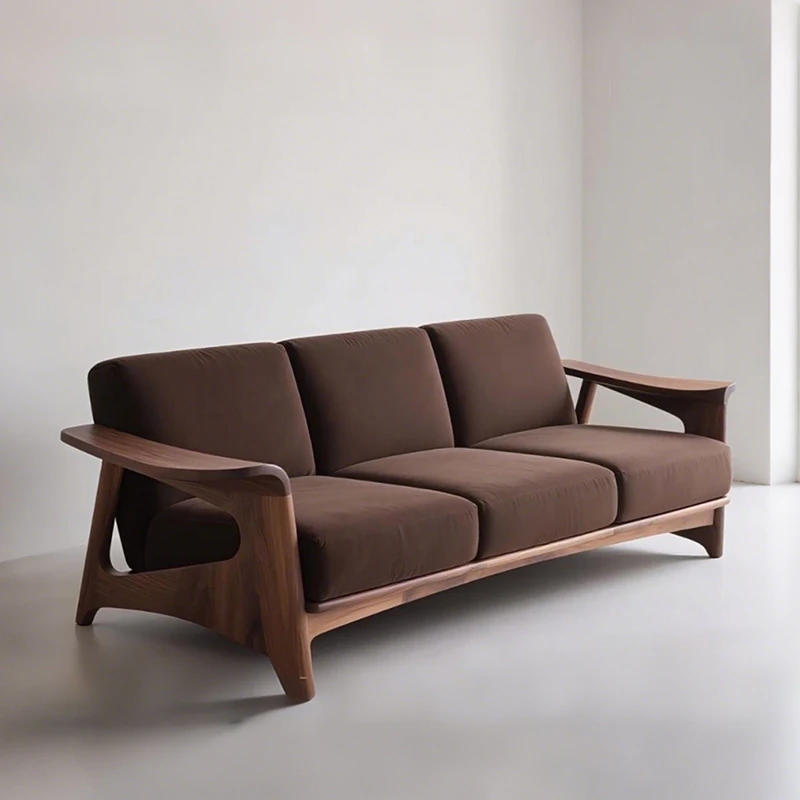 2025 New Modern Minimalist Chinese Walnut Solid Wood Sofa - High-End Living Room Straight-Line Wabi-Sabi Style Fabric Sofa