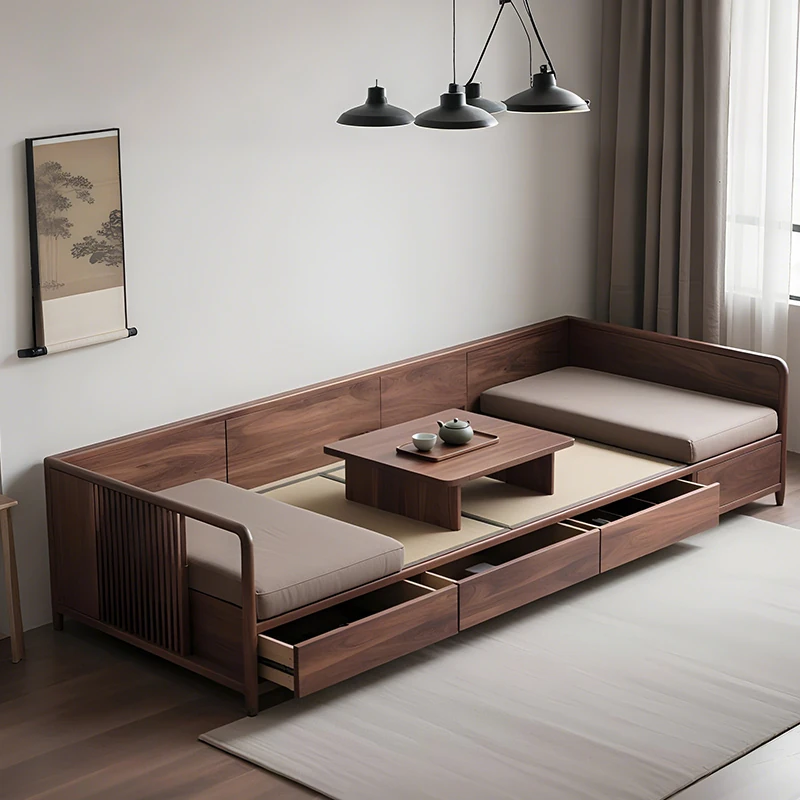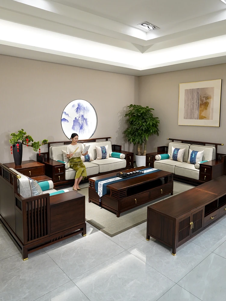 New Chinese Style Black Walnut Solid Wood Sofa - Versatile for Winter and Summer, Storage-Friendly, Zen-Inspired Lounger for Your Living Room