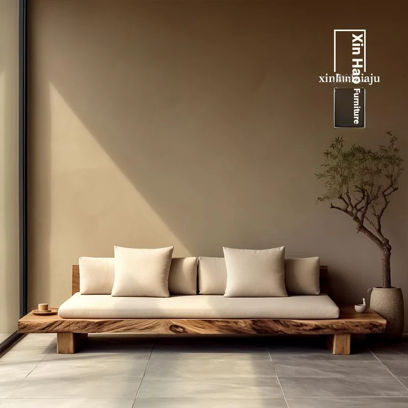 Wabi-Sabi Style Solid Wood Sofa - Vintage Minimalist Furniture for Modern Guesthouses, Cozy 2-Seater & 3-Seater Lounge Chairs in Natural Wood Finish for Your Living Room