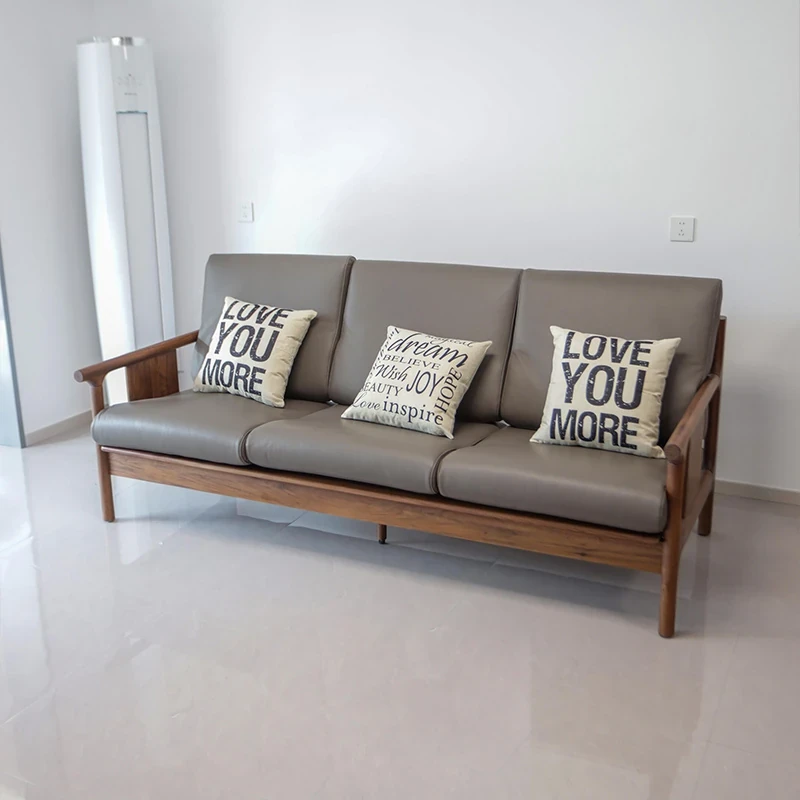 Modern Chinese Style North American Black Walnut Sofa - Minimalist Leather Upholstered Sofa for Living Room, Solid Wood Furniture Ideal for Small Spaces