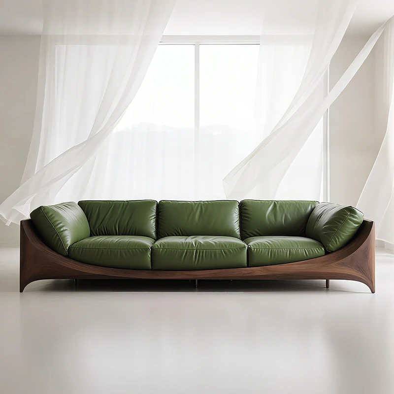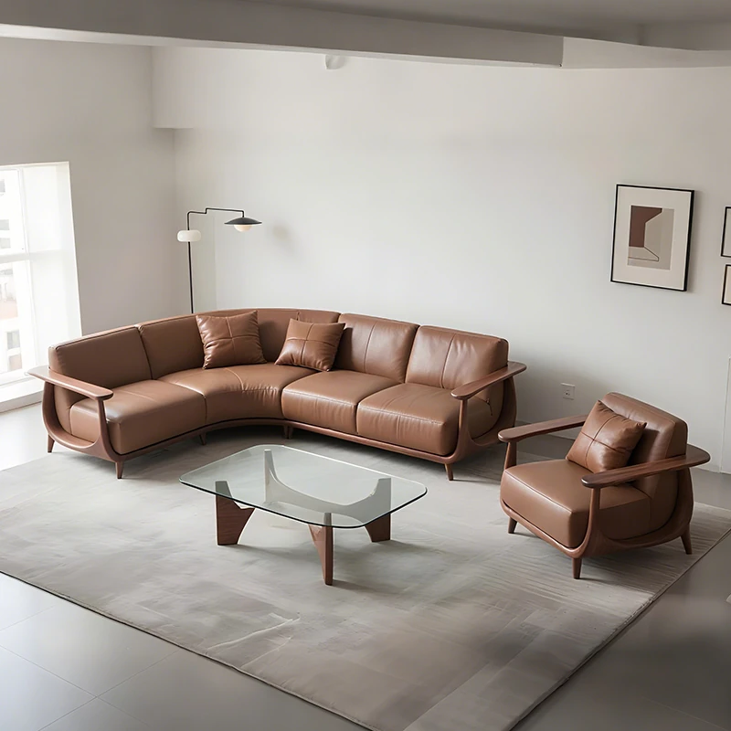 2025 New Minimalist Solid Wood Sofa for Living Room - Designer Curved Sofa in North American Black Walnut Veneer and Leather Finish