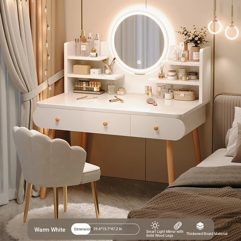 【Smart Makeup Mirror + Three-Tier Double Drawer + Fairy Chair】80Cm White●