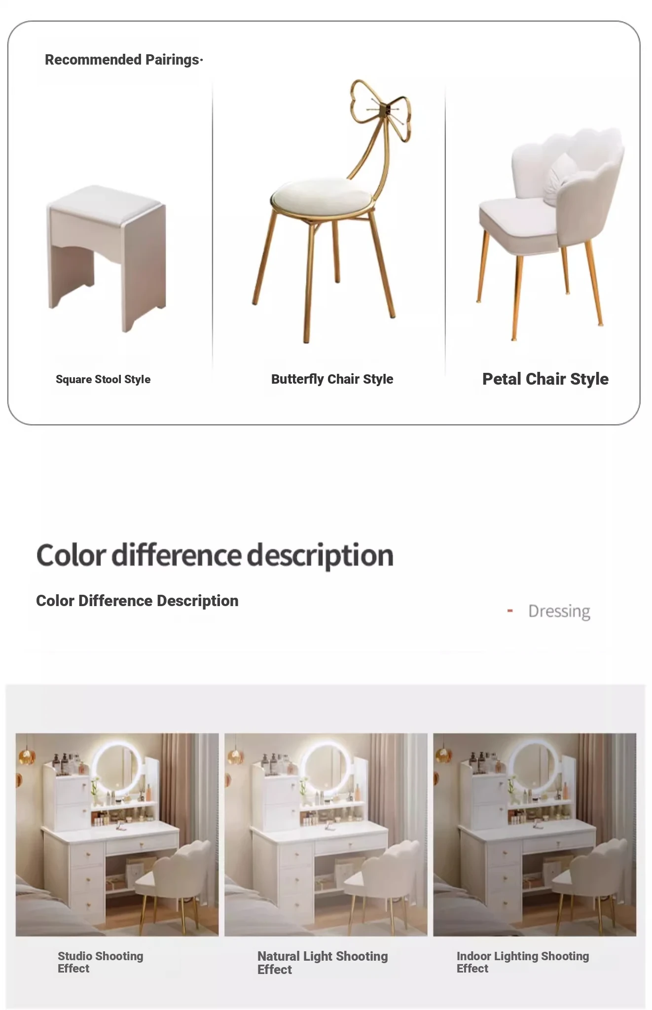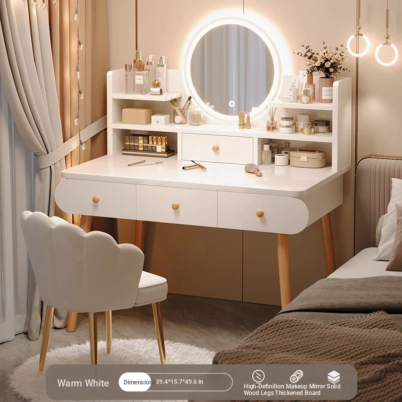 Solid Wood Legs⭐Led Light-Up Vanity Table with Four Drawers + Petal Chair - 39.37in Warm White
