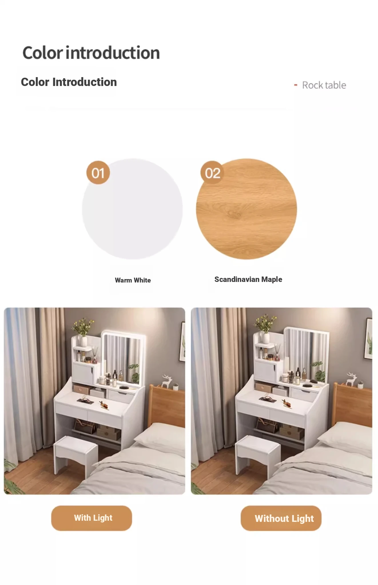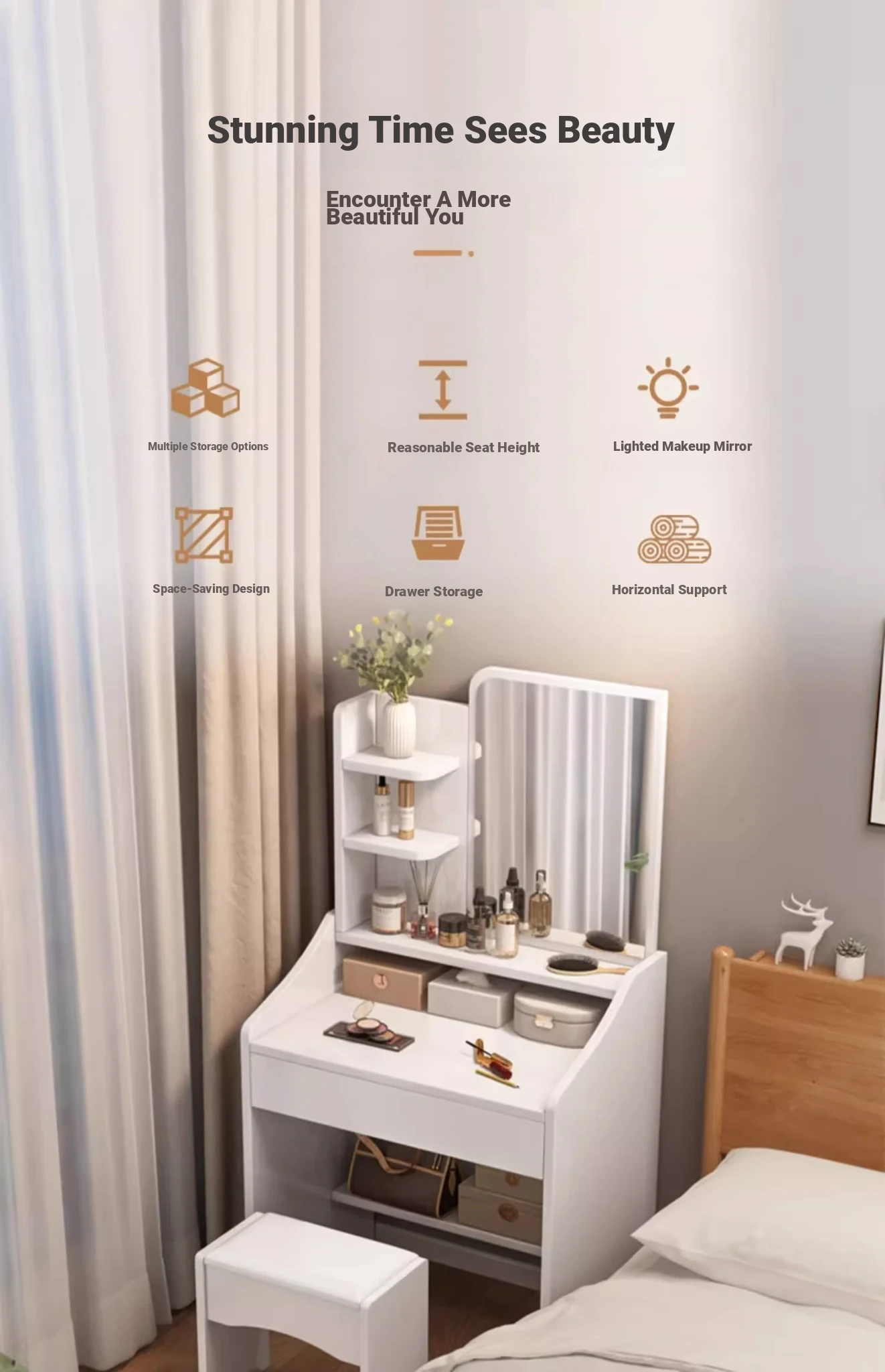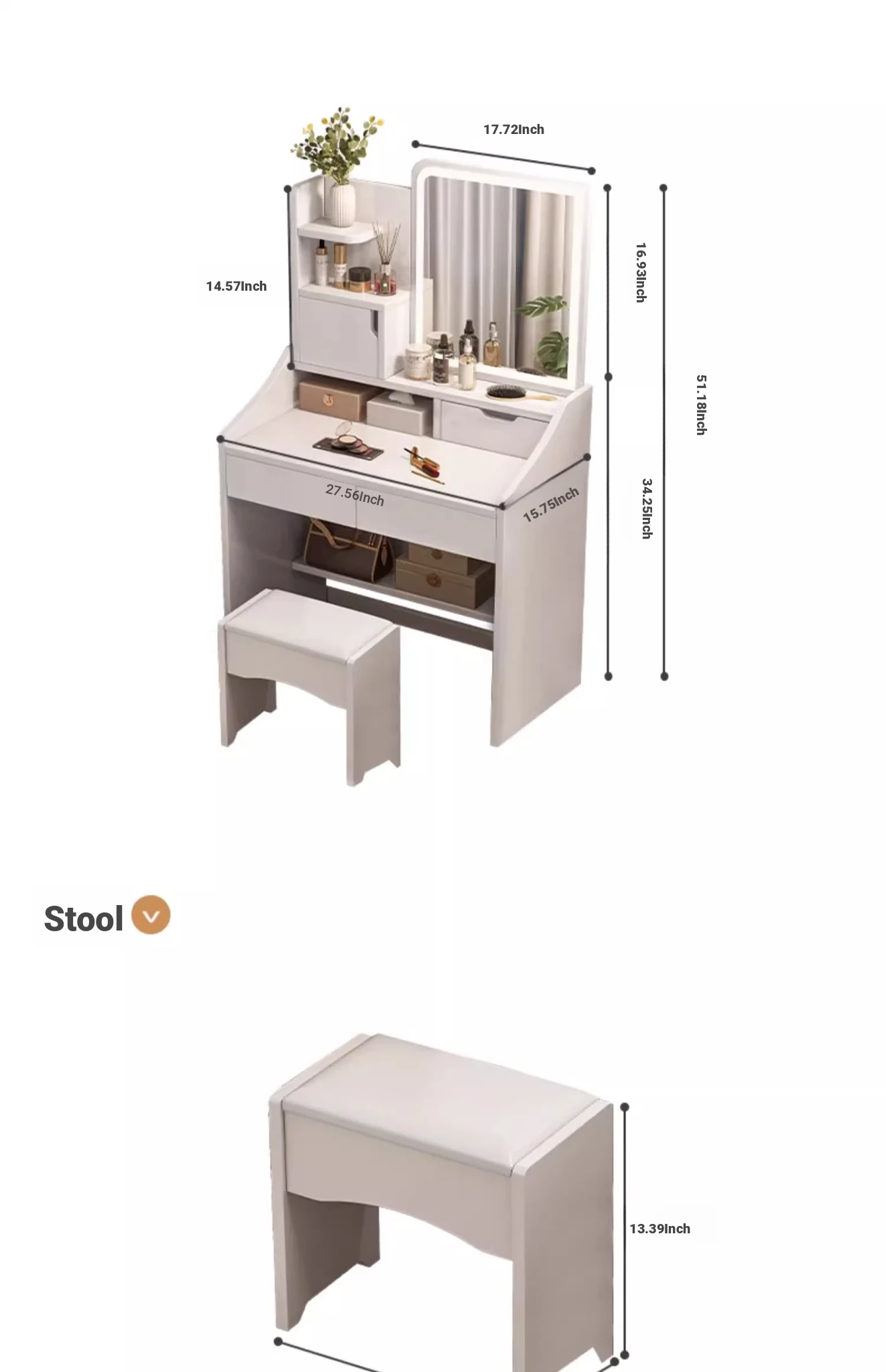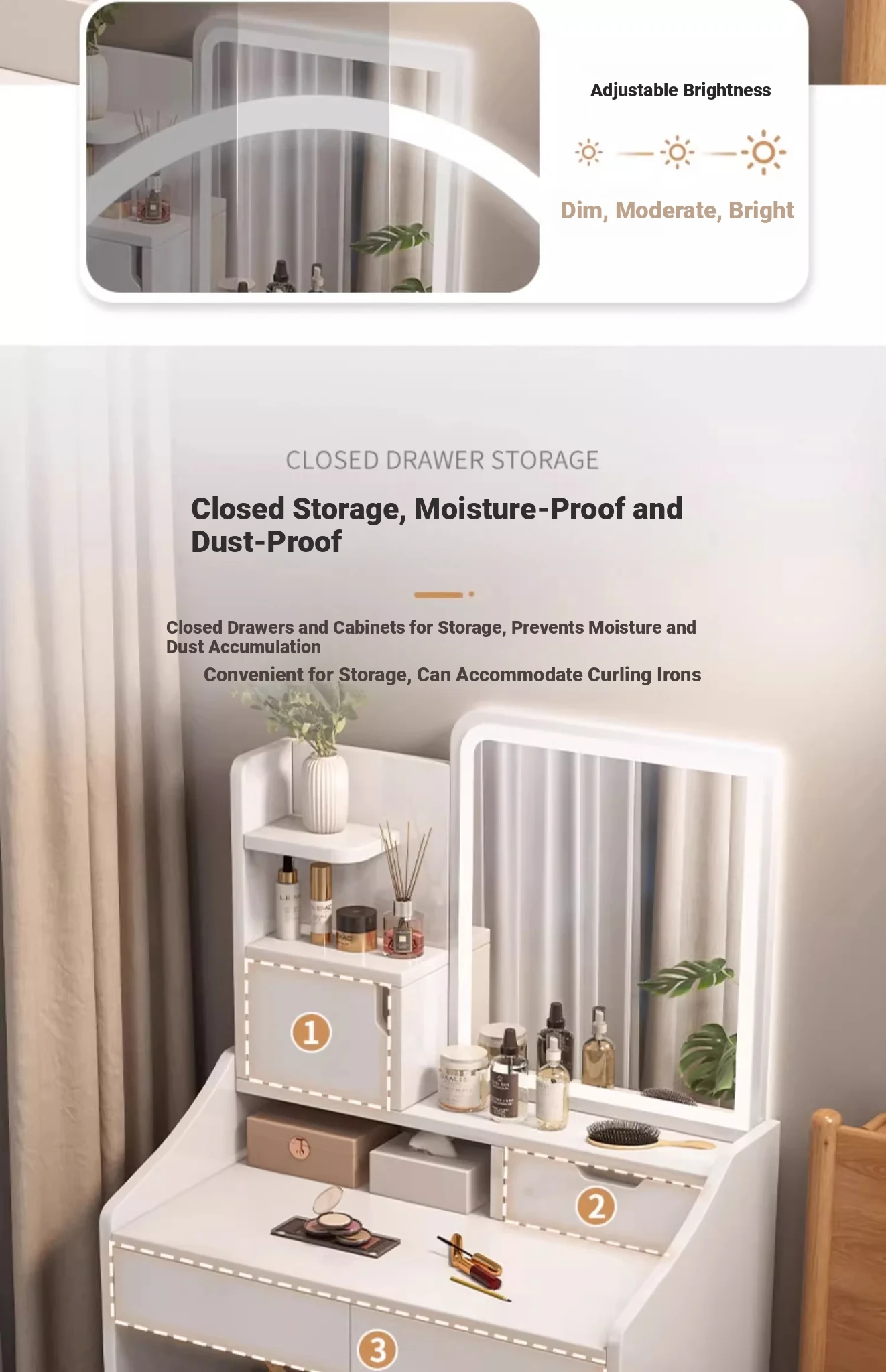 【Round Mirror Style One Drawer One Cabinet + Stool】60Cm Warm White