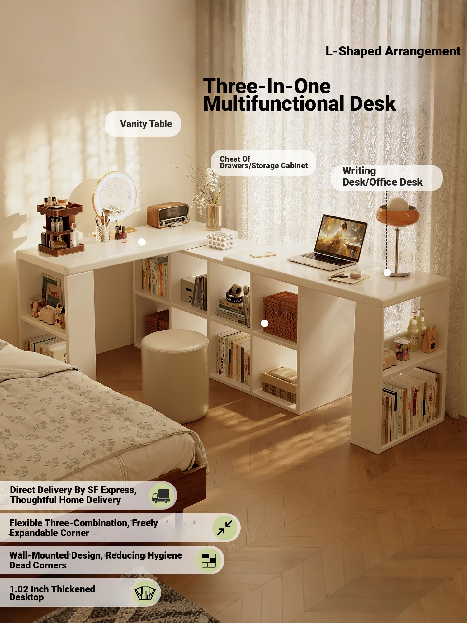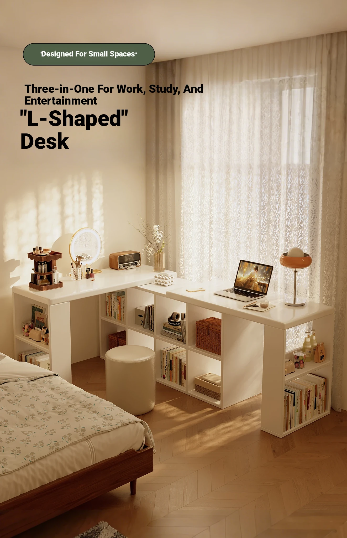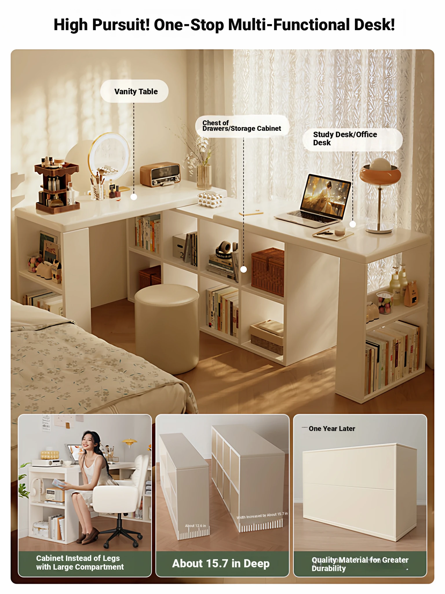 Cream Corner Desk with Vanity and Drawer Unit – Perfect for Girls' Bedrooms, Home Study, and Office Use – L-Shaped Computer Desk