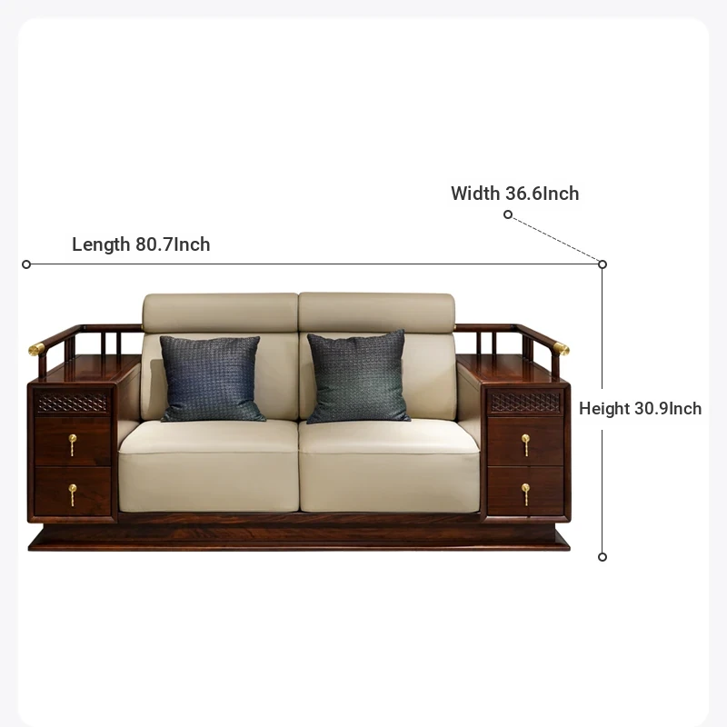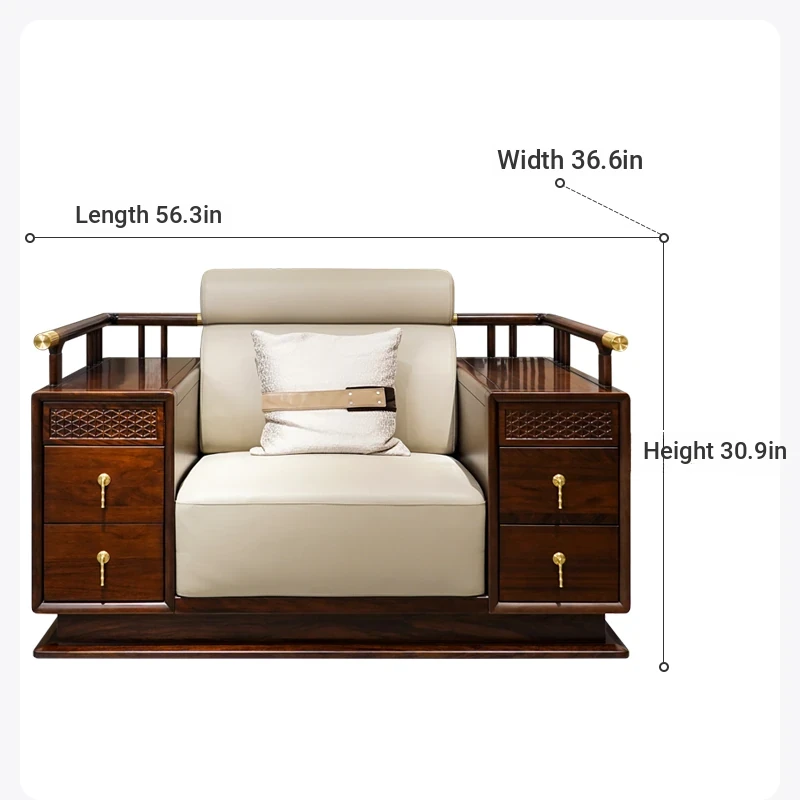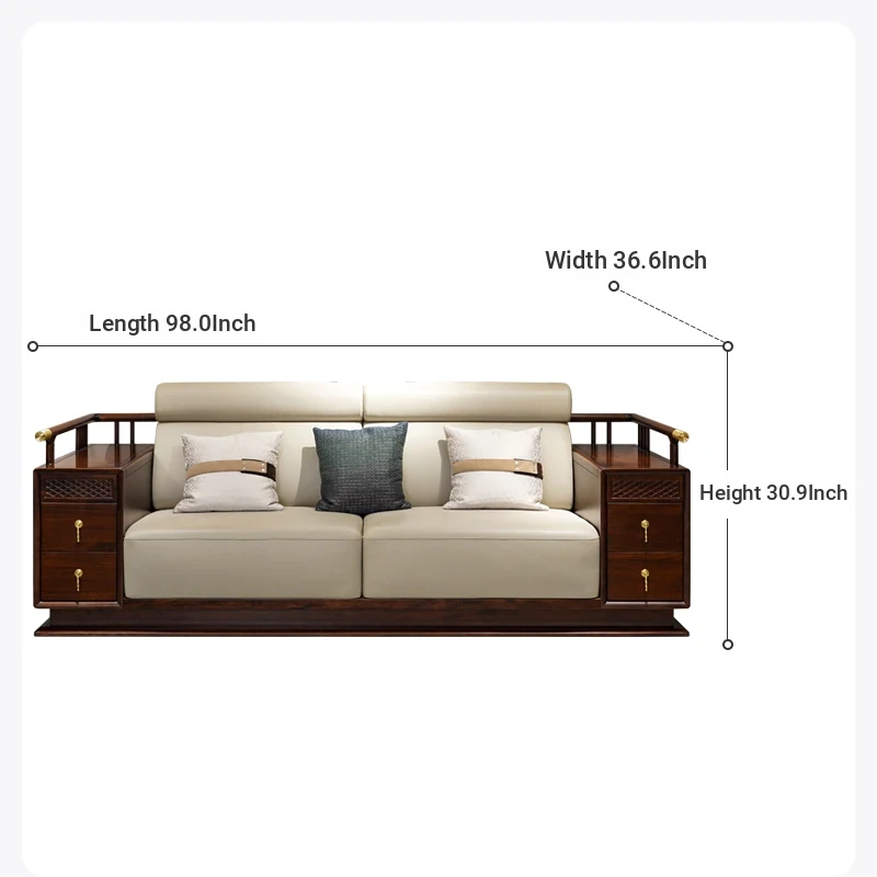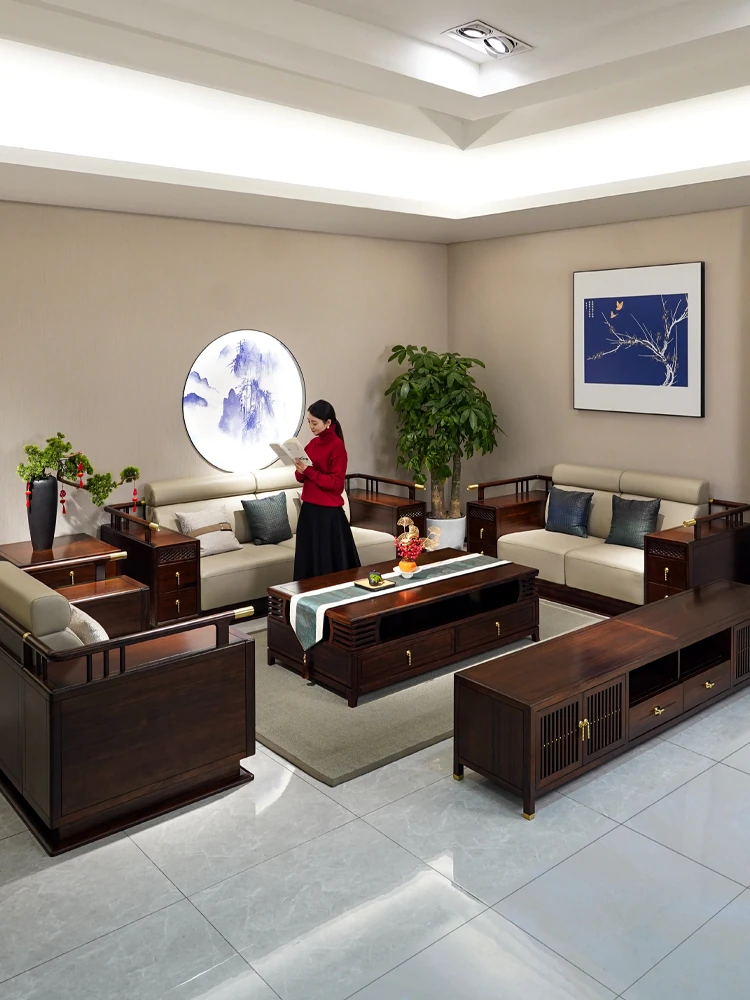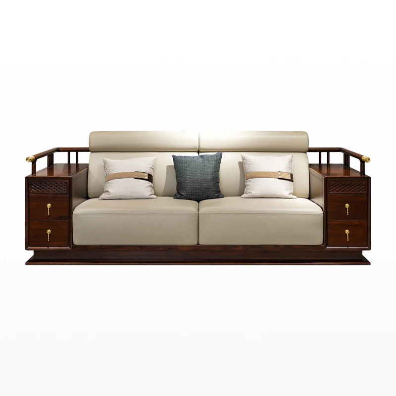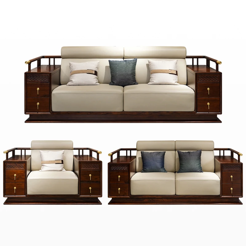 Elegant New Chinese Style Black Gold Wood Sofa Set - Luxurious Genuine Leather Sofa for Spacious Villas and Large Living Rooms, Crafted with Solid Wood Furniture