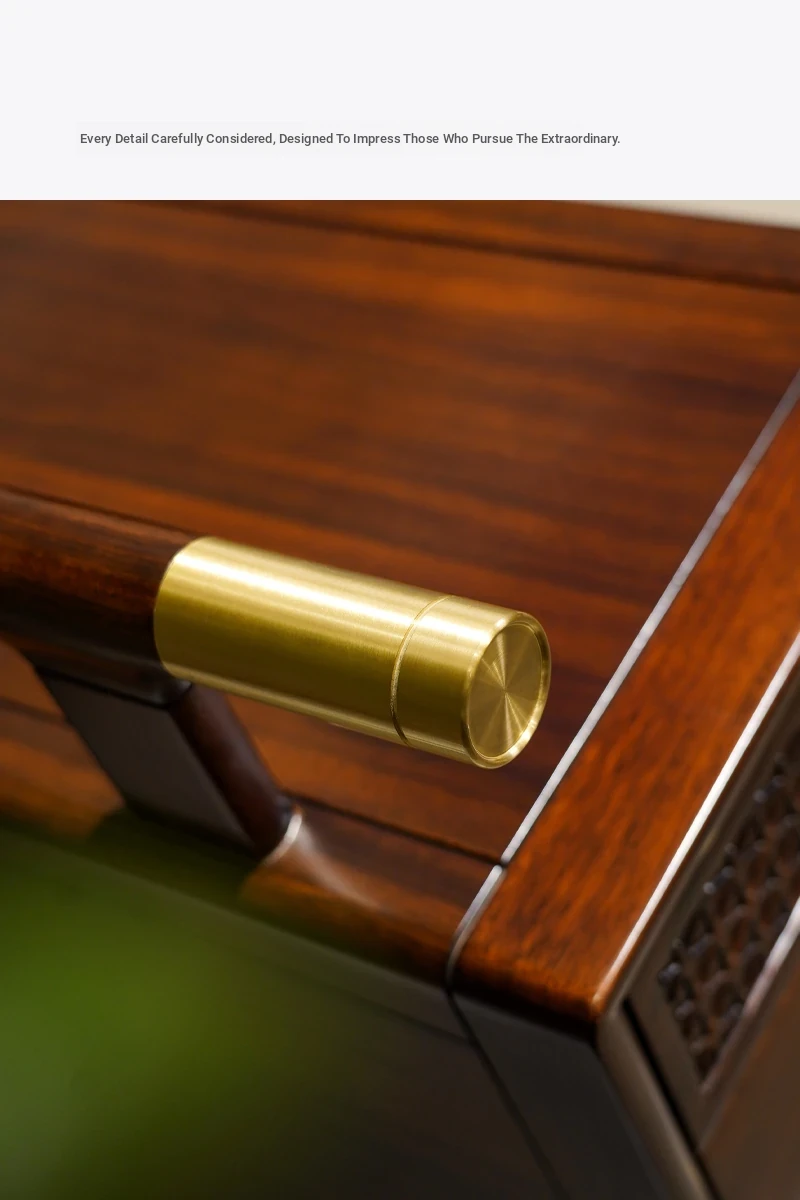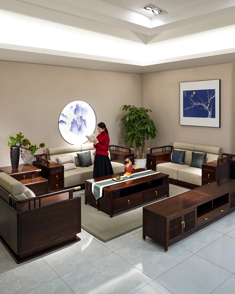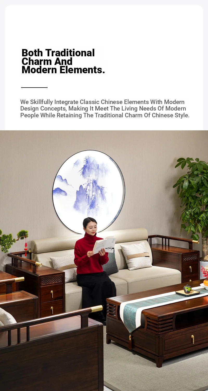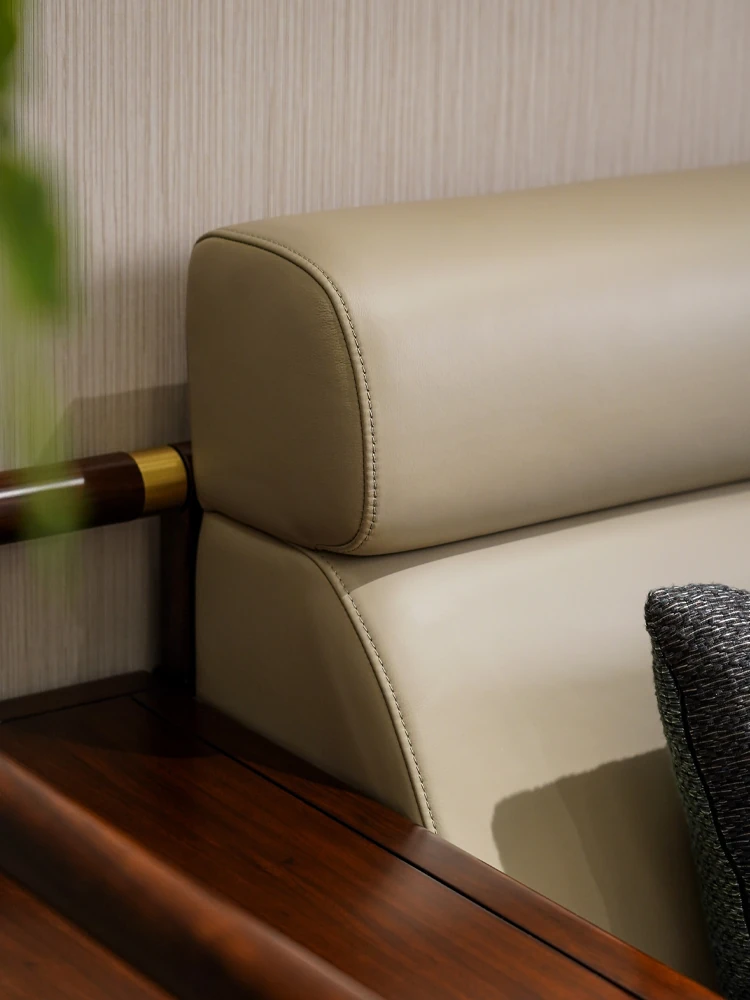 Elegant New Chinese Style Black Gold Wood Sofa Set - Luxurious Genuine Leather Sofa for Spacious Villas and Large Living Rooms, Crafted with Solid Wood Furniture