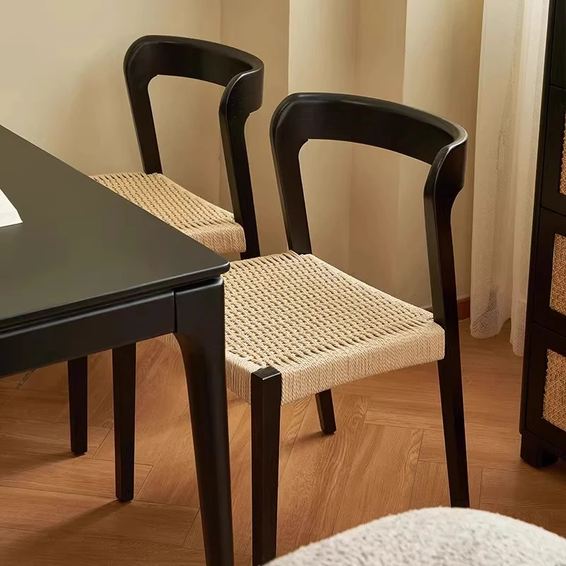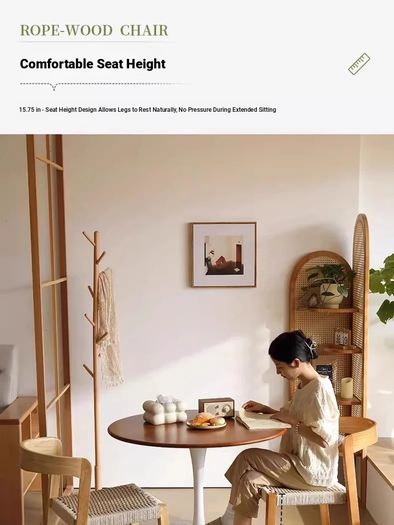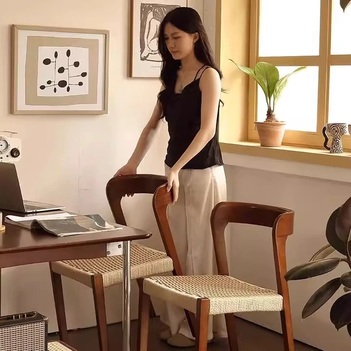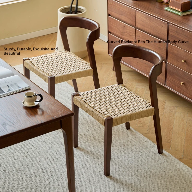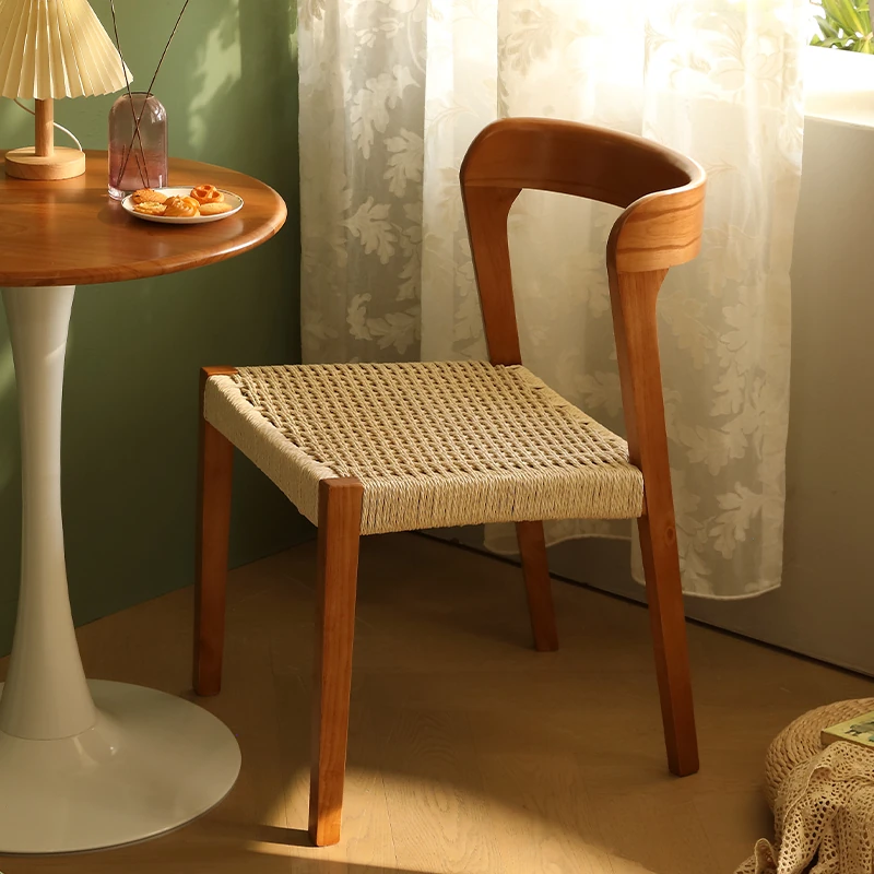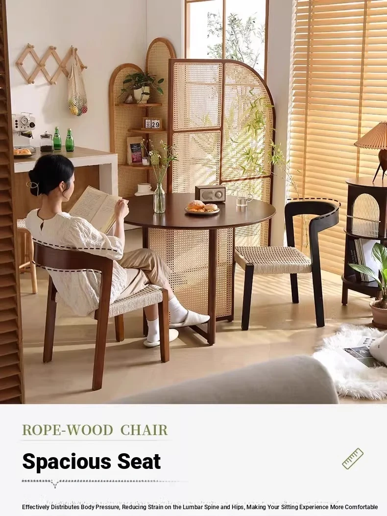 French Vintage Solid Wood Dining Chair - Designer Home Restaurant Chair with Wabi-Sabi Aesthetic, Rattan Backrest, and Boho Macrame Style for Cozy Guesthouses and Elegant Dining Spaces.