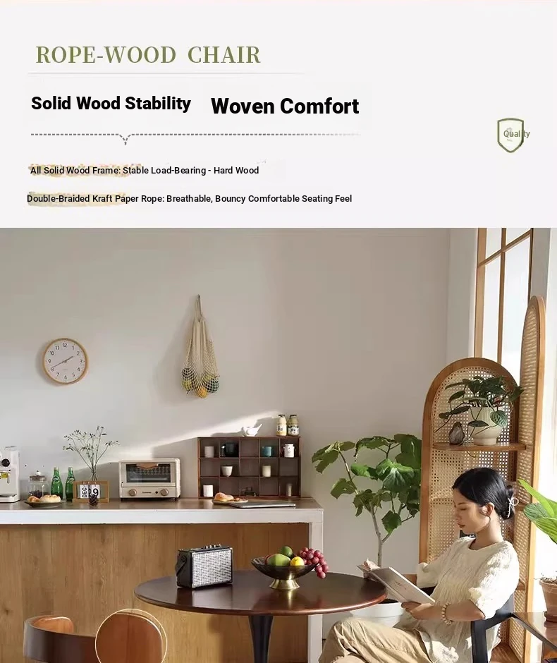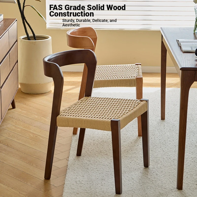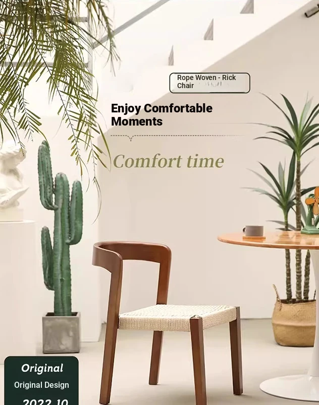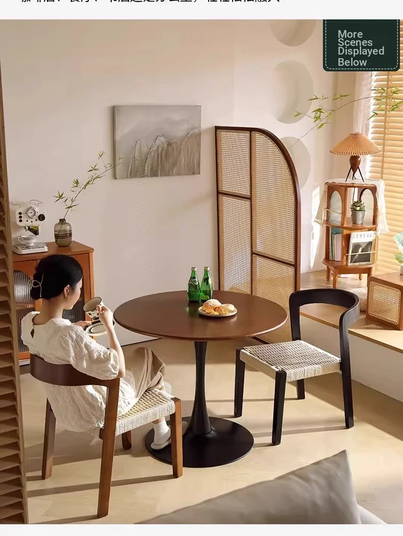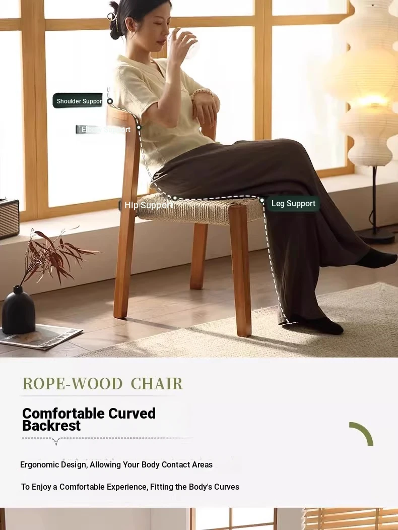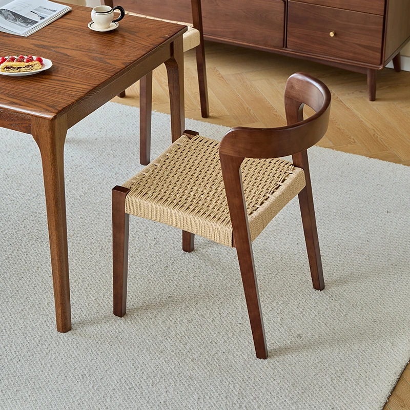 French Vintage Solid Wood Dining Chair - Designer Home Restaurant Chair with Wabi-Sabi Aesthetic, Rattan Backrest, and Boho Macrame Style for Cozy Guesthouses and Elegant Dining Spaces.
