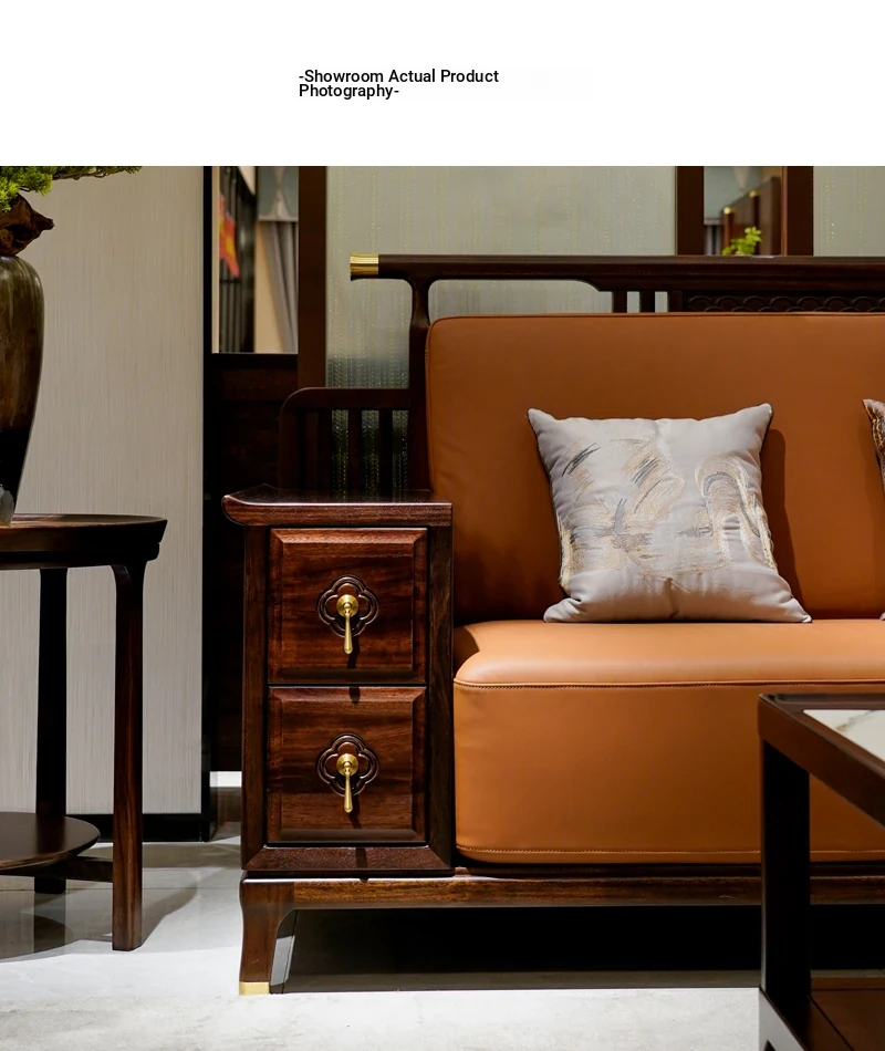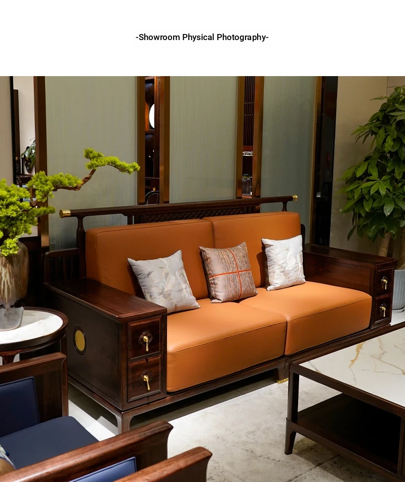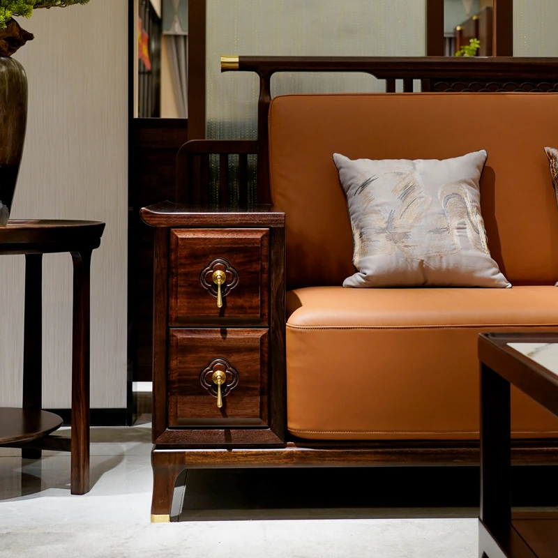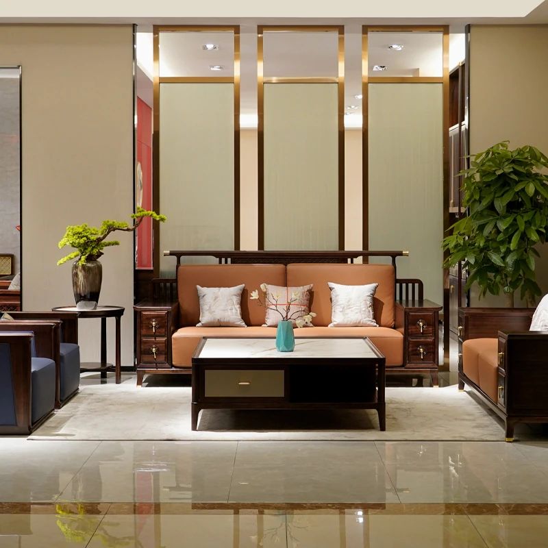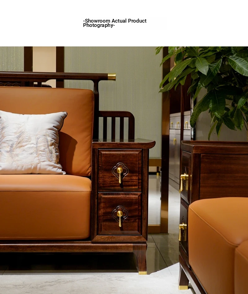Modern Chinese-Style Solid Wood Sofa with Black Gold Finish - Luxury Leather Sofa Set for Spacious Living Rooms and Villas. Perfect for Elegant Home Décor!
