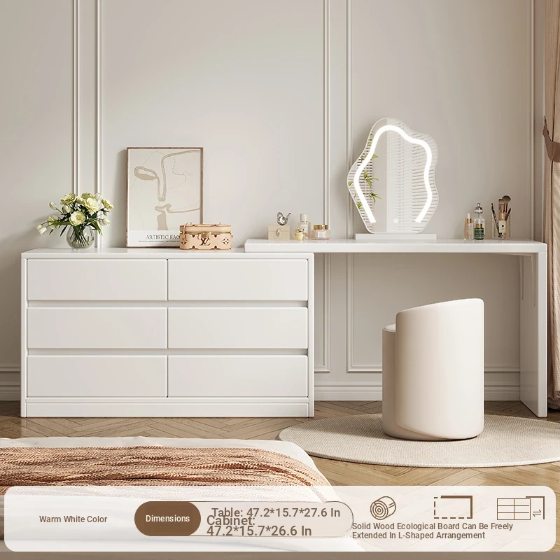【Thickened Solid Wood Eco-Panel】120Cm Desk + 47.24in Six-Drawer Dresser + Cloud Mirror + Vanity Stool, Warm White