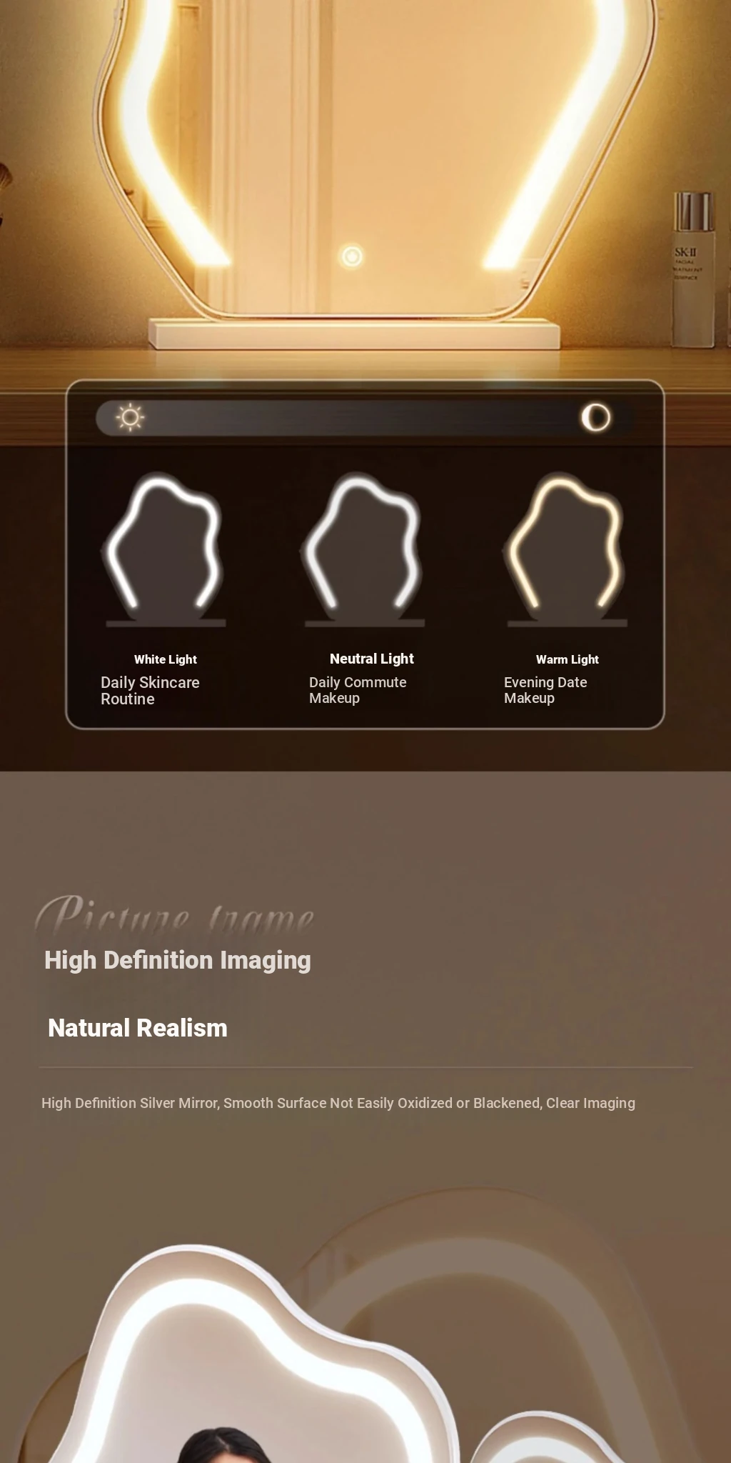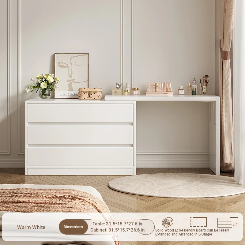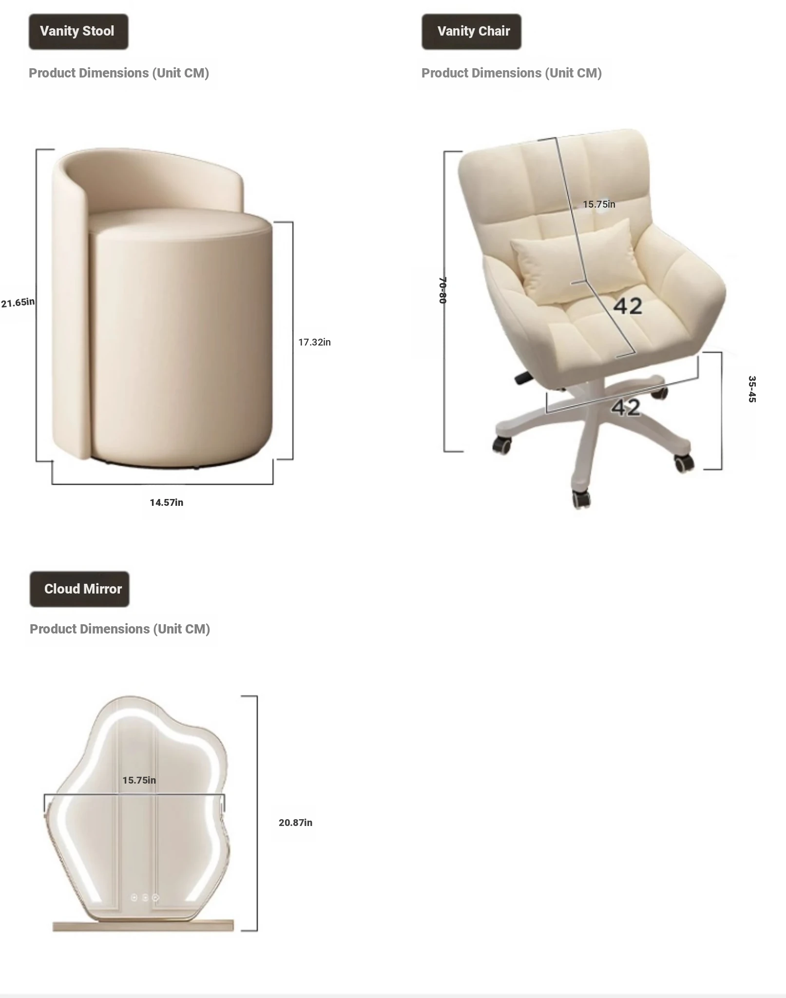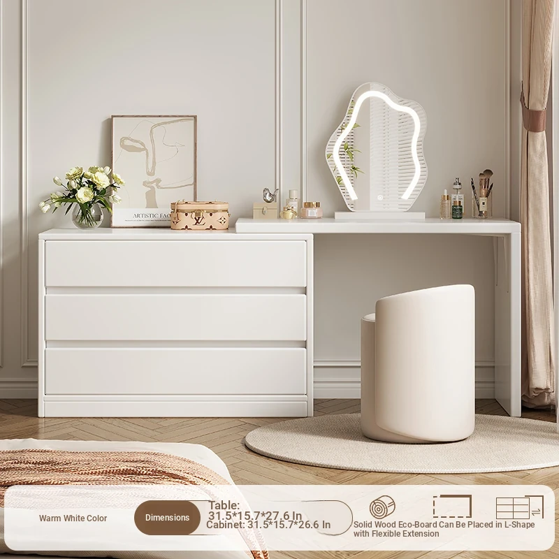 【Thickened Solid Wood Eco-Panel】80Cm Desk + 31.50in Three-Drawer Chest + Cloud Mirror + Vanity Stool, Warm White