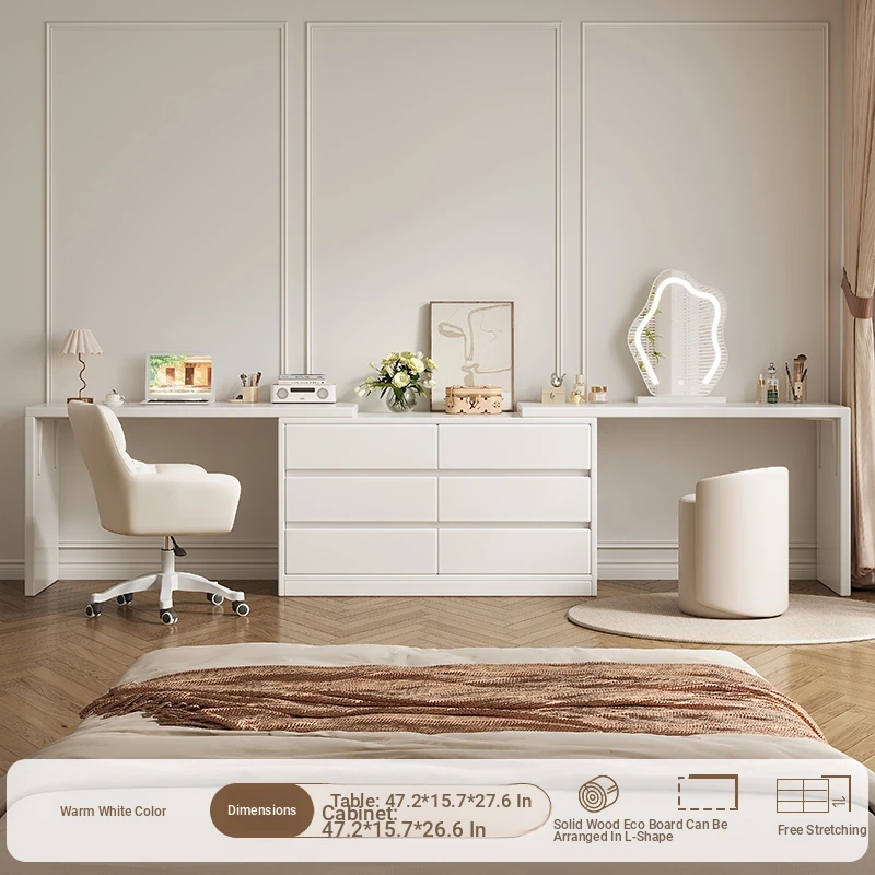 【Thickened Solid Wood Eco-Panel】120Cm Desk * 2 + 47.24in Six-Drawer Cabinet + Cloud Mirror + Vanity Stool + Computer Chair, Warm White