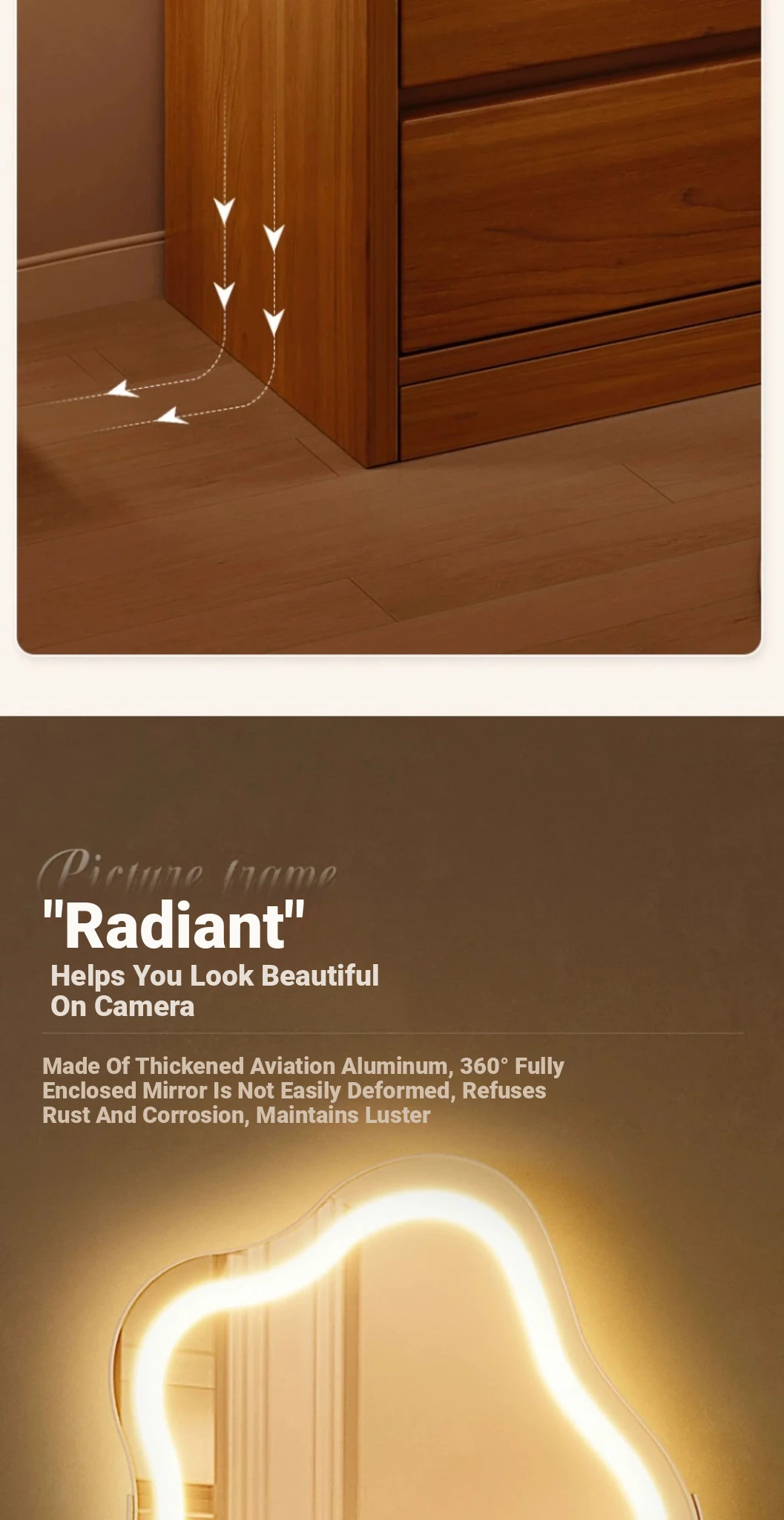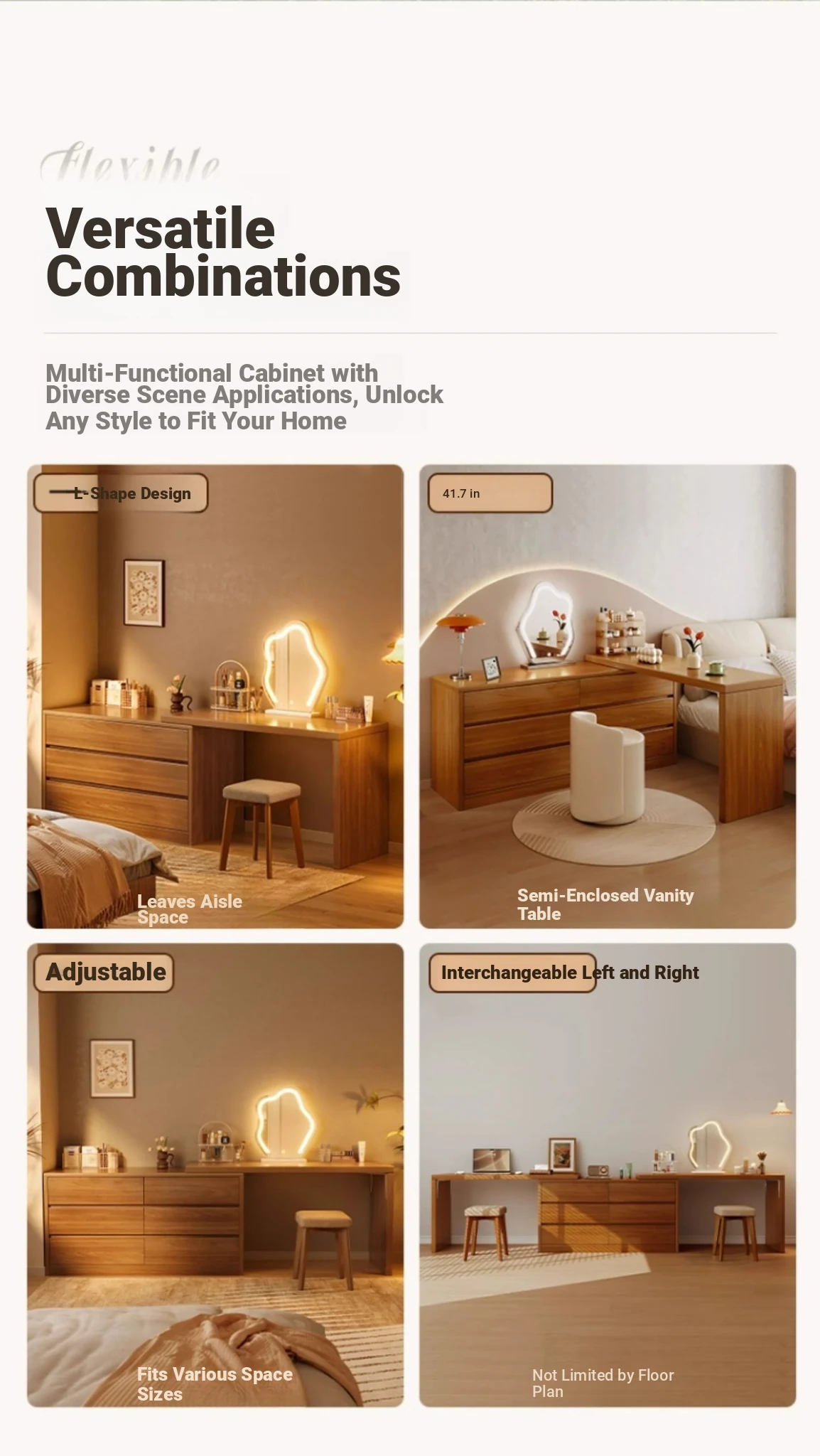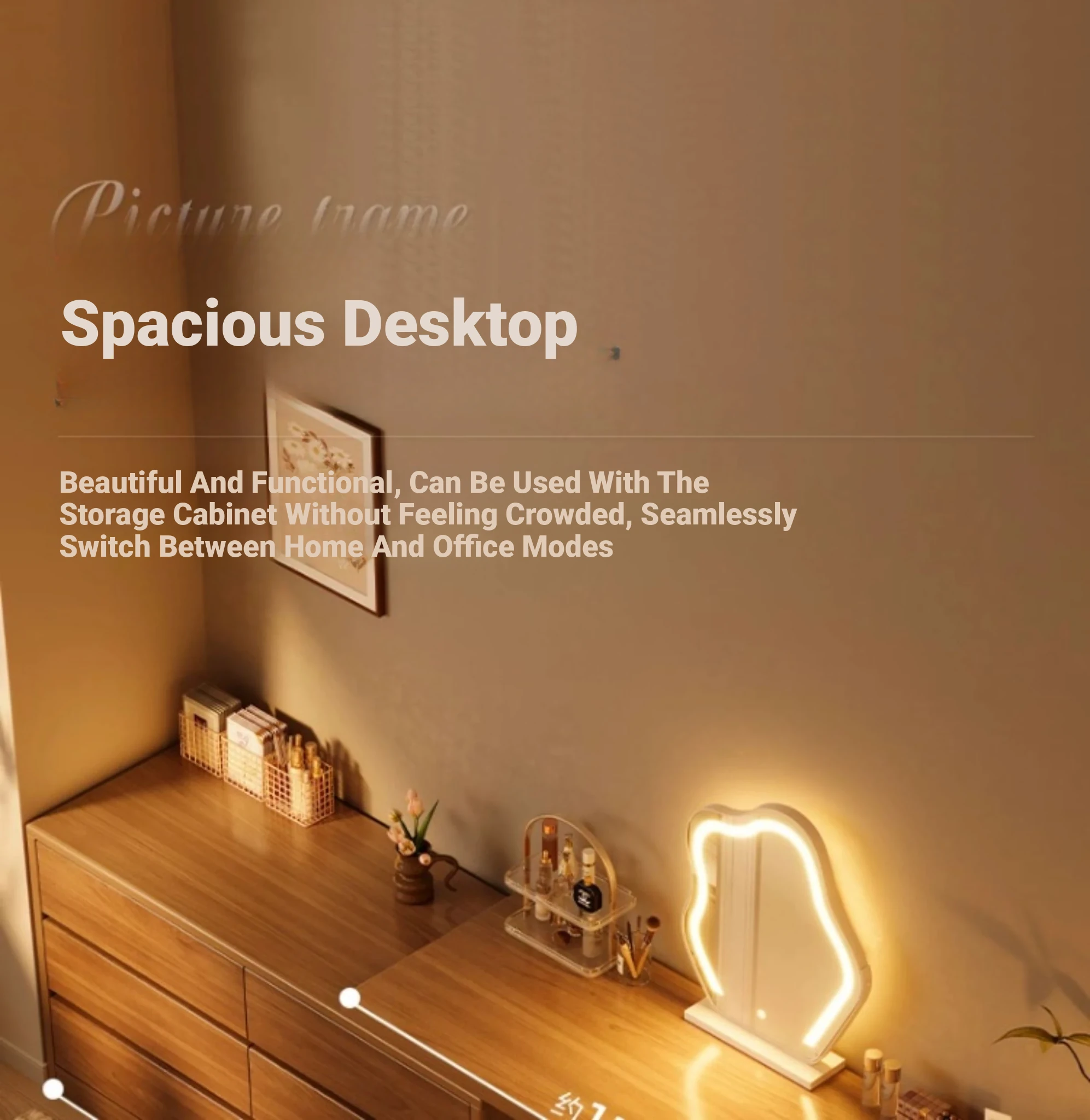 【Thickened Solid Wood Eco-Panel】100Cm Desk + 39.37in Six-Drawer Cabinet + Cloud Mirror + Vanity Stool, Warm White