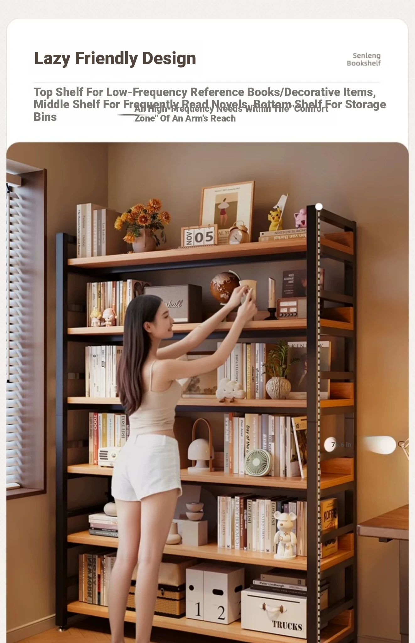 【Door-To-Door Delivery】Five-Tier Yellow Pear Wood Color Shelving Unit 【Dimensions: Length 39.37in * Width 12.60in * Height 159Cm】Reinforced 0.79in Tubing, Adjustable Shelf Height