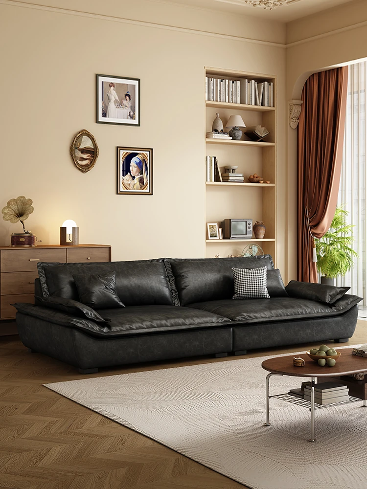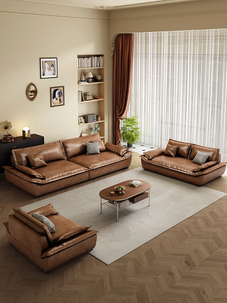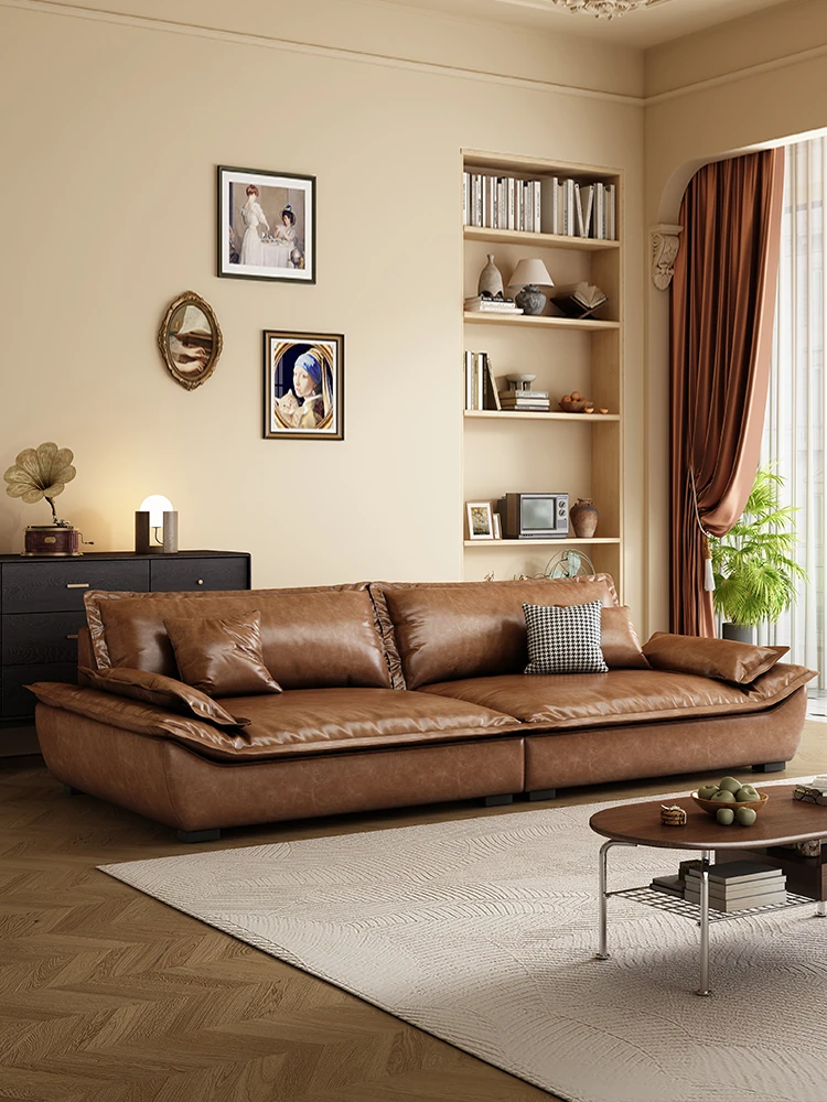 Vintage Style Genuine Leather Sofa - Luxurious Retro American Distressed Oil Wax Finish, Elegant Straight-line Design for Living Room, Multi-layer Sailboat Pattern