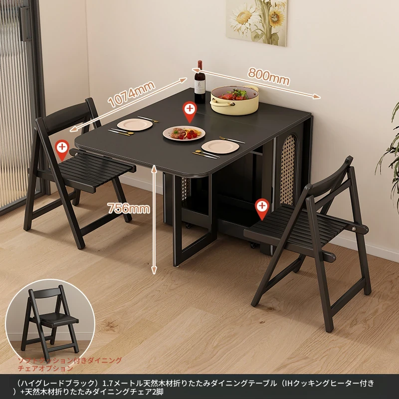 1.7メートル無垢材セラミックトップ【プレミアムブラック】+ IH調理器 + 無垢材ダイニングチェアx2