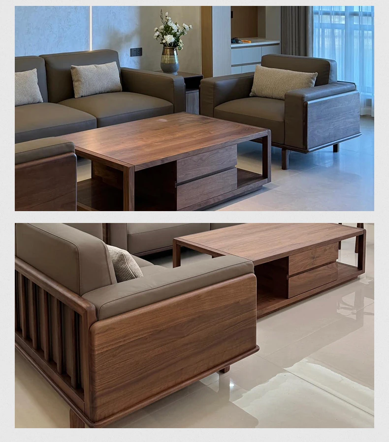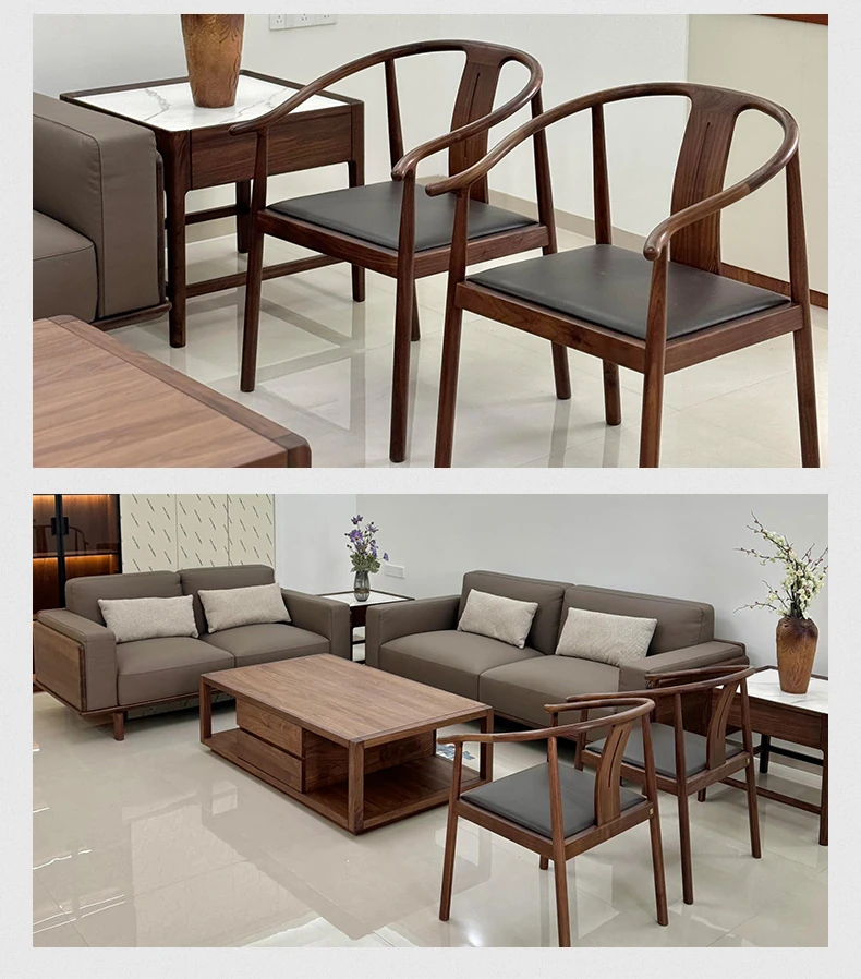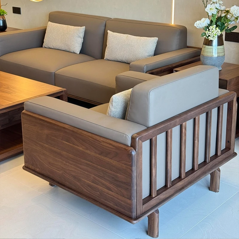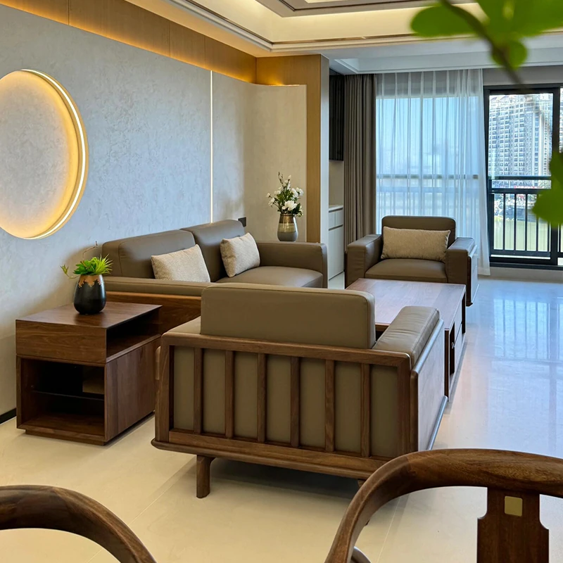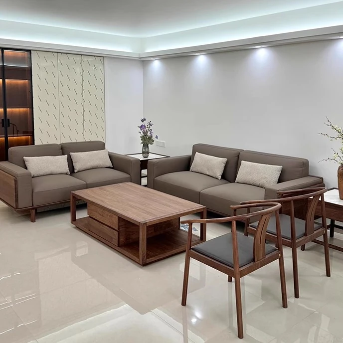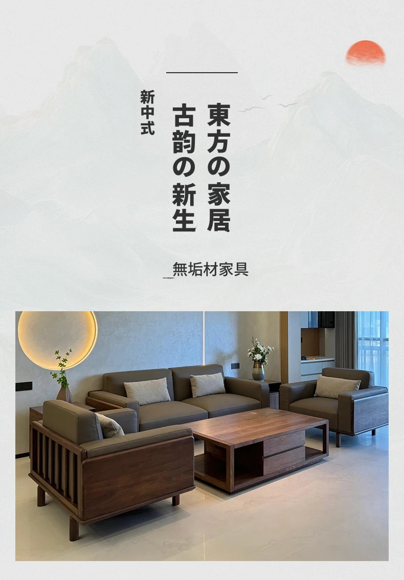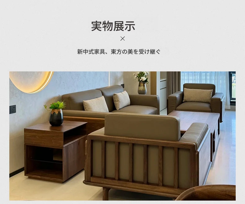 新中式スタイルの無垢材ソファ - 2025年新作!モダンでシンプルなデザイン、レザーとファブリックのコンビネーション。狭い部屋にもぴったりの家庭用ソファ。快適さとスタイルを両立させた理想のリビング空間を実現!