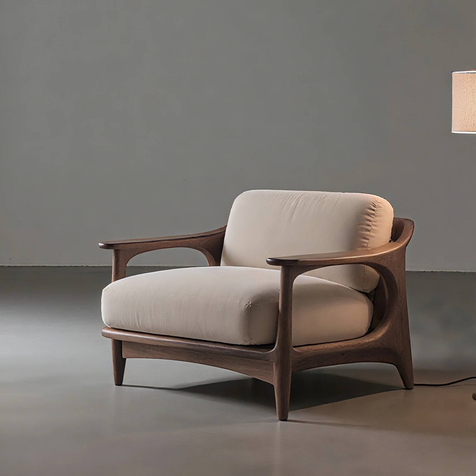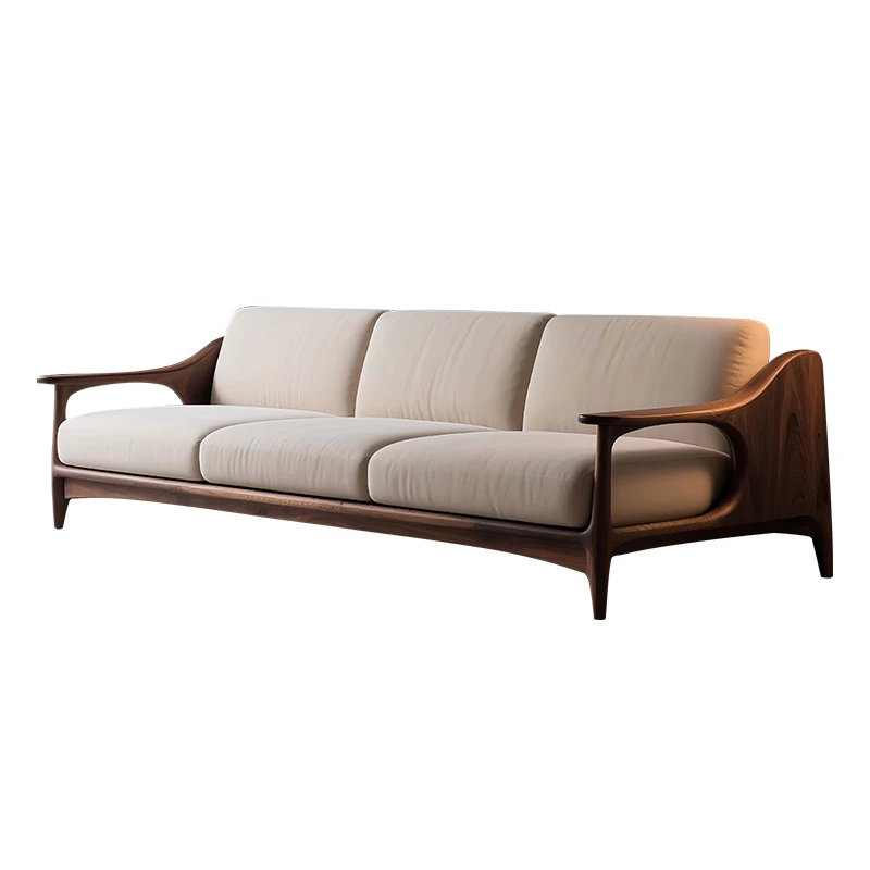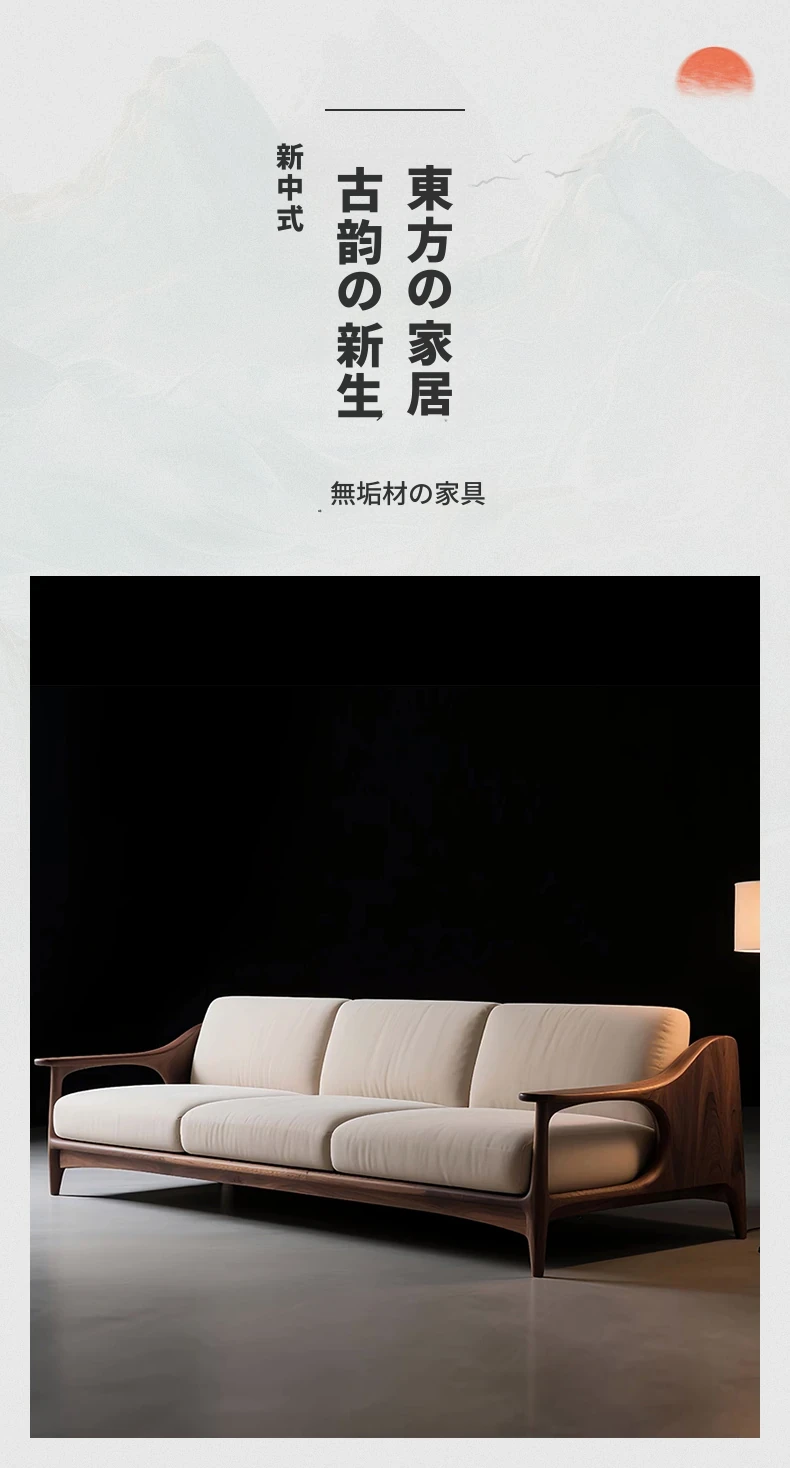 2025年新作!高級感あふれる中式ウォールナット無垢材ソファ - モダンでシンプルなデザイン、リビングにぴったりな侘び寂び風の布製ソファ。心地よい空間を演出します!