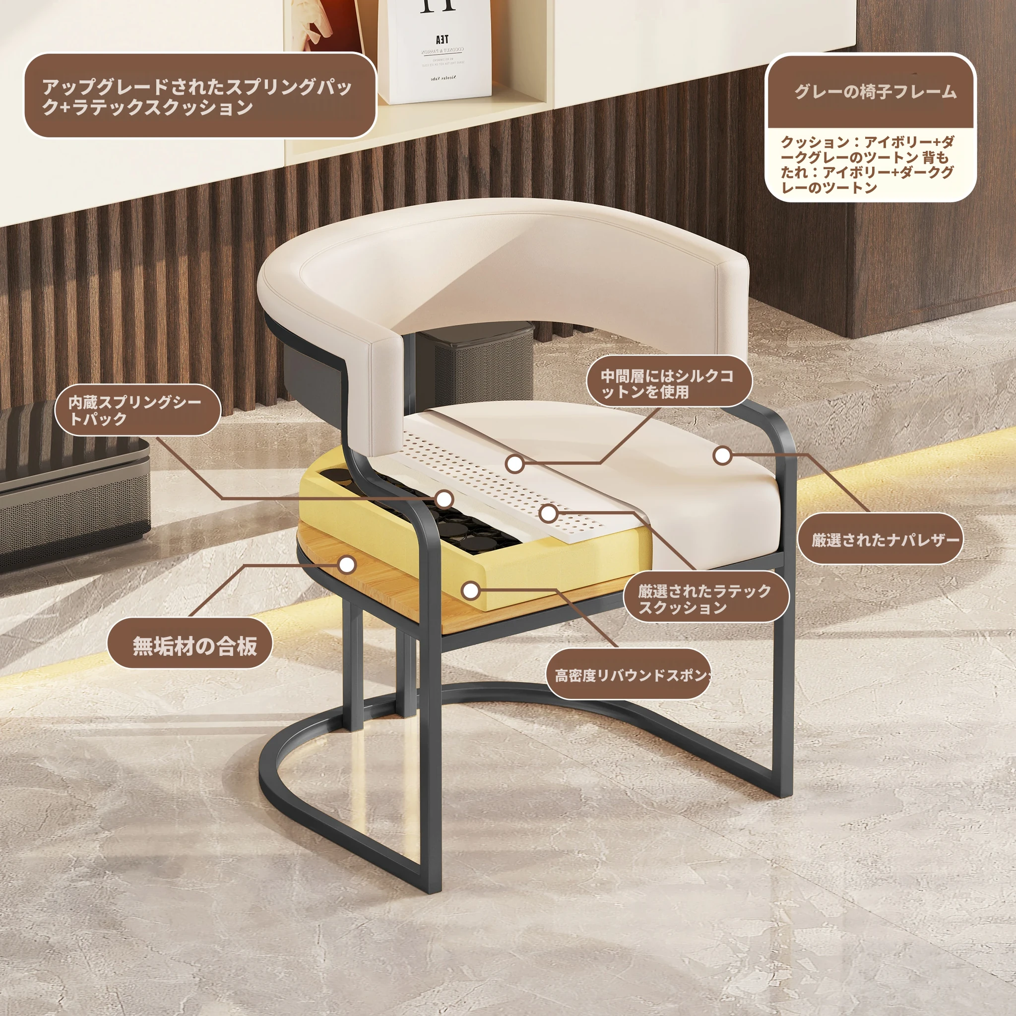 アイボリー+ダークグレー【アップグレードクッション★グレー椅子フレーム】
