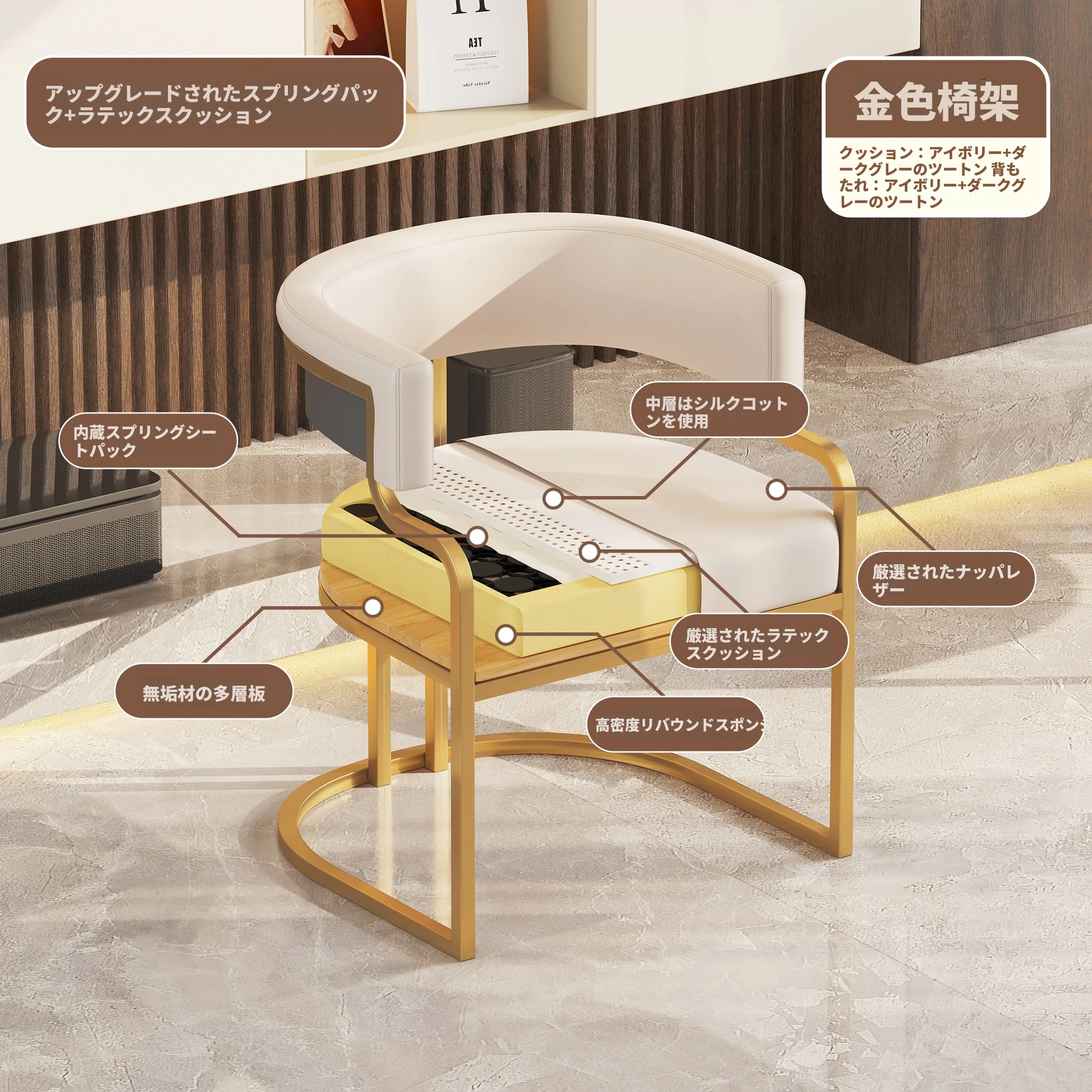 アイボリー色【アップグレードクッション★スプレー金椅子フレーム】