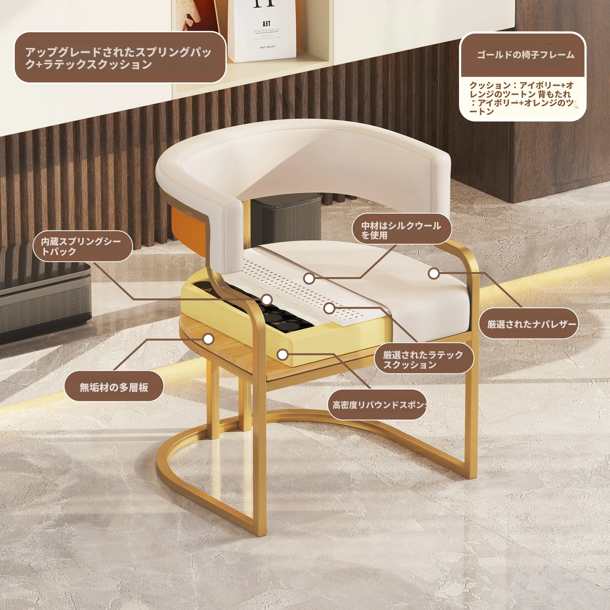 アイボリー+オレンジ色【金メッキ椅子フレーム】