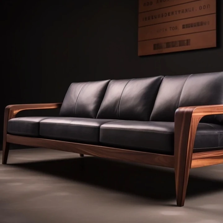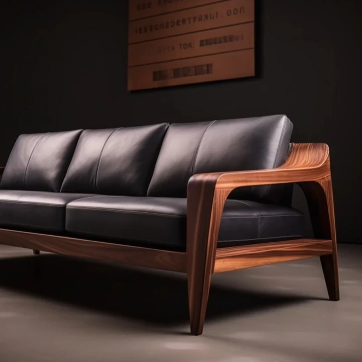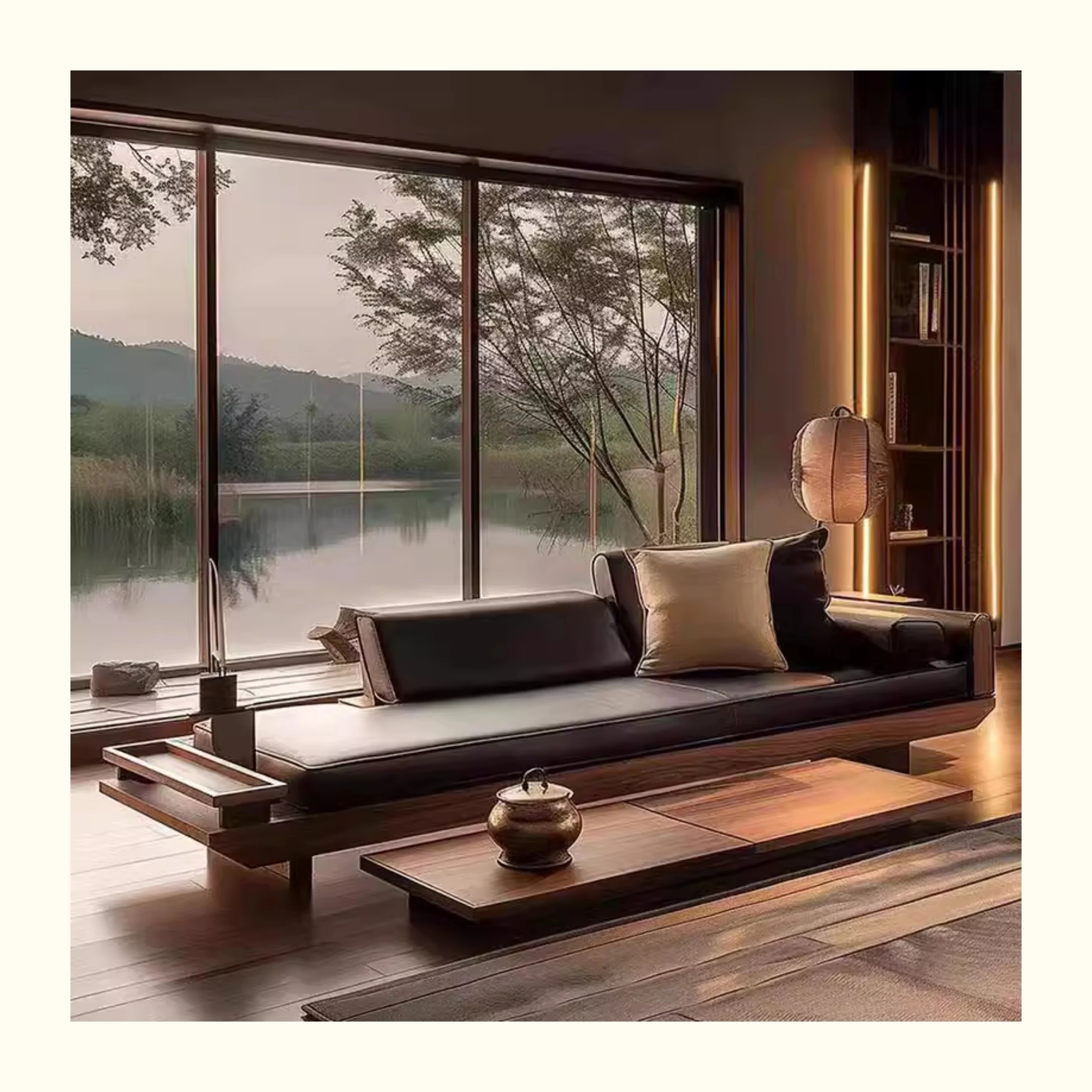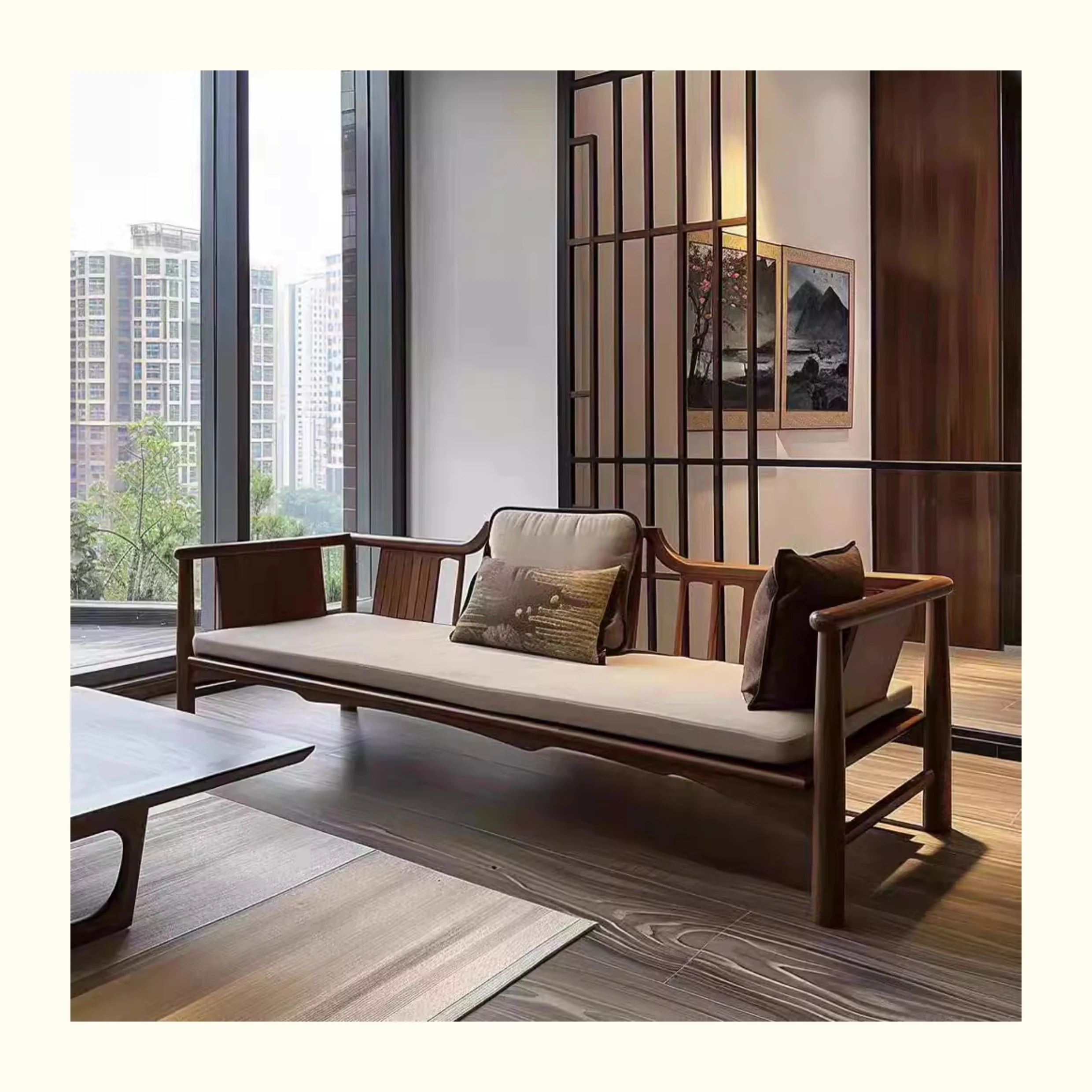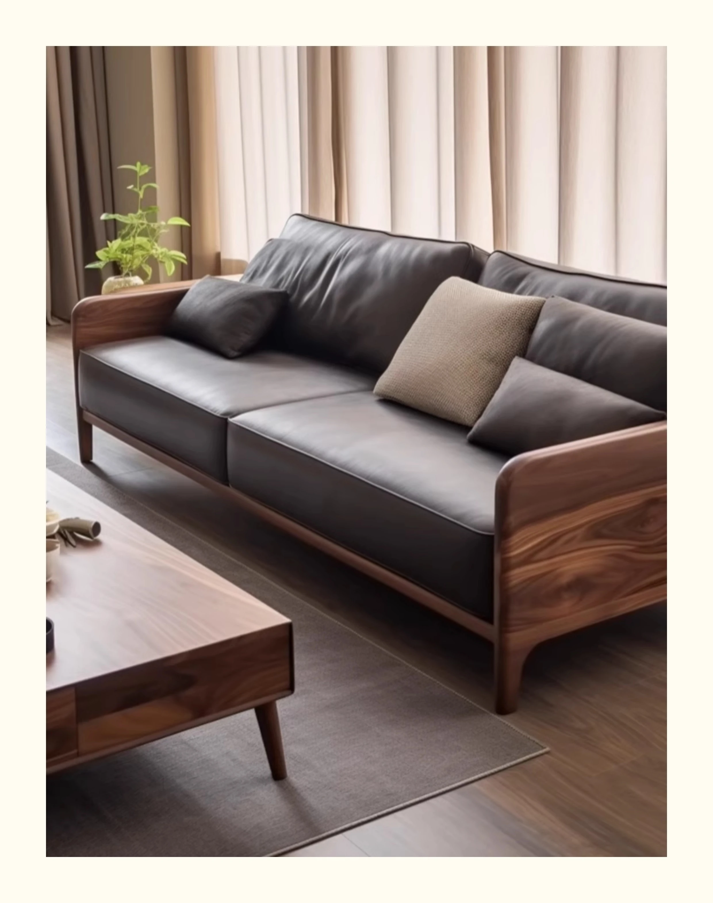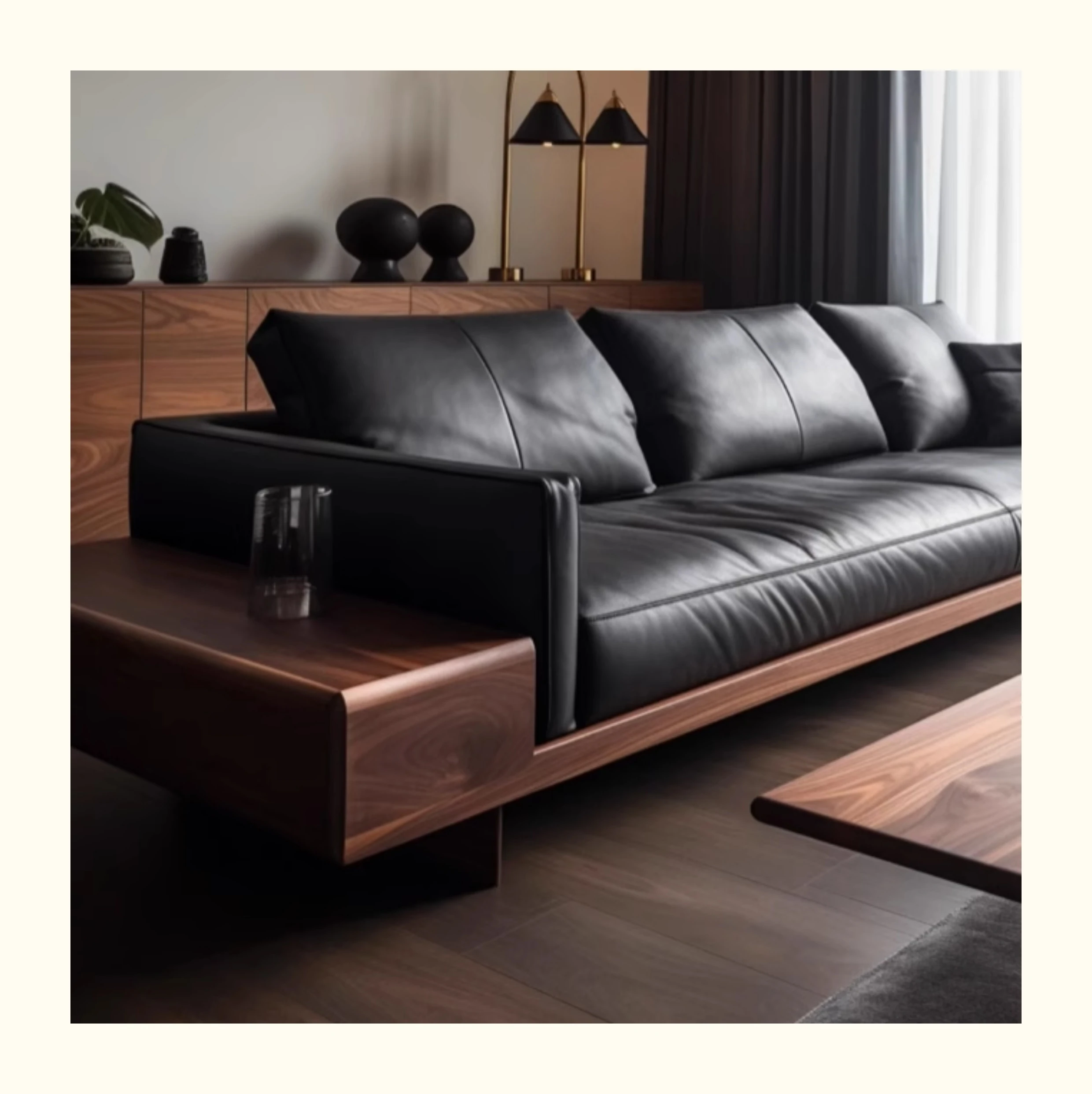 新中式ウォールナット無垢材ソファ|高級本革直置きソファ|リビングにぴったりのローハンベッドとフェイエンベッドが一体化!優雅なデザインで、心地よいリラックスタイムをお届けします。