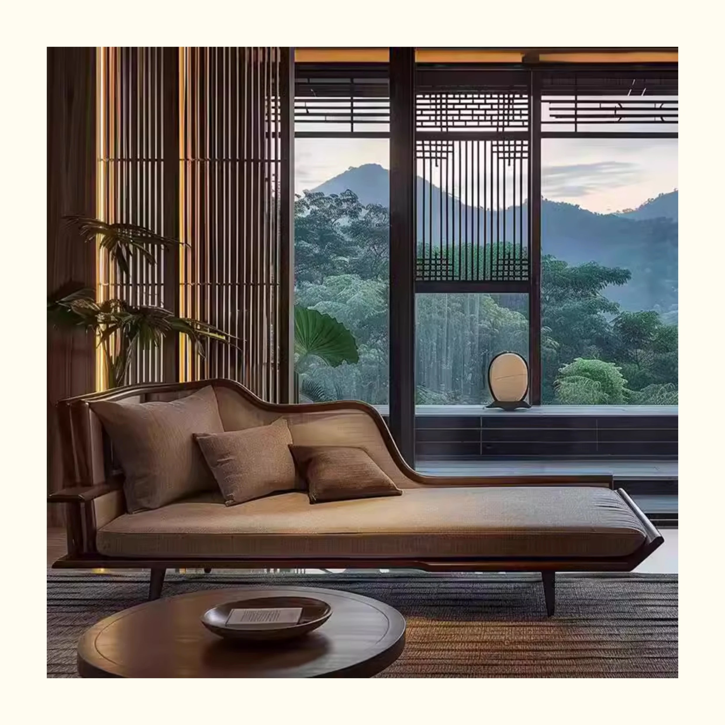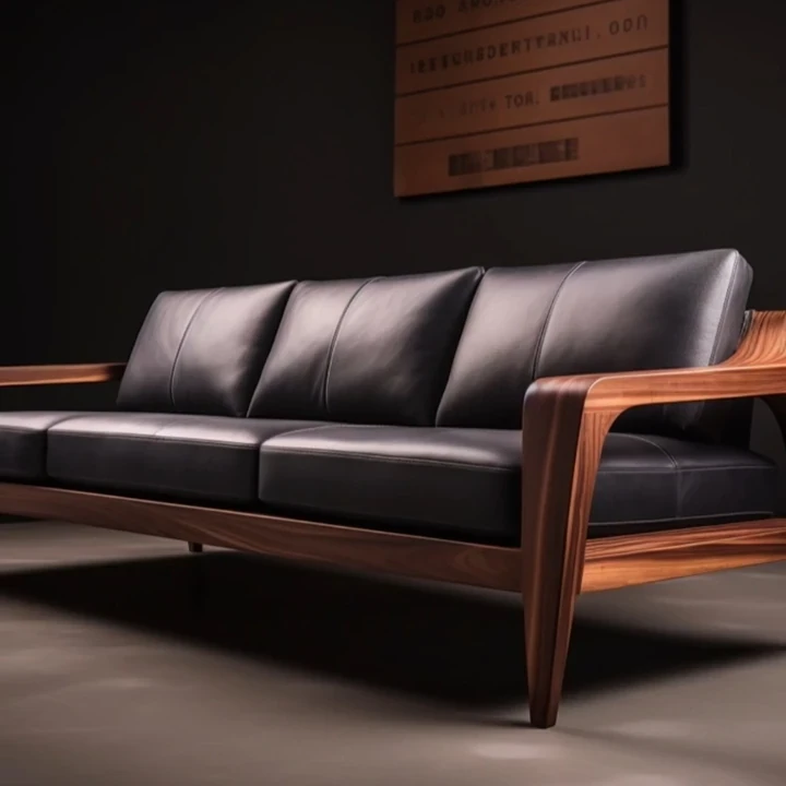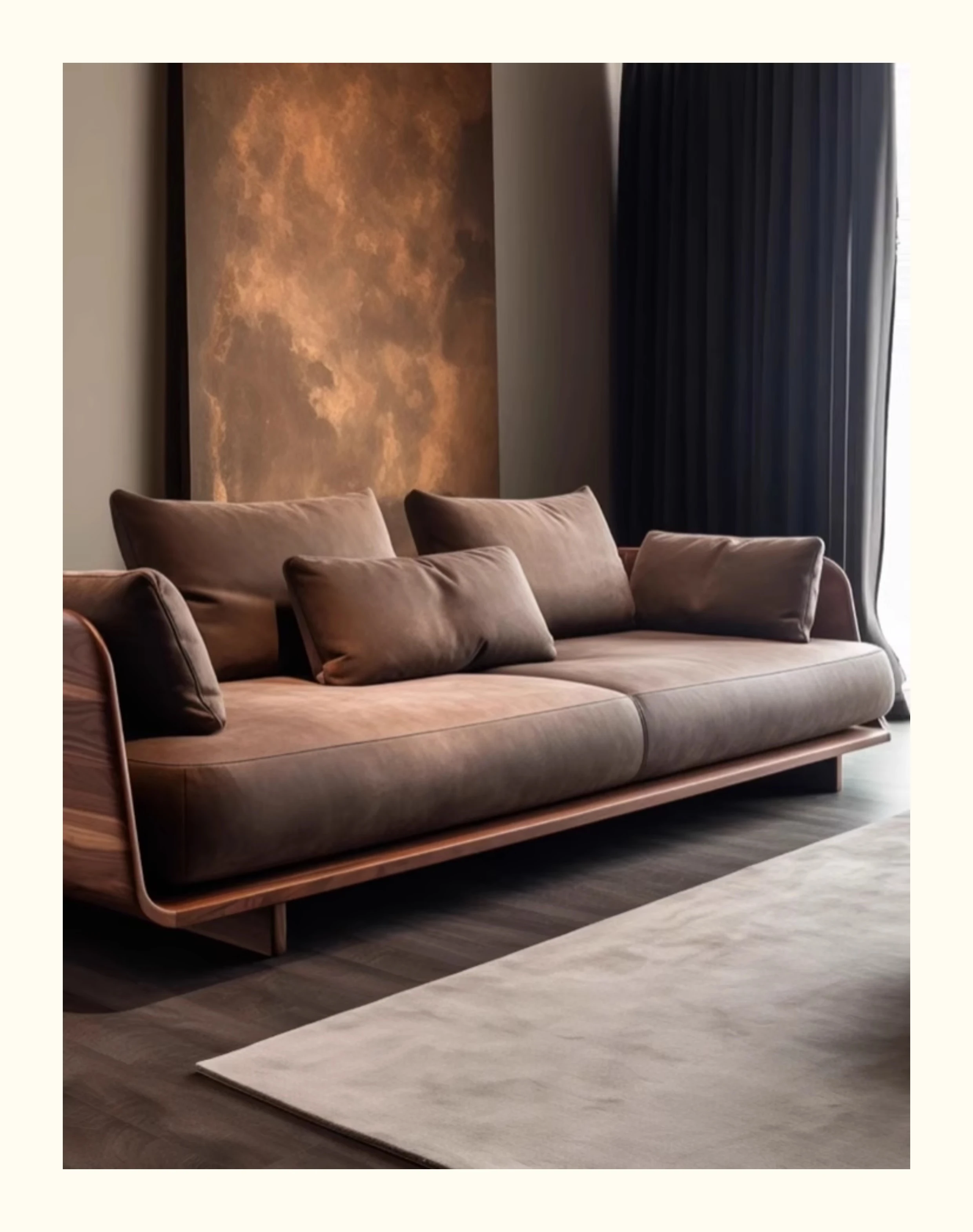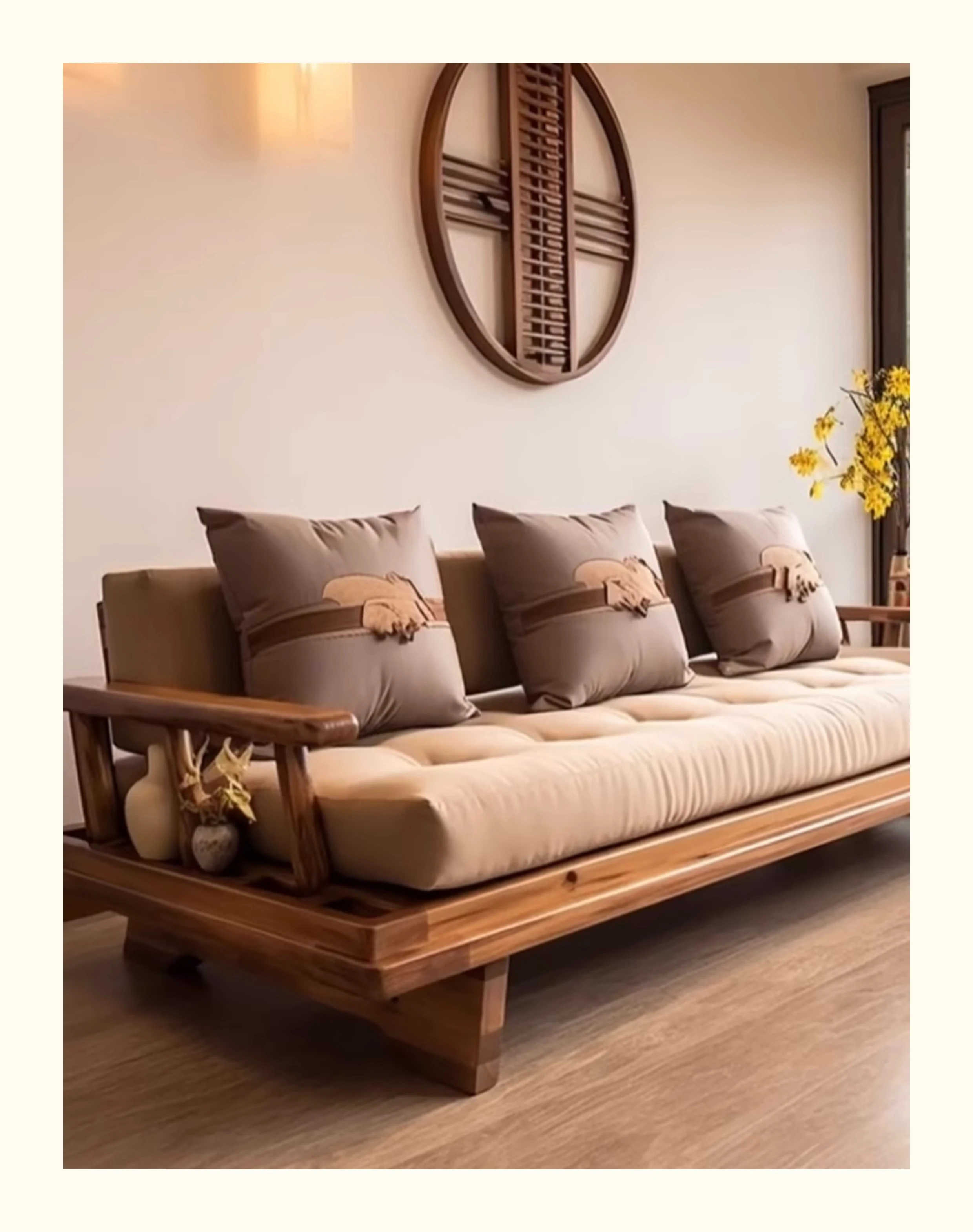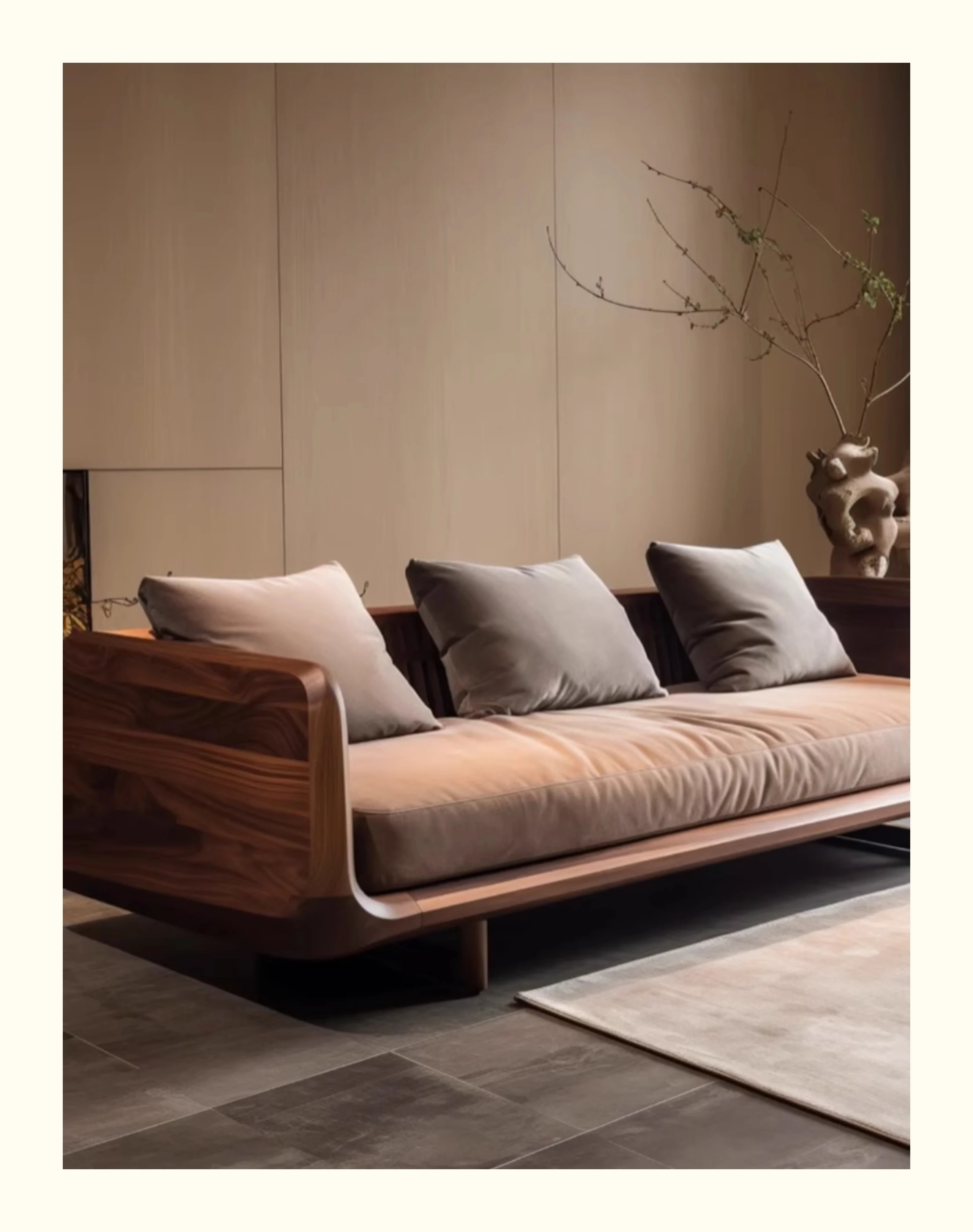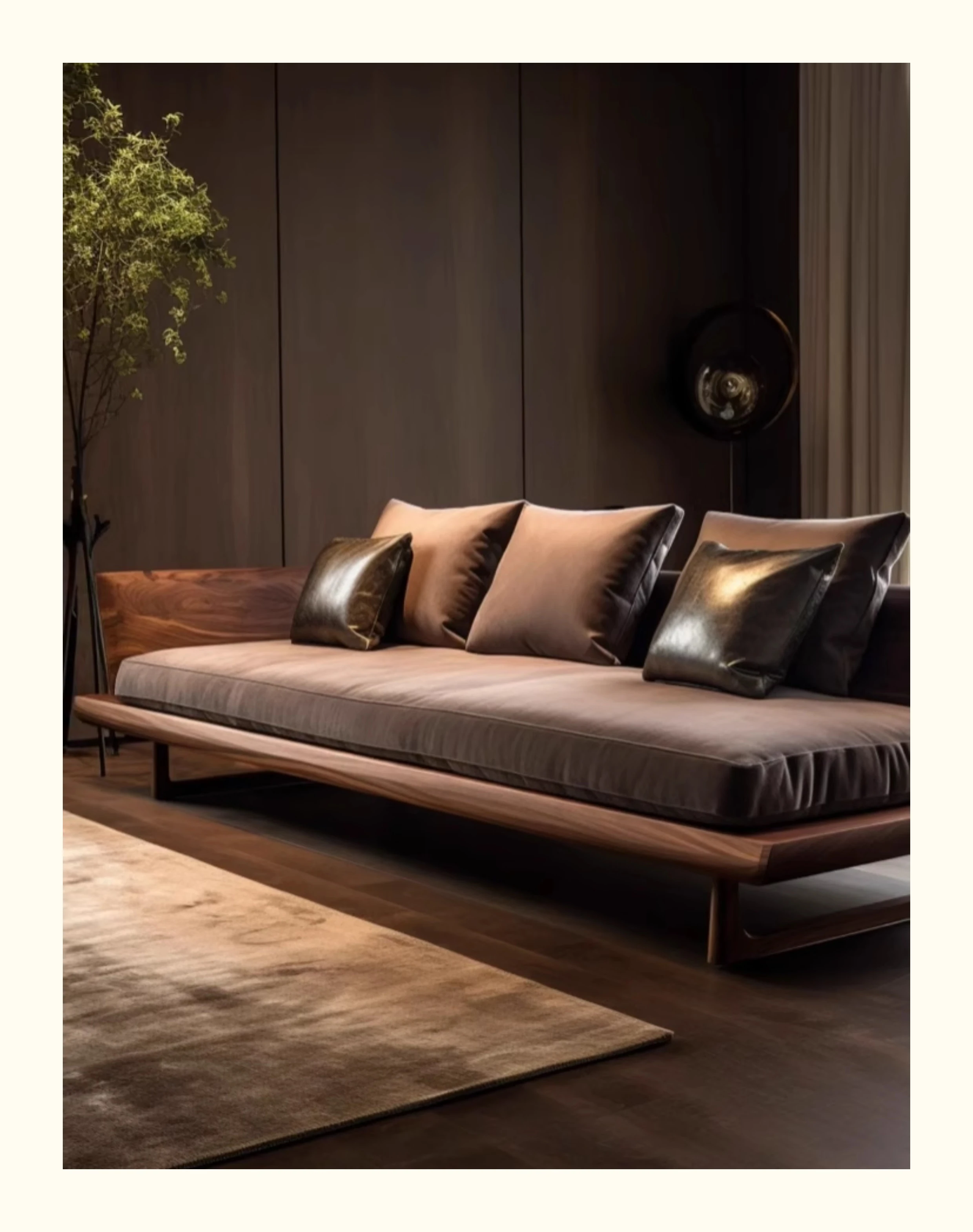 新中式ウォールナット無垢材ソファ|高級本革直置きソファ|リビングにぴったりのローハンベッドとフェイエンベッドが一体化!優雅なデザインで、心地よいリラックスタイムをお届けします。