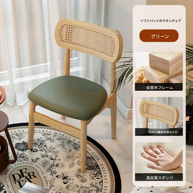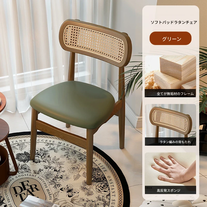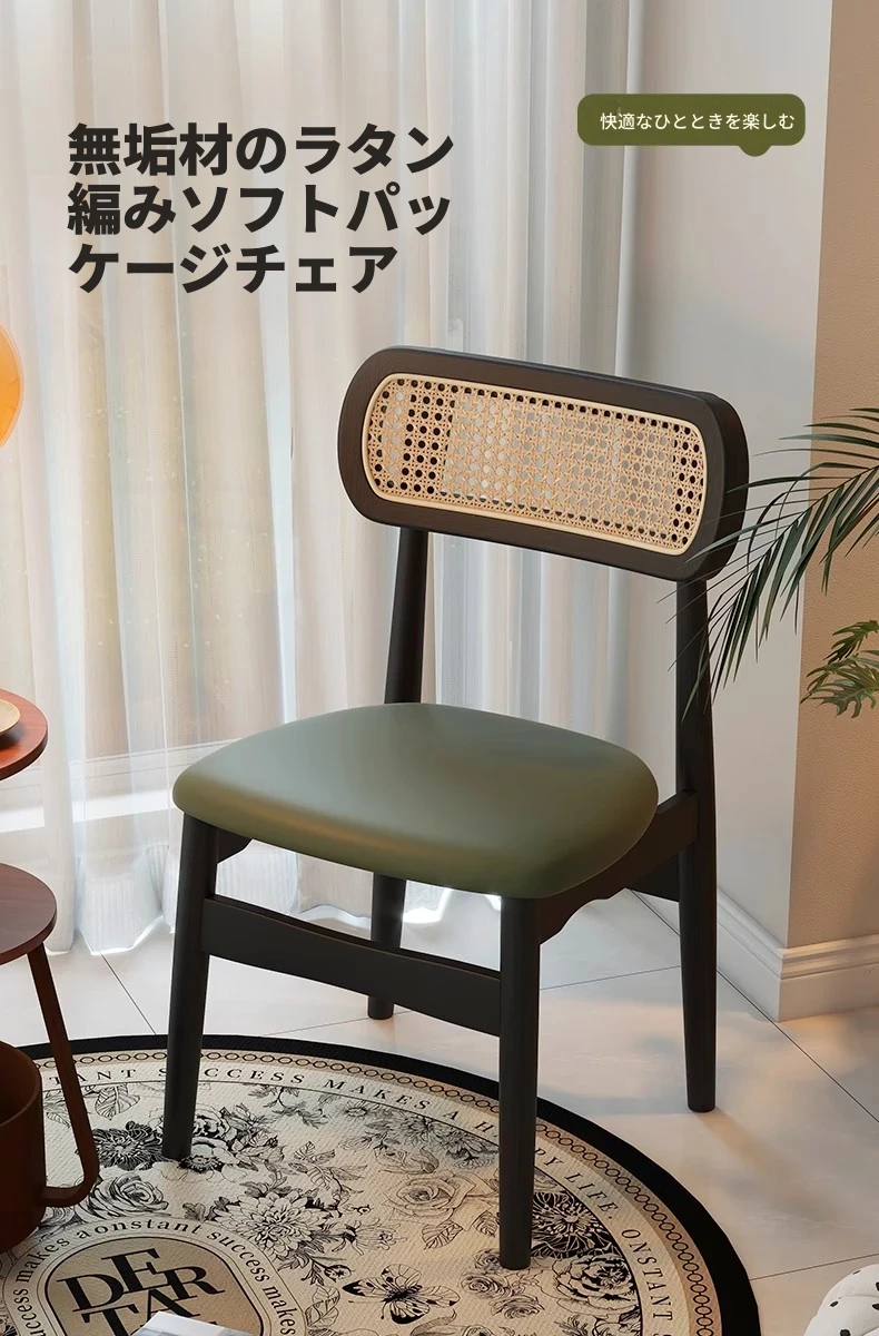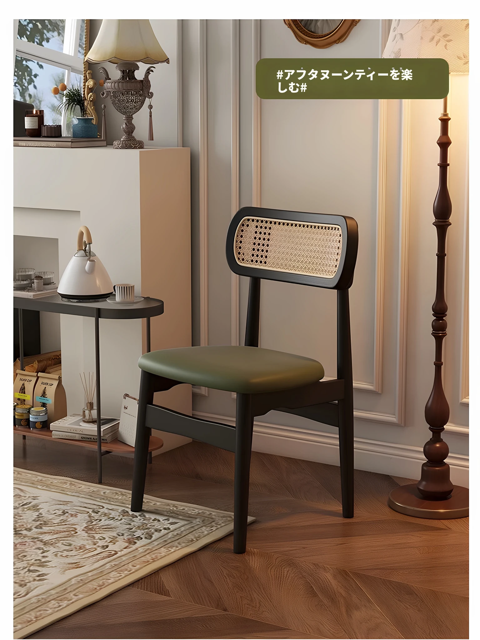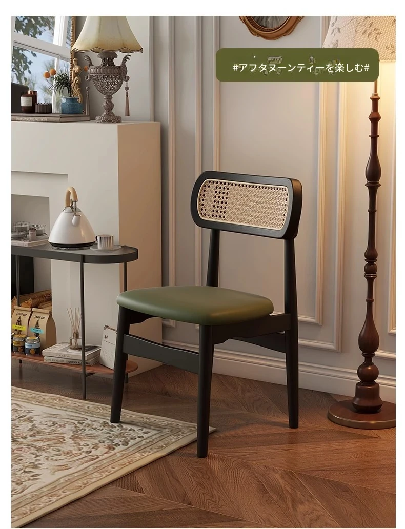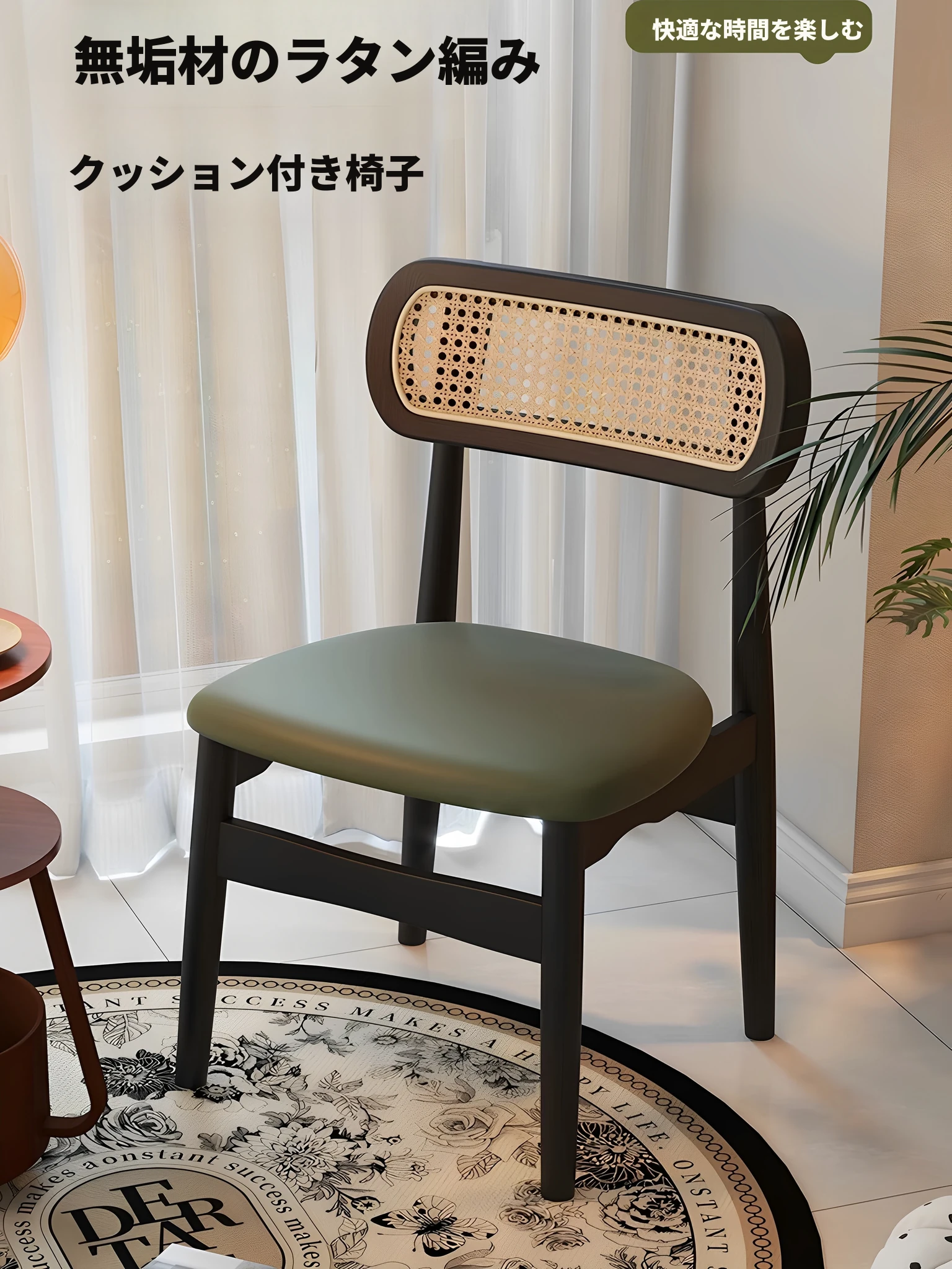 高級感漂う実木製ダイニングテーブルセット|レトロな背もたれ付きフランス風ラタン編みダイニングチェア|リラックスできる家庭用チェア|グリーンアイデザインの特別な椅子で、食事の時間をより特別に!
