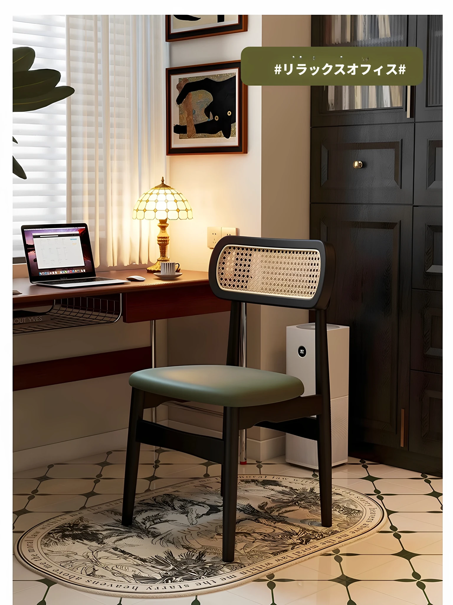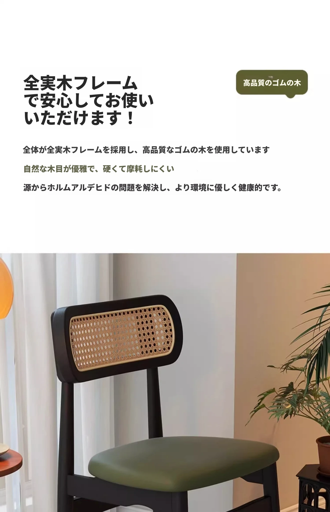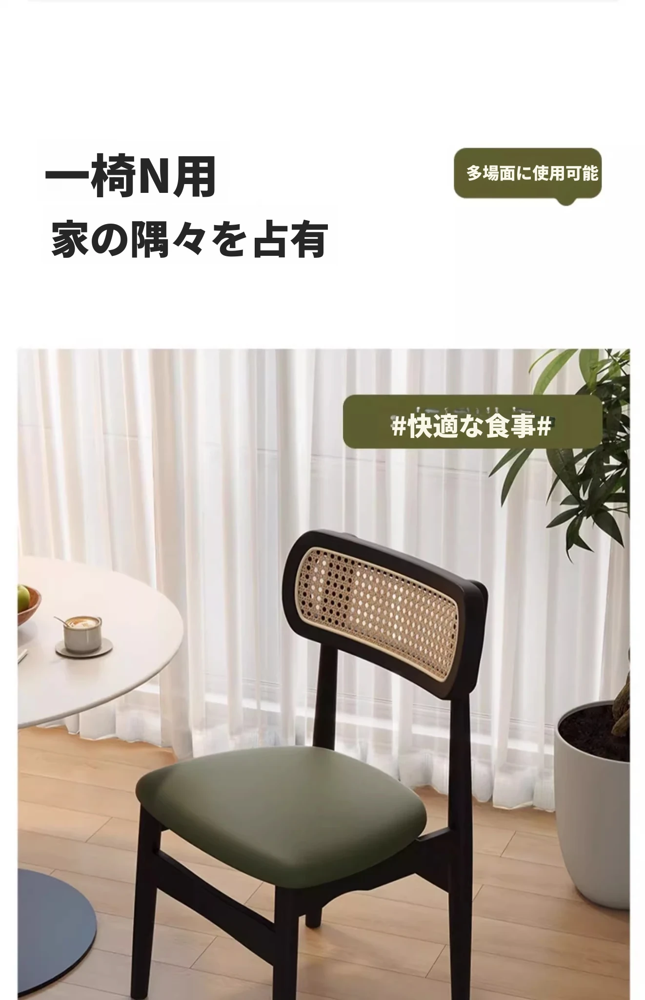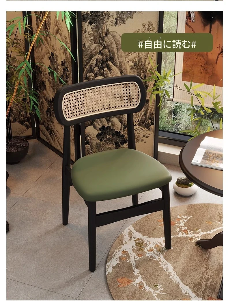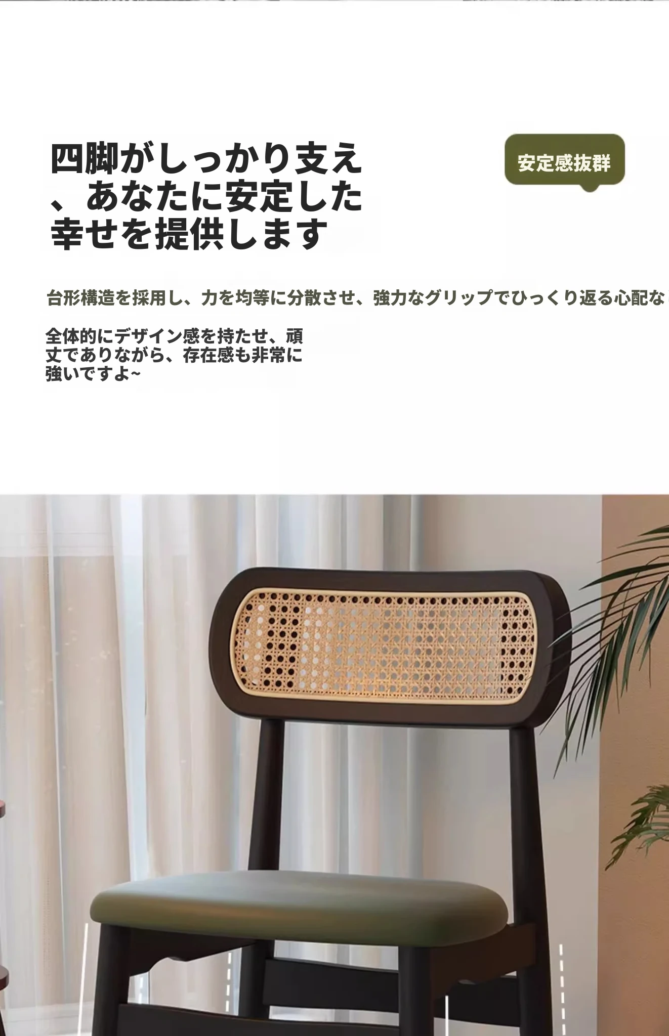高級感漂う実木製ダイニングテーブルセット|レトロな背もたれ付きフランス風ラタン編みダイニングチェア|リラックスできる家庭用チェア|グリーンアイデザインの特別な椅子で、食事の時間をより特別に!