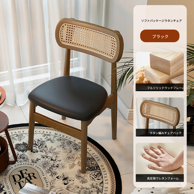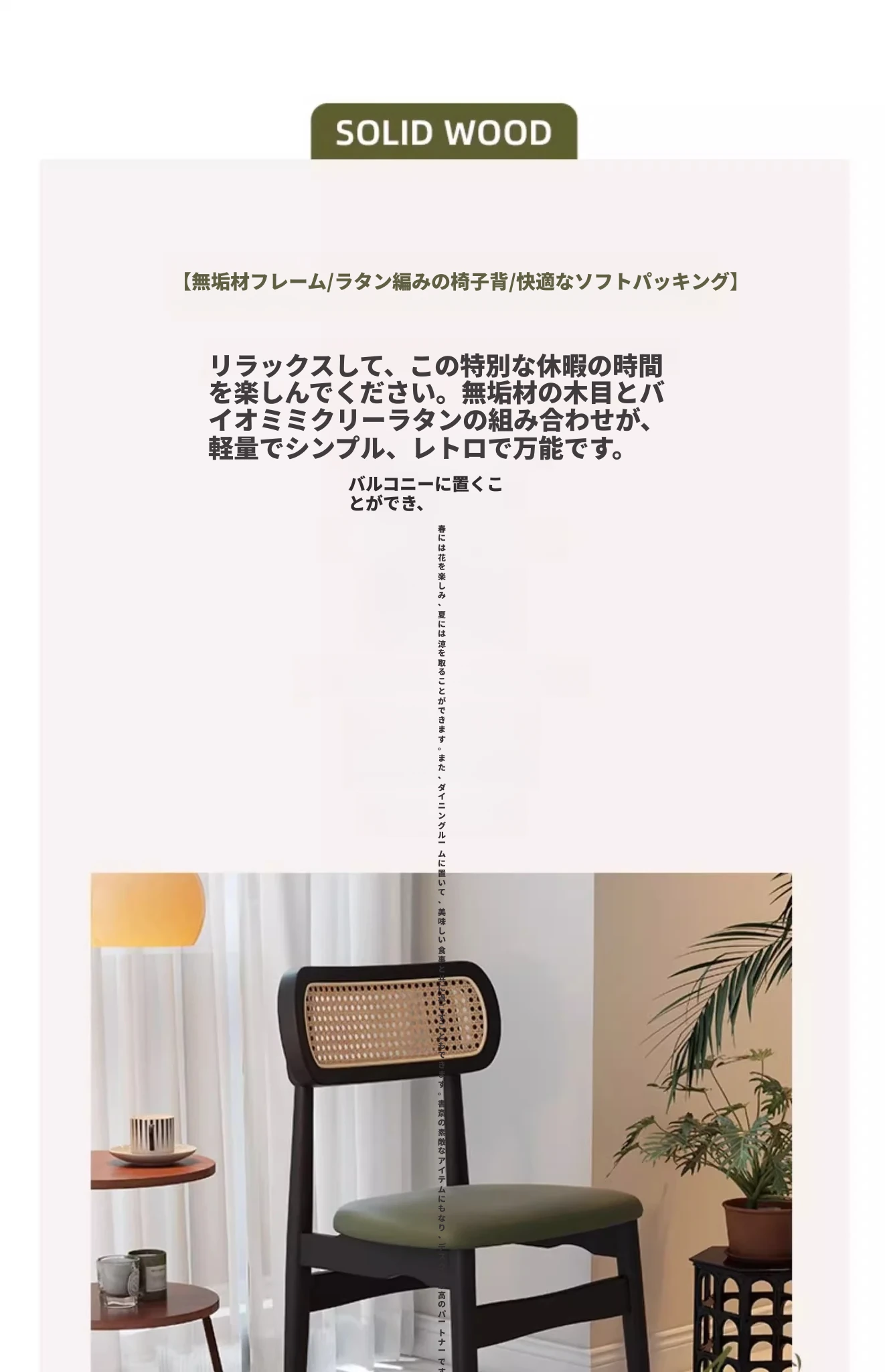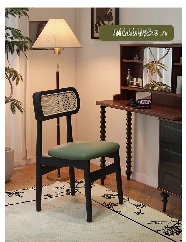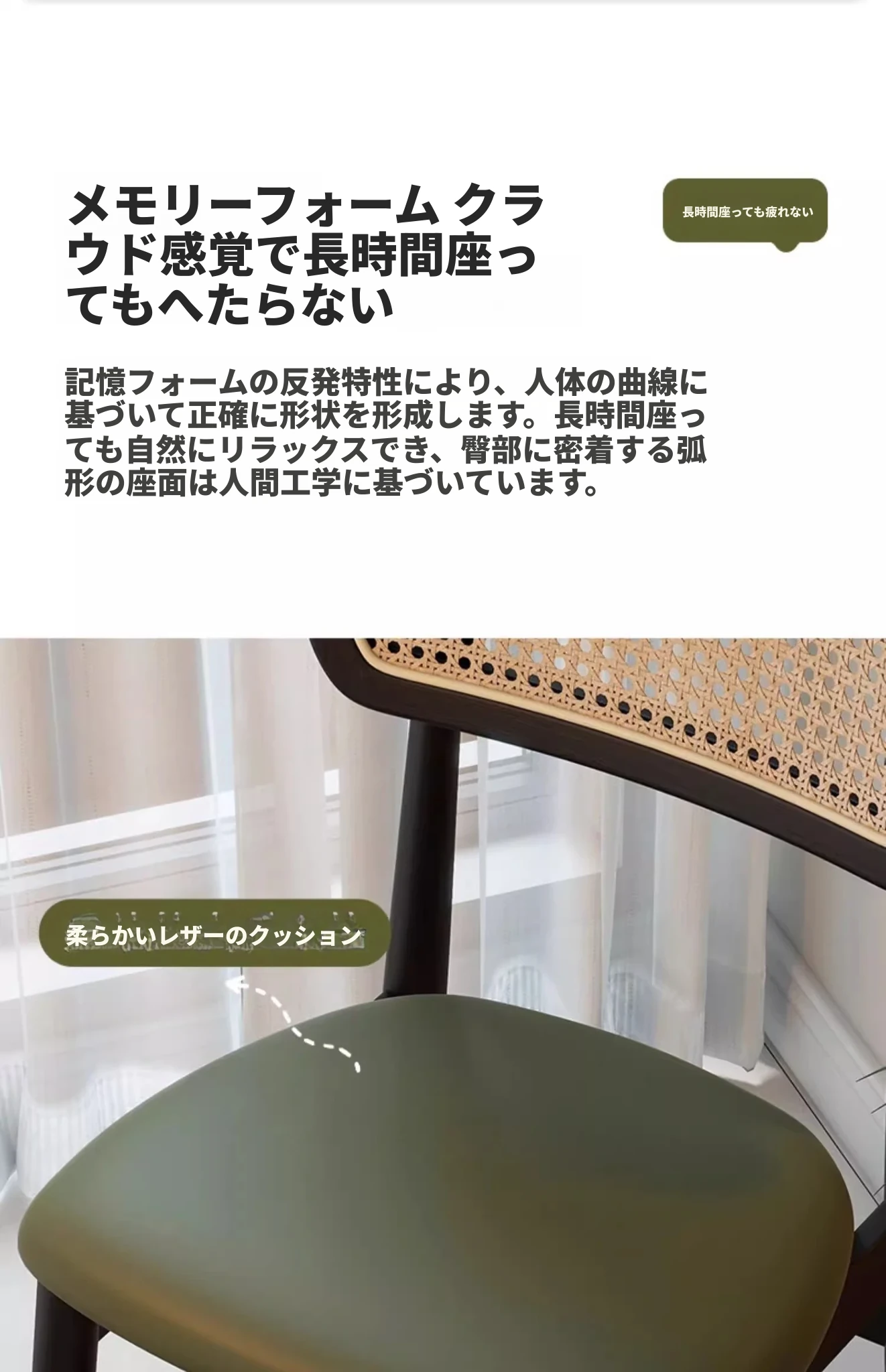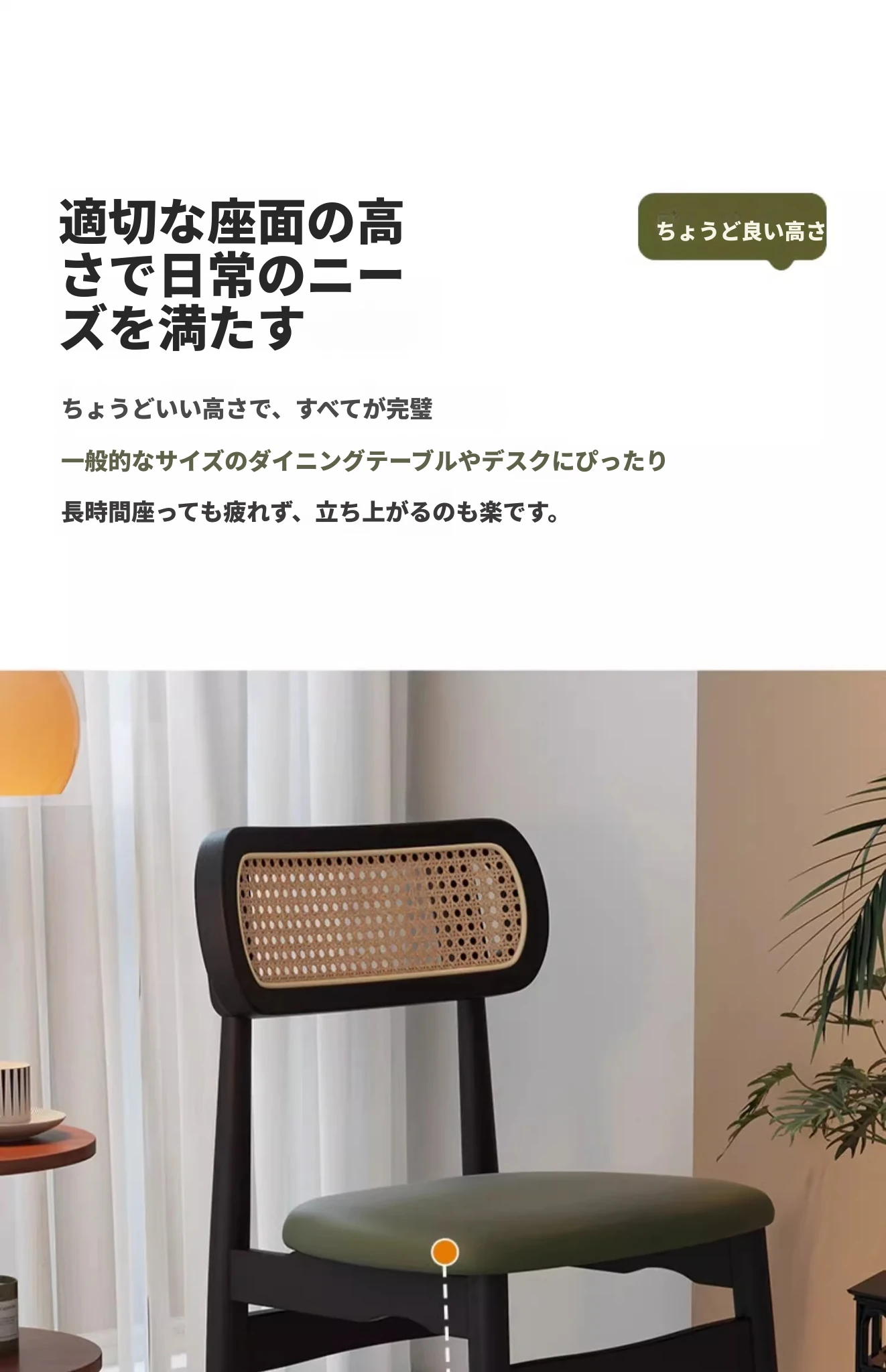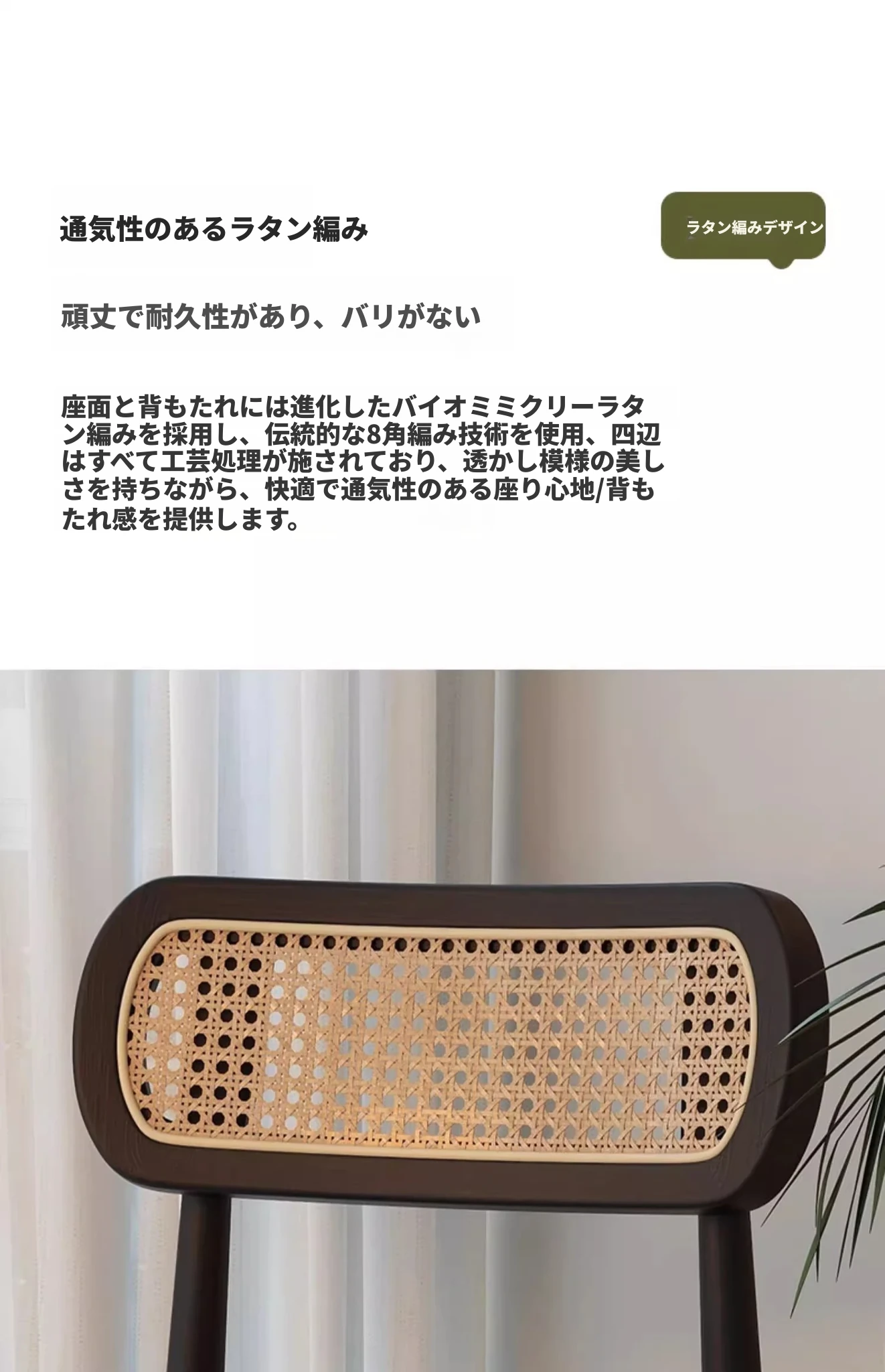 高級感漂う実木製ダイニングテーブルセット|レトロな背もたれ付きフランス風ラタン編みダイニングチェア|リラックスできる家庭用チェア|グリーンアイデザインの特別な椅子で、食事の時間をより特別に!