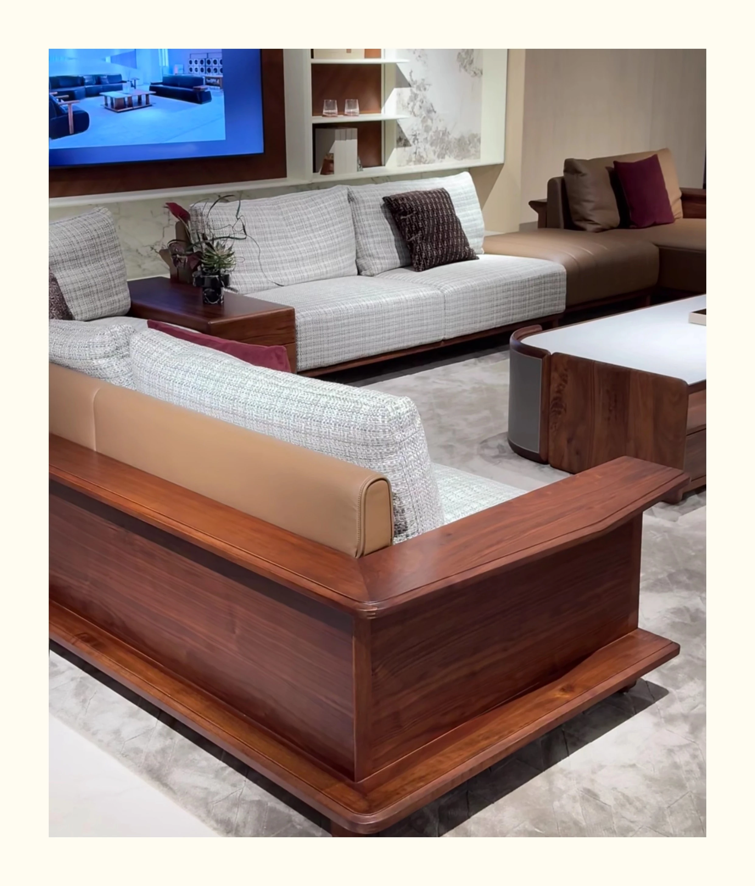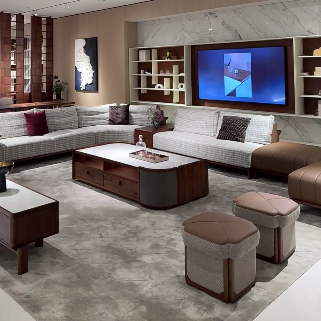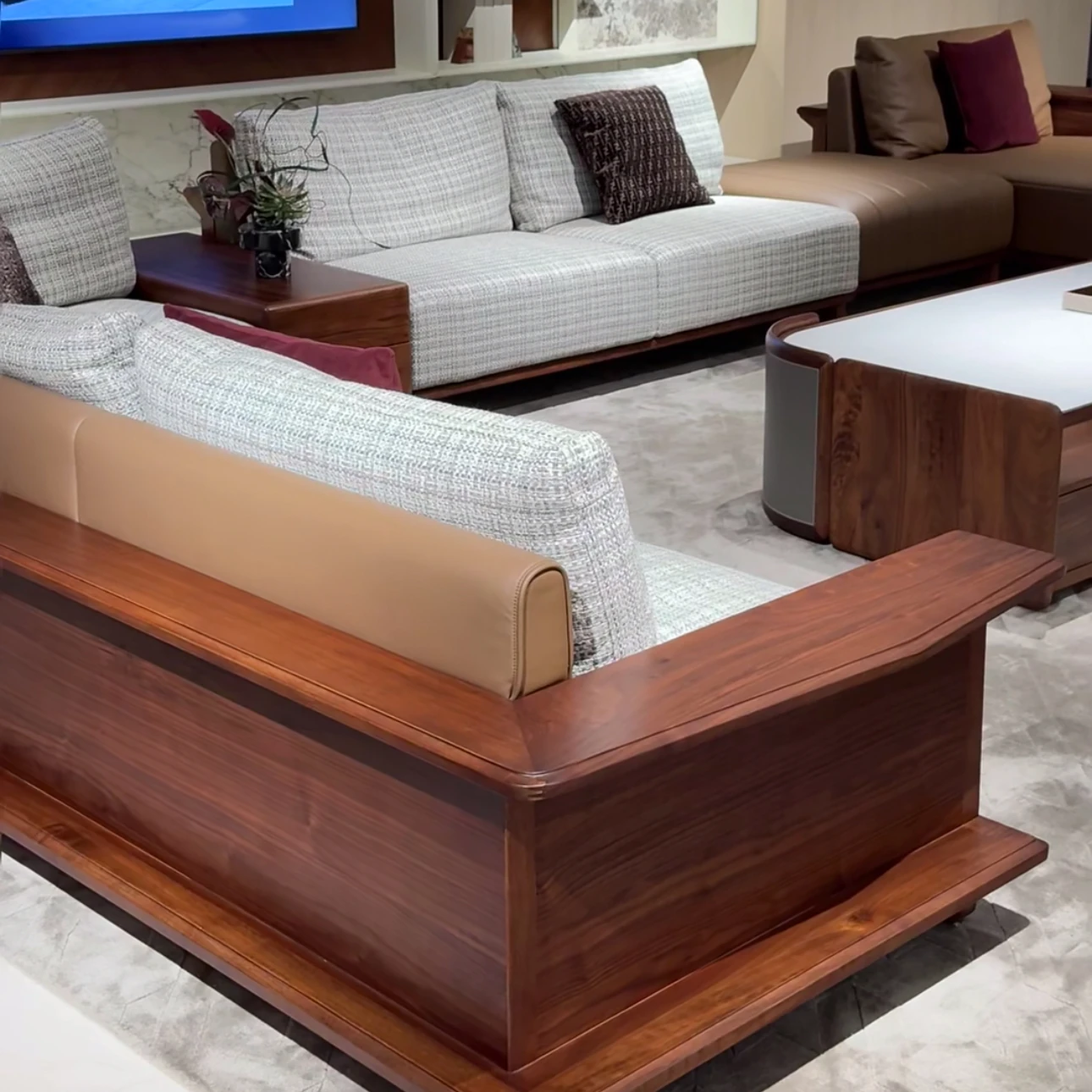 イタリアンミニマリズムの無垢材ソファセット - ヴィラやリビングにぴったりなラグジュアリーな曲線角ソファ。高級感漂うデザインで、居心地の良い空間を実現!