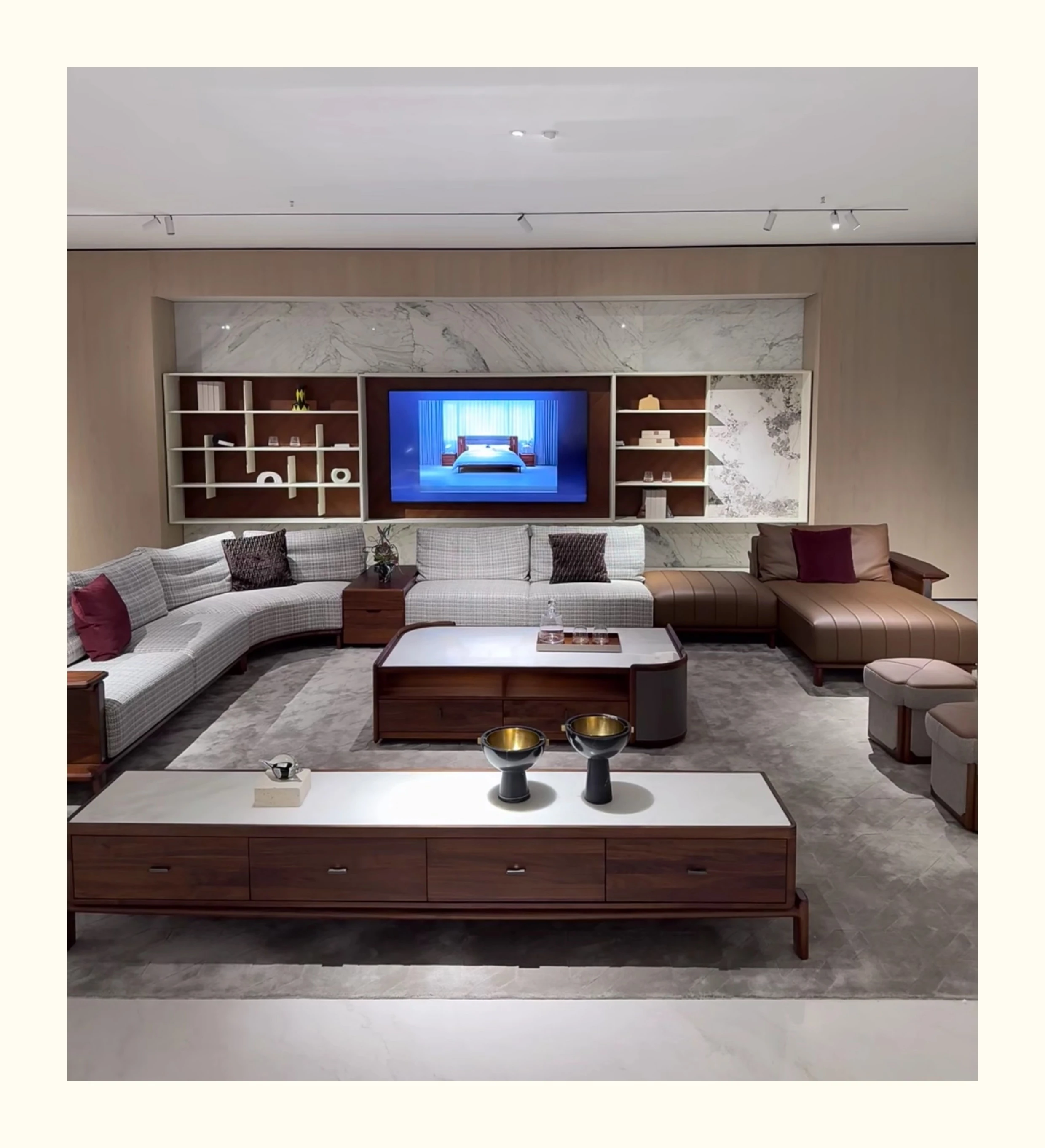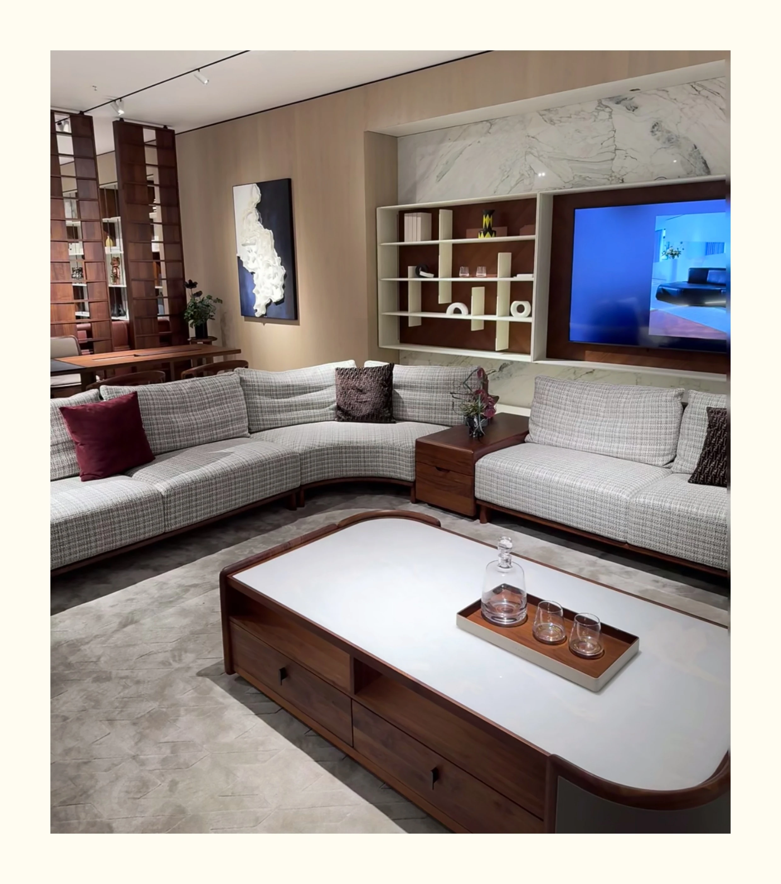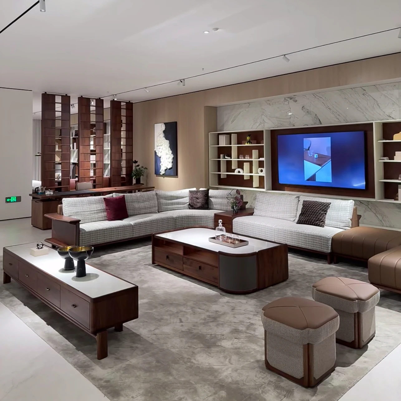 イタリアンミニマリズムの無垢材ソファセット - ヴィラやリビングにぴったりなラグジュアリーな曲線角ソファ。高級感漂うデザインで、居心地の良い空間を実現!