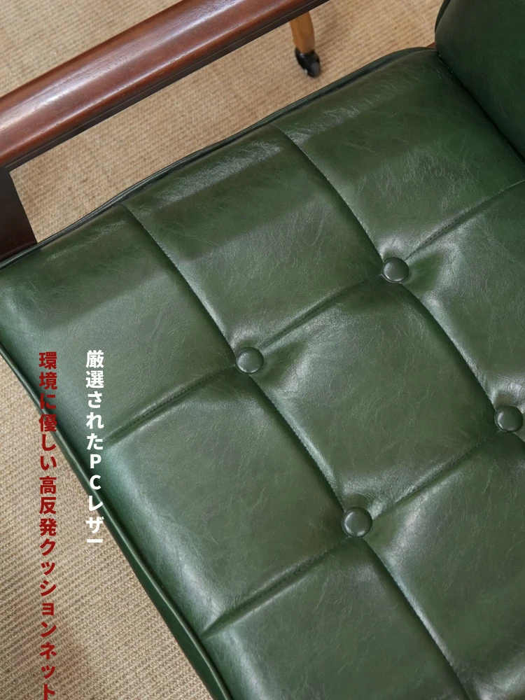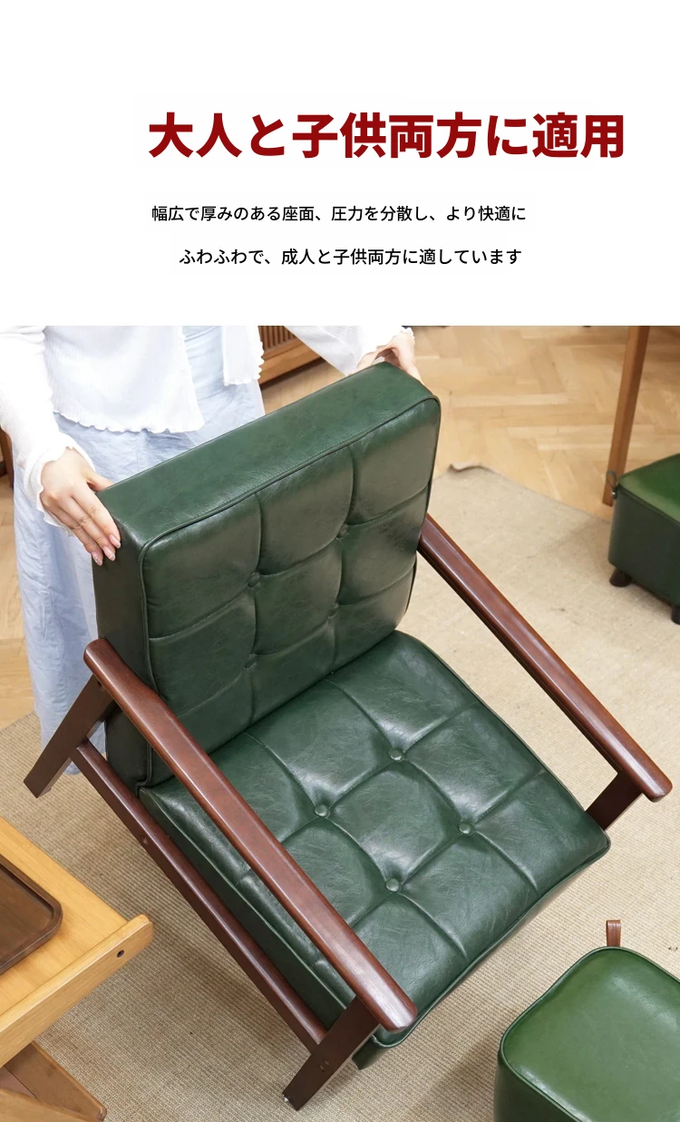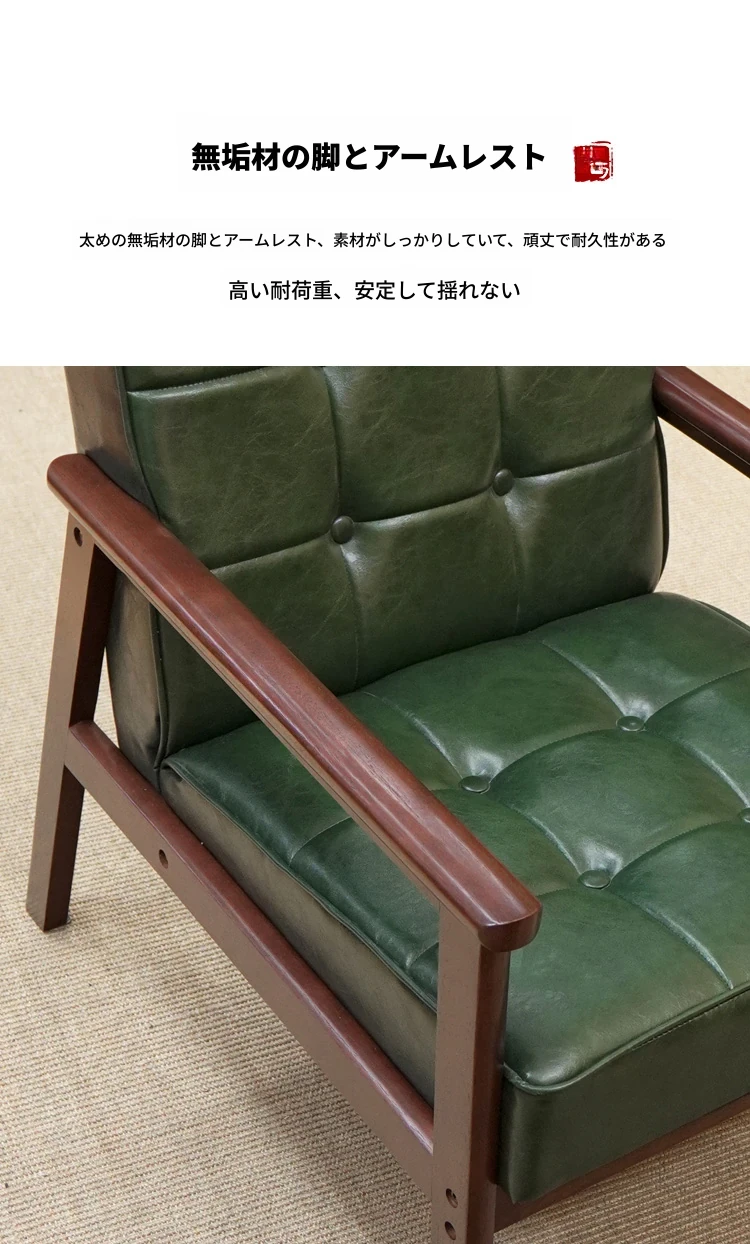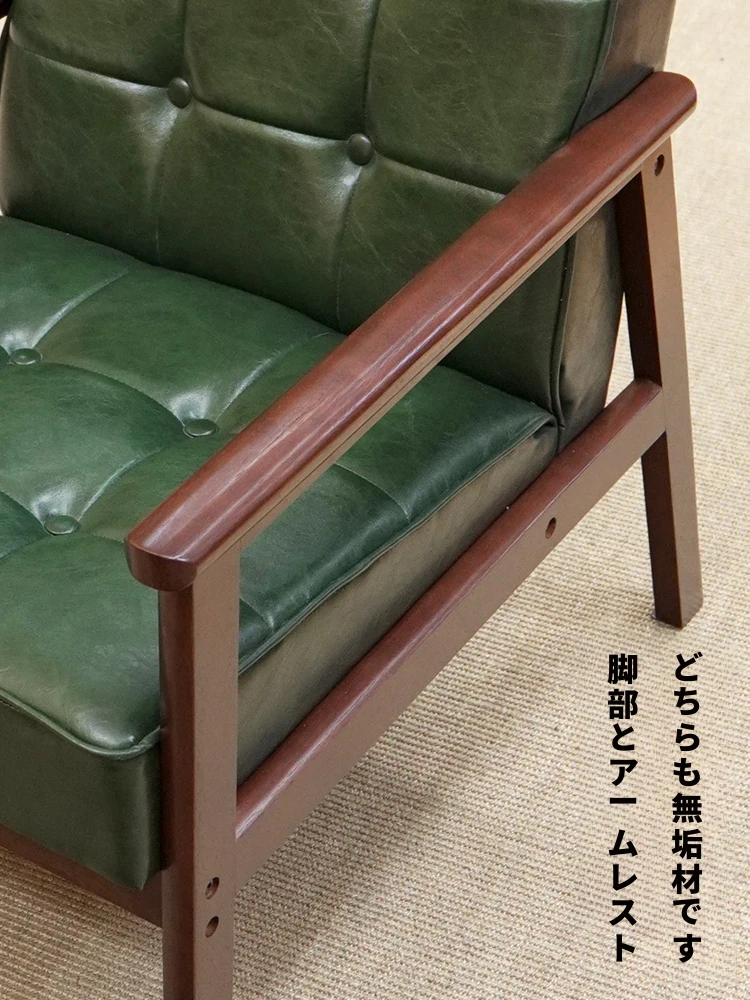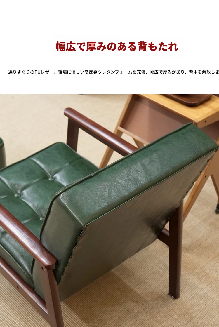 【エメラルドスクエアソファチェア】シンプルでおしゃれなレザー製一人用ソファ、リビングにぴったりな木製背もたれ付き。快適なくつろぎ空間を演出!