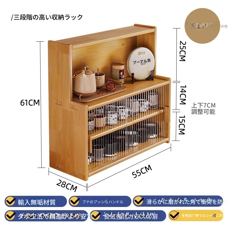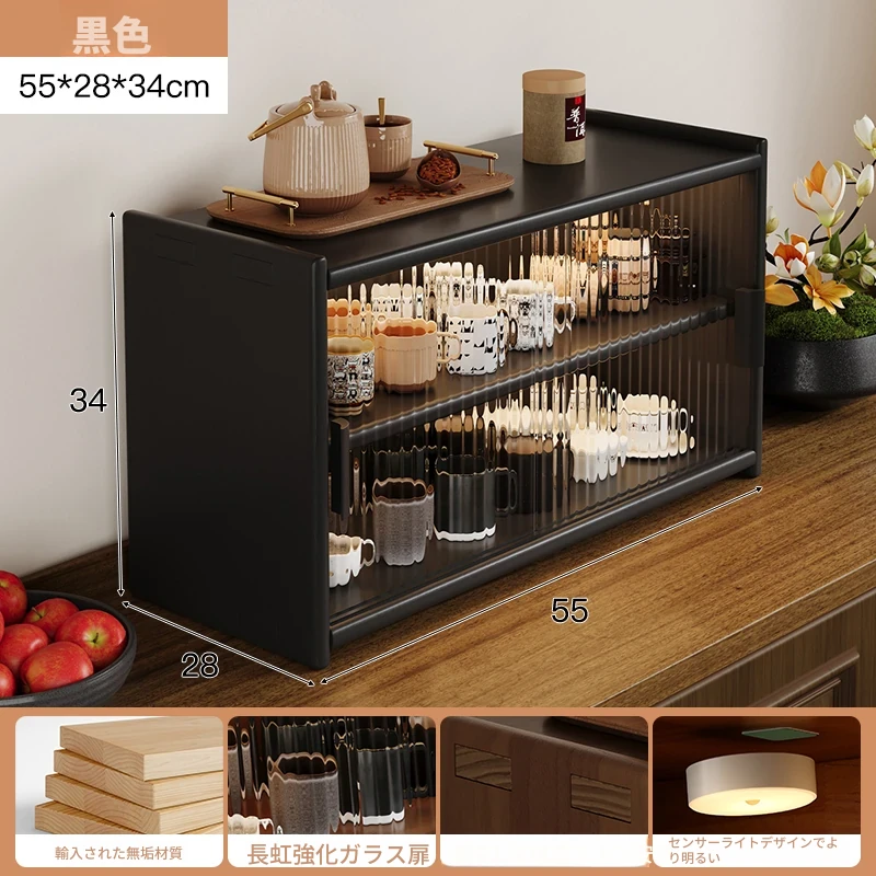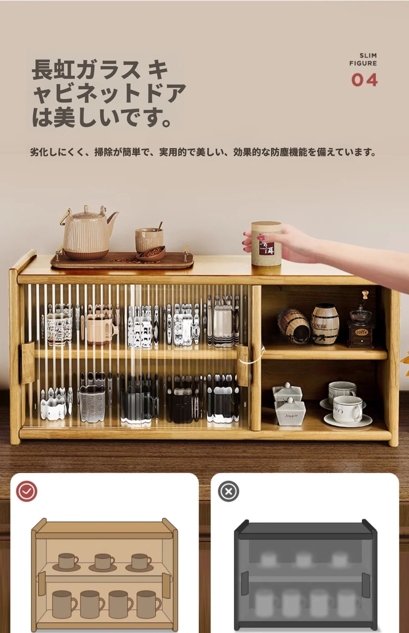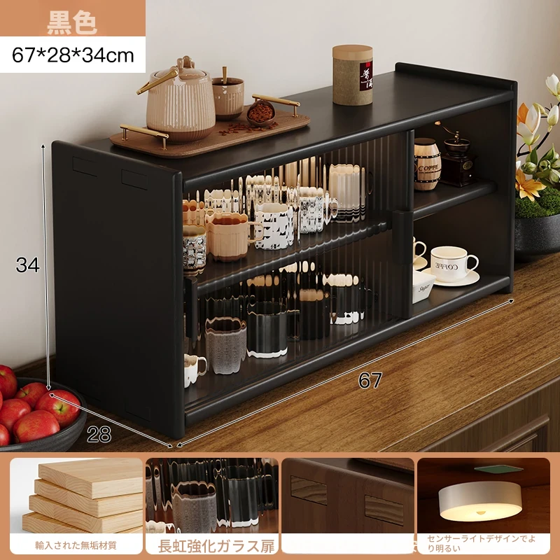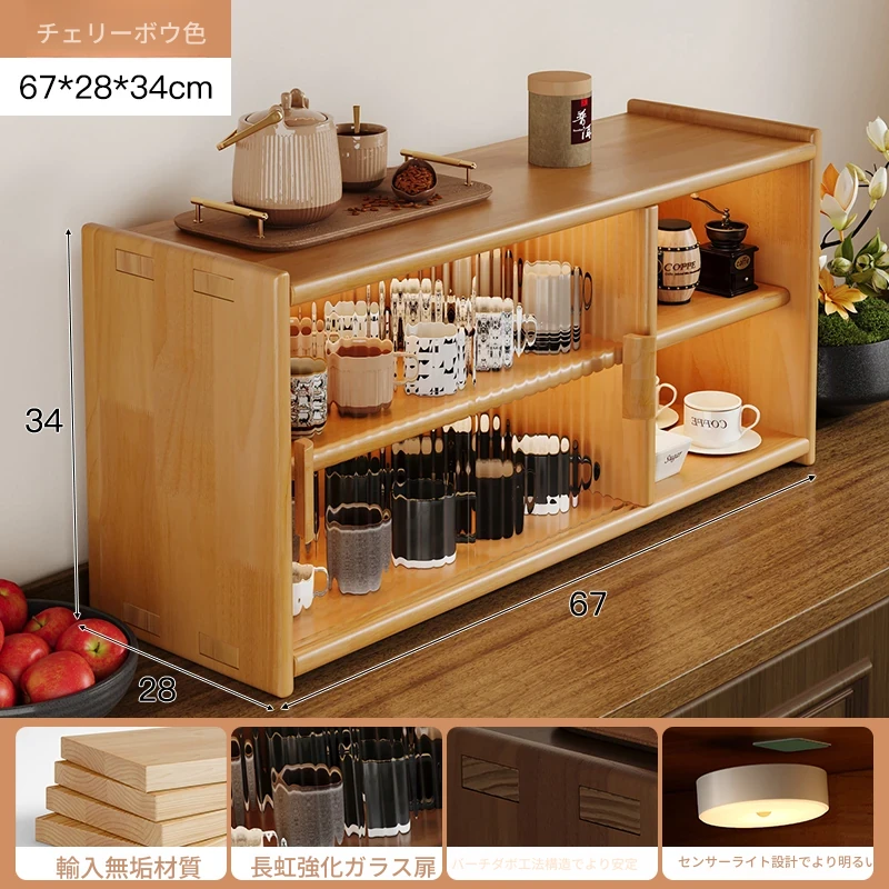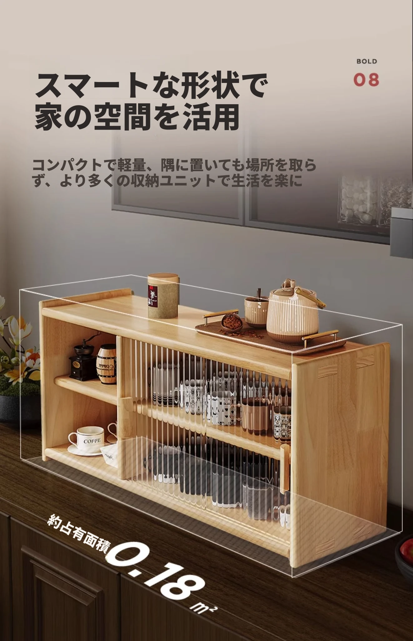 無垢材デスク収納ラック - 日本風カップ収納、ほこり防止ガラス扉付き、デスクサイドキャビネットに最適なカップスタンド!おしゃれで機能的な収納で、あなたの空間を美しく整えます。