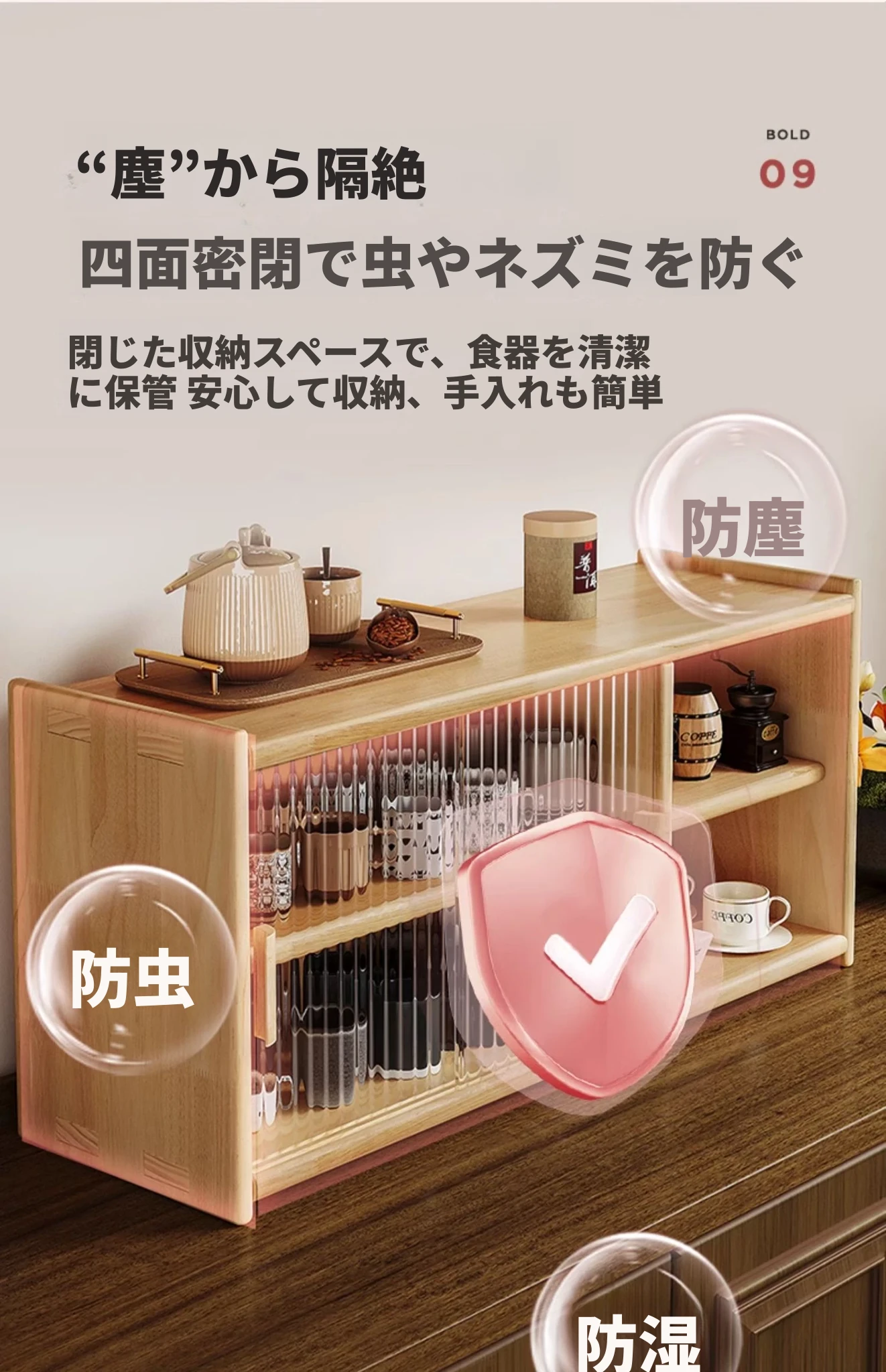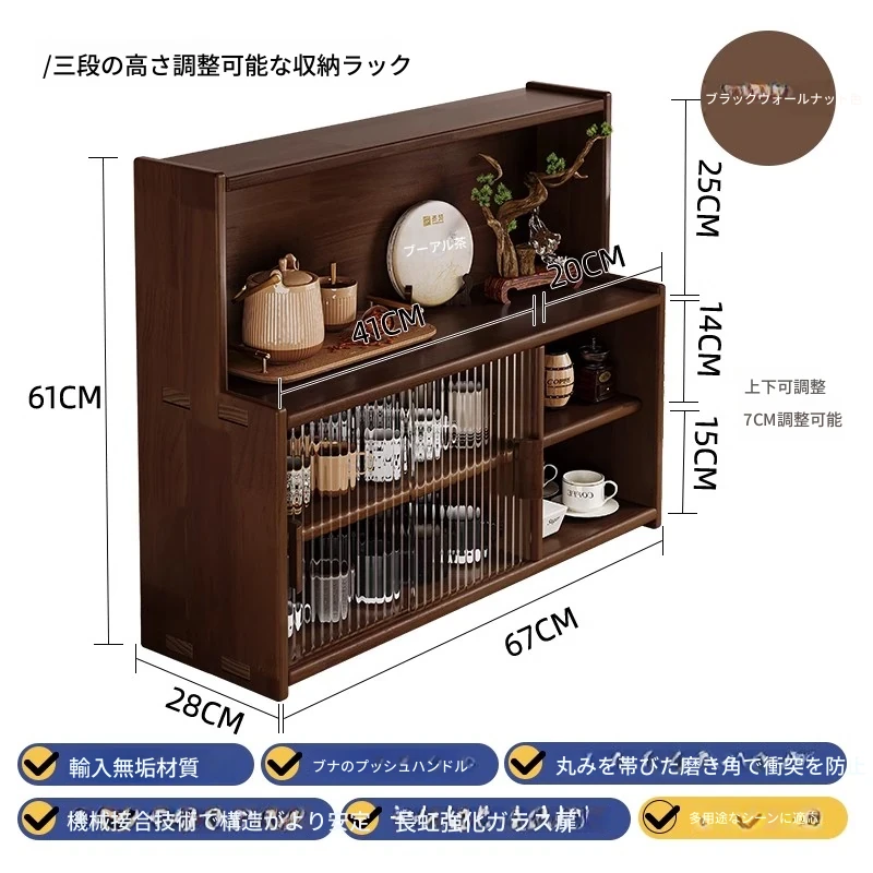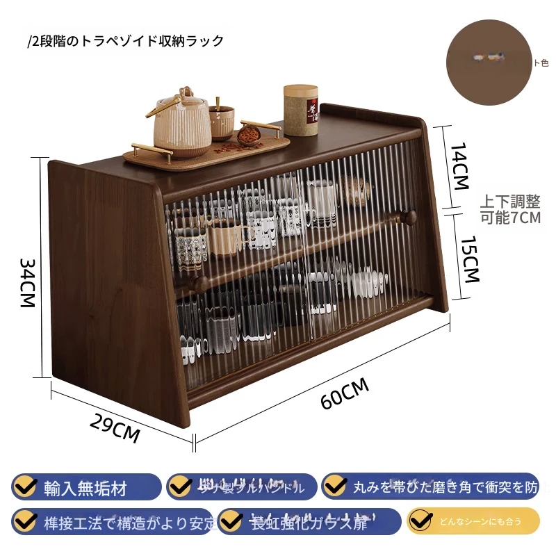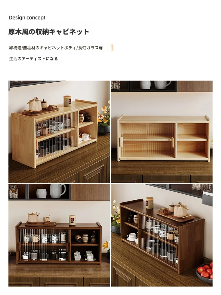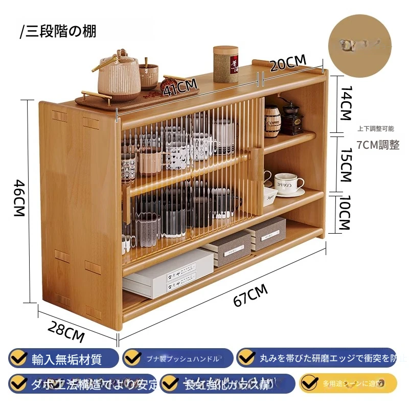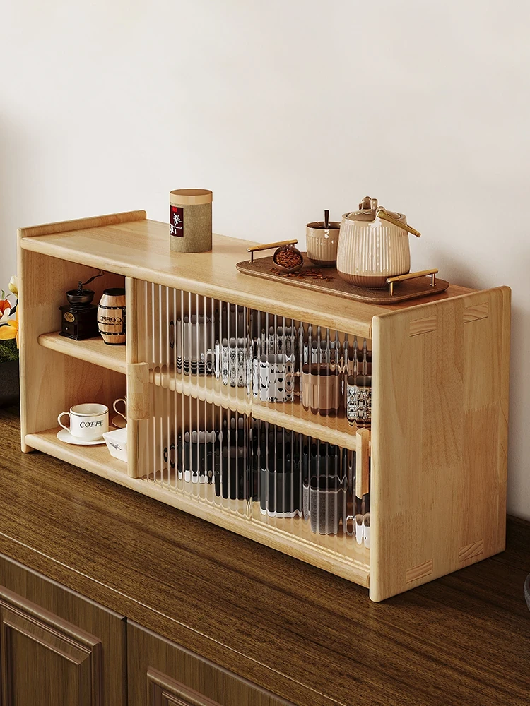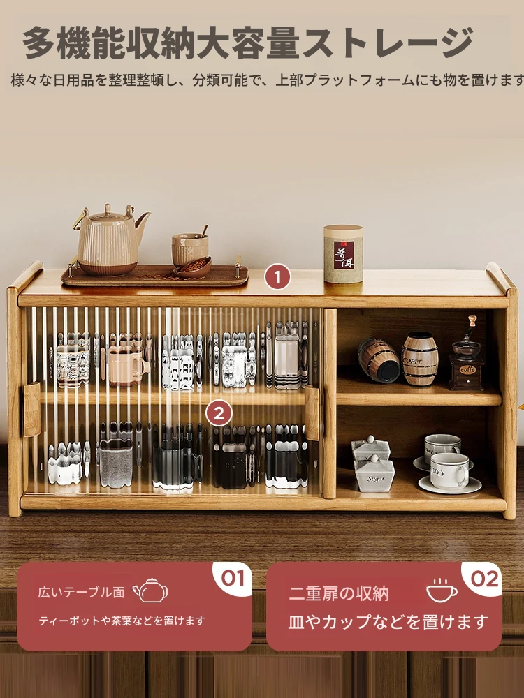 無垢材デスク収納ラック - 日本風カップ収納、ほこり防止ガラス扉付き、デスクサイドキャビネットに最適なカップスタンド!おしゃれで機能的な収納で、あなたの空間を美しく整えます。