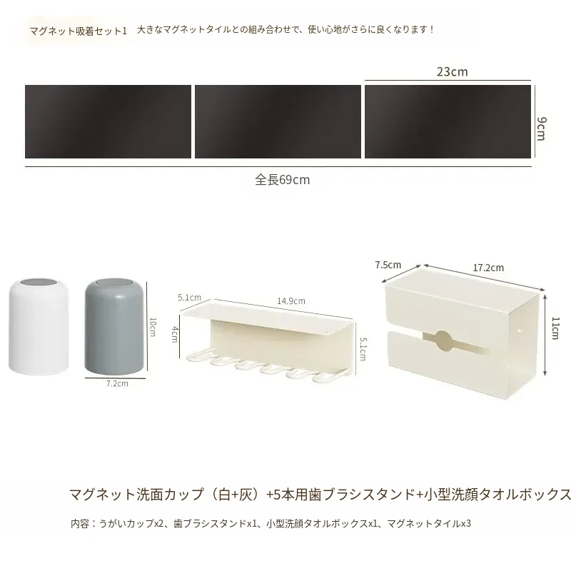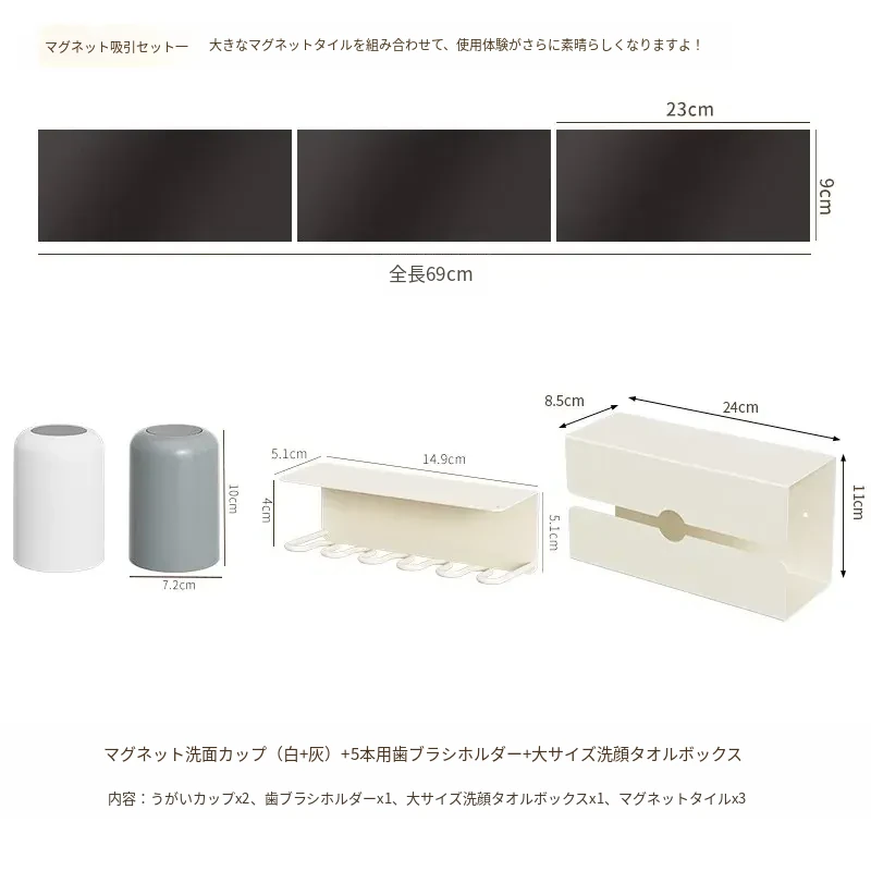 マグネット吸引セットD:シンプルなうがいカップx2+5口歯ブラシホルダー+大サイズ洗顔タオルボックス+MXLマグネットシールx3
