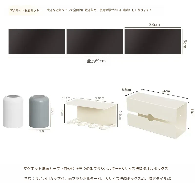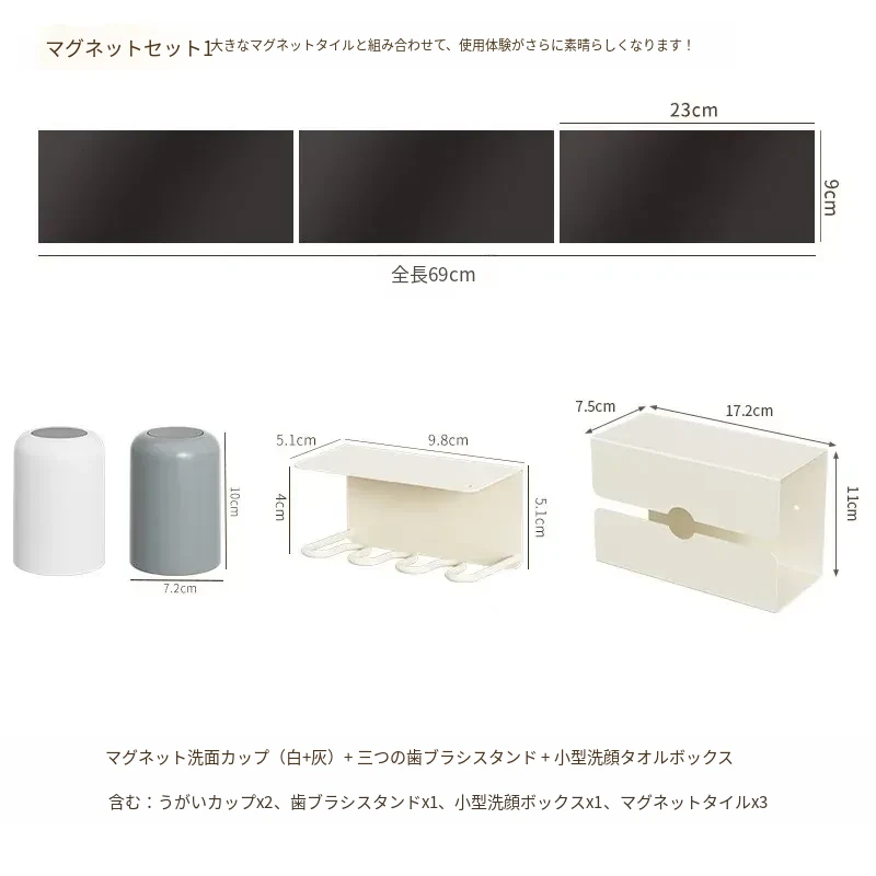 マグネット吸引セットA:シンプルなうがいカップx2+三つの歯ブラシホルダー+小型洗顔タオルボックス+MXLマグネットx3