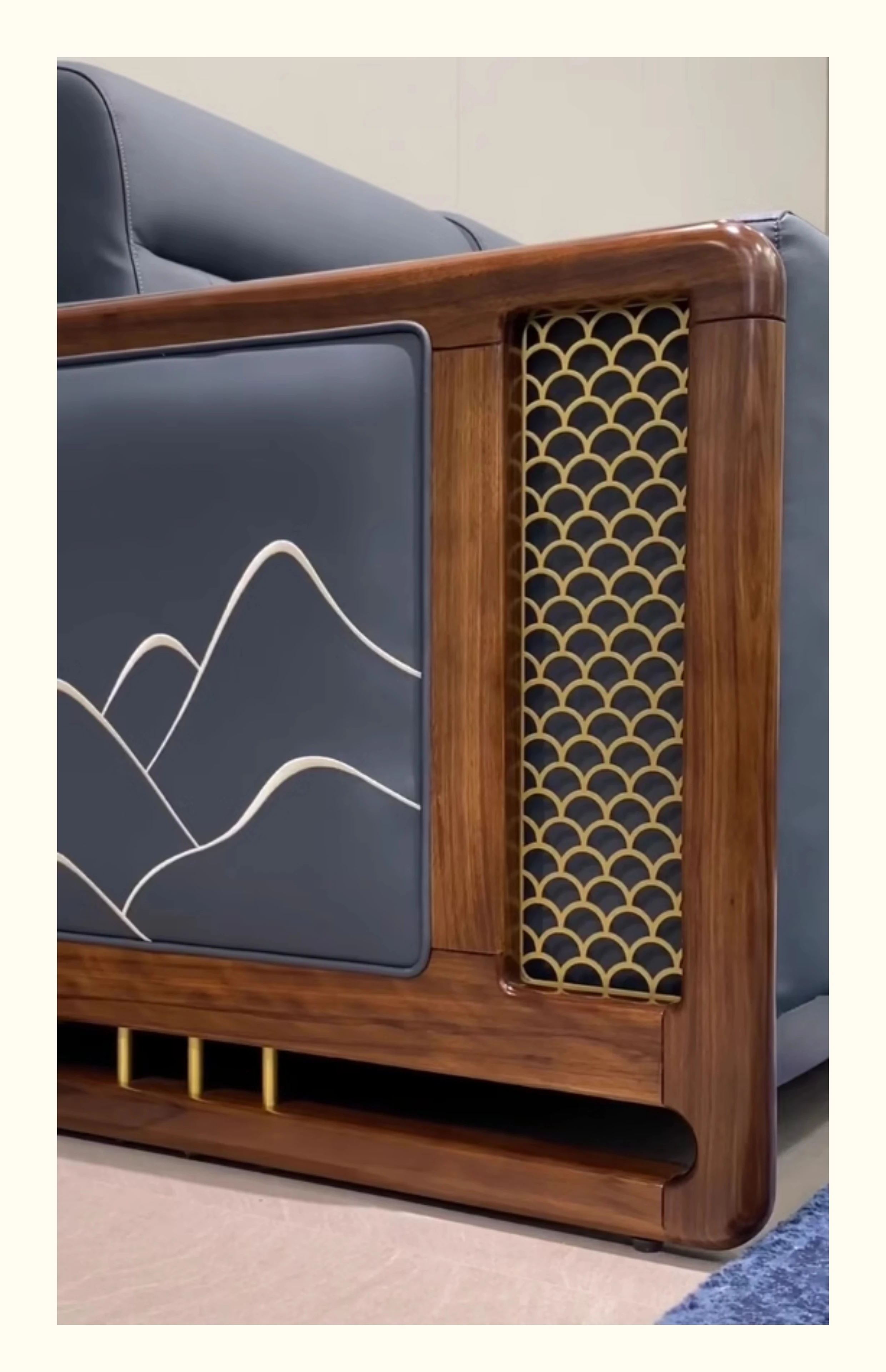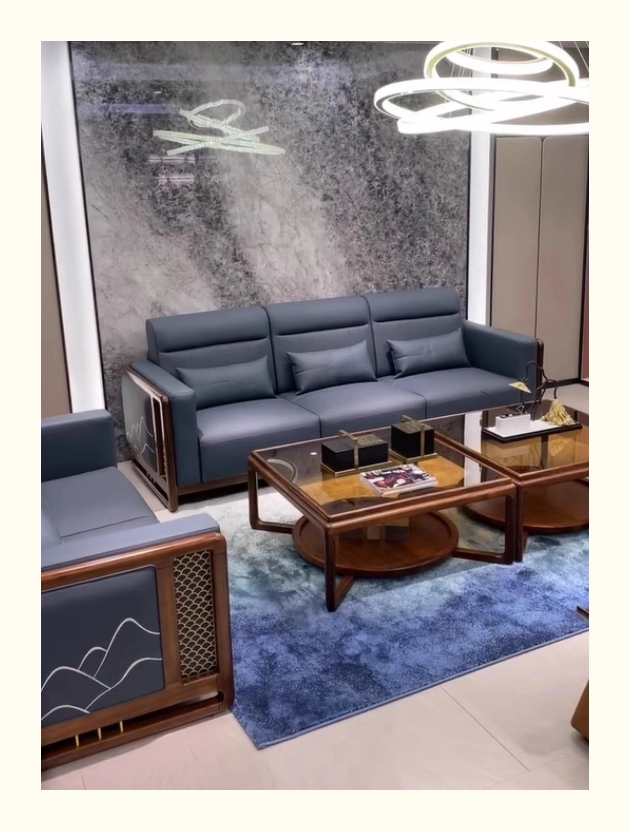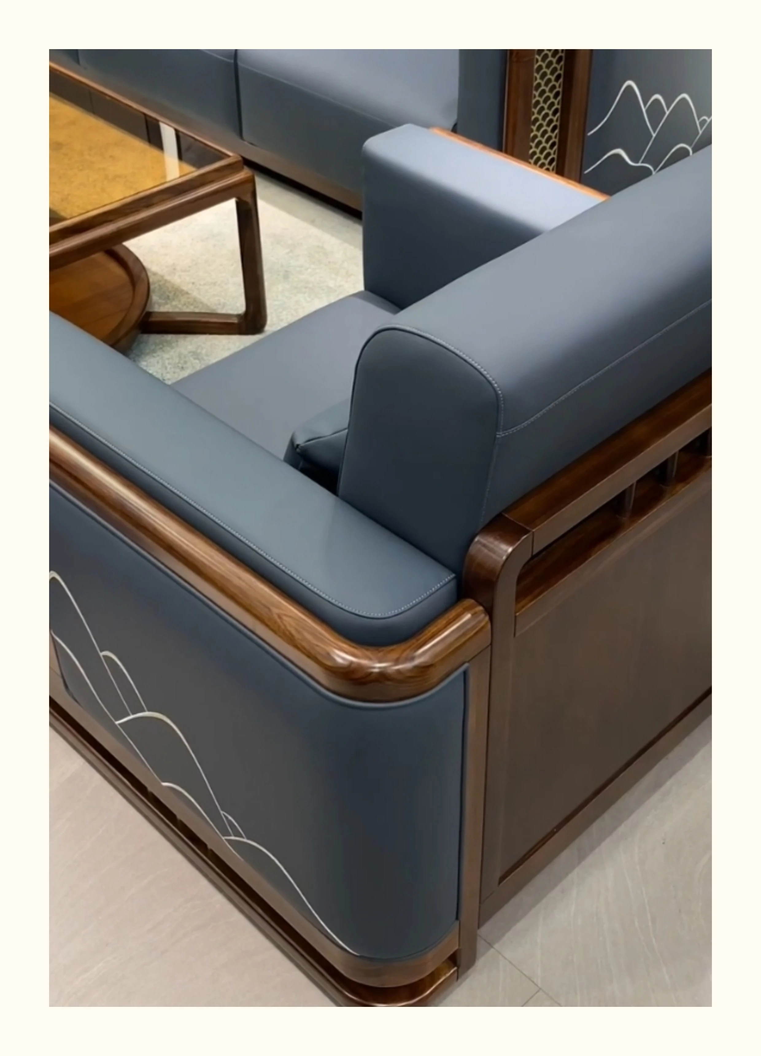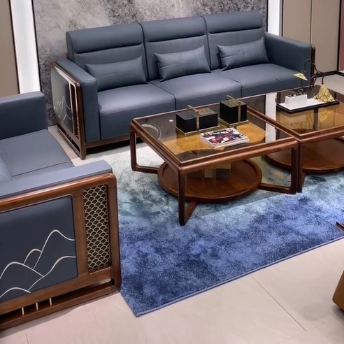 新中式スタイルの無垢材ソファセット - 小型住宅や別荘のための洗練されたリビング用、直線デザインのレザーソファでスタイリッシュな空間を演出!