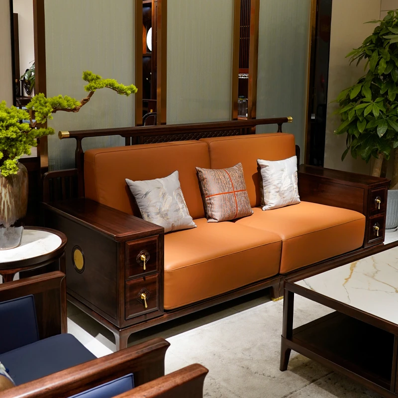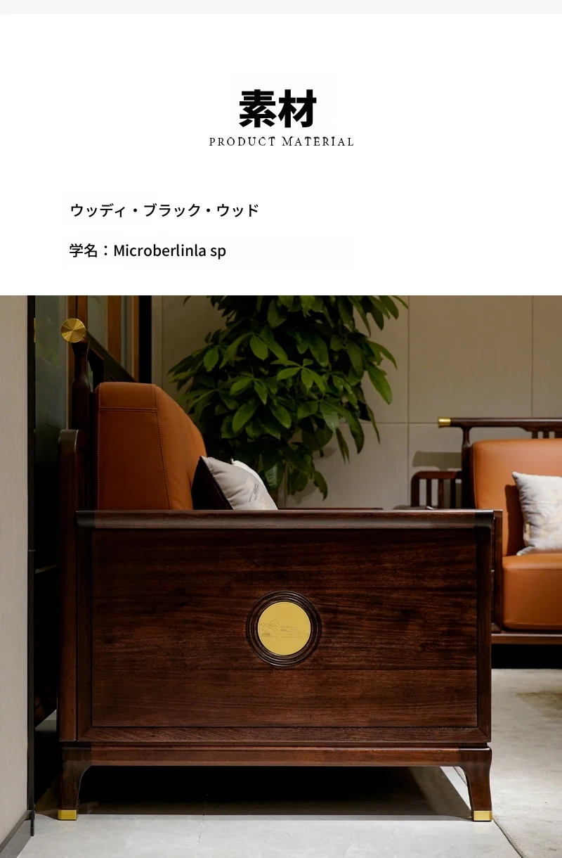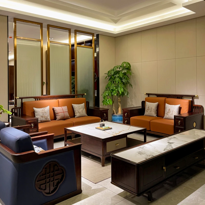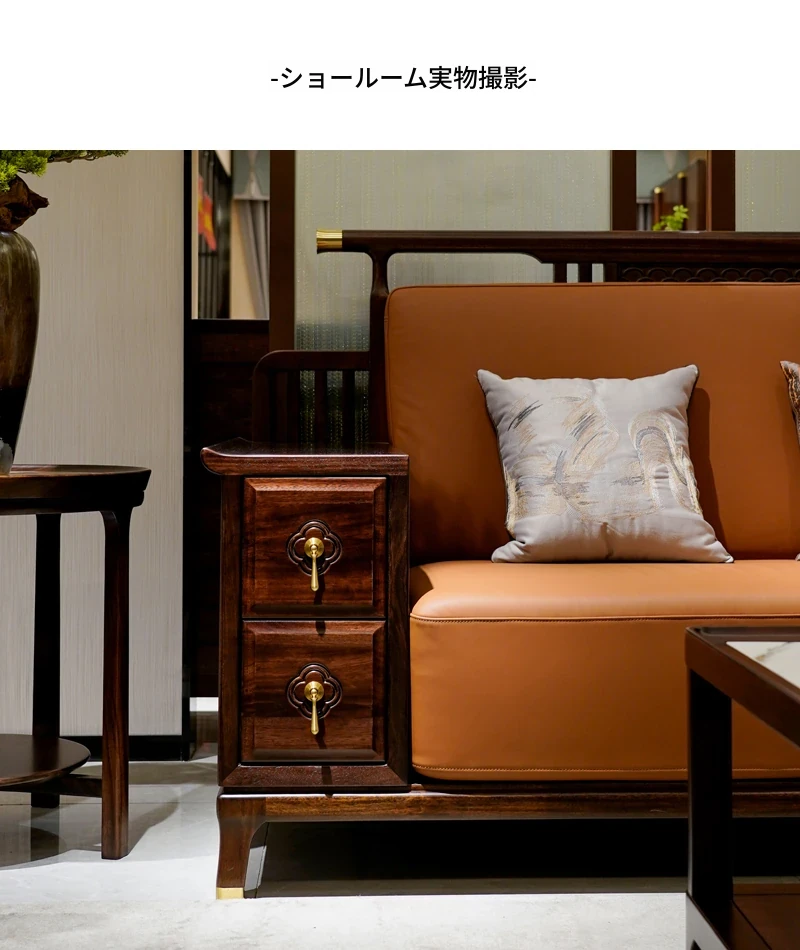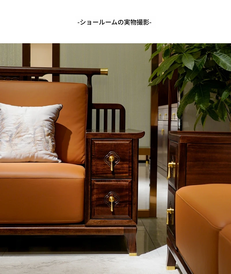 現代新中式ウッディーなウーキン材の本革ソファセット - 大型リビングに最適な高級別荘家具!快適さとスタイルを両立した理想的な空間を演出します。