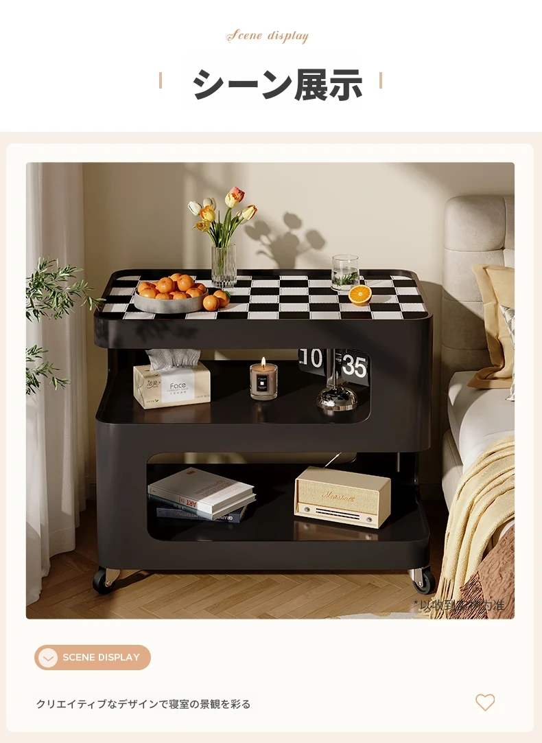 シンプルでモダンなアイアン製ベッドサイドテーブル - キャスター付きの便利な収納ラック!リビングやソファ横にぴったりなスレート天板のサイドキャビネット、家での使い勝手を向上させるスタイリッシュなアイテムです。