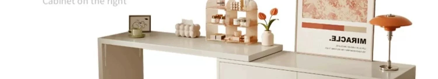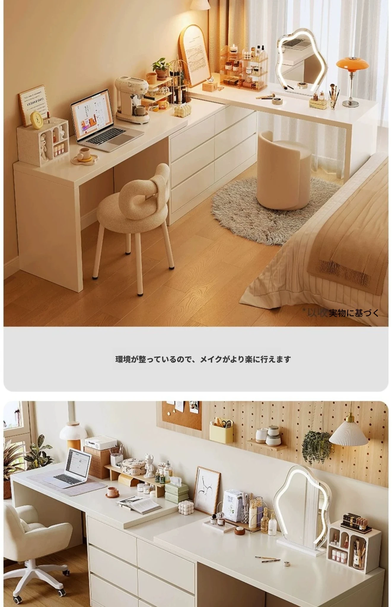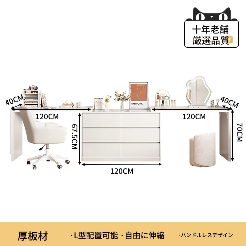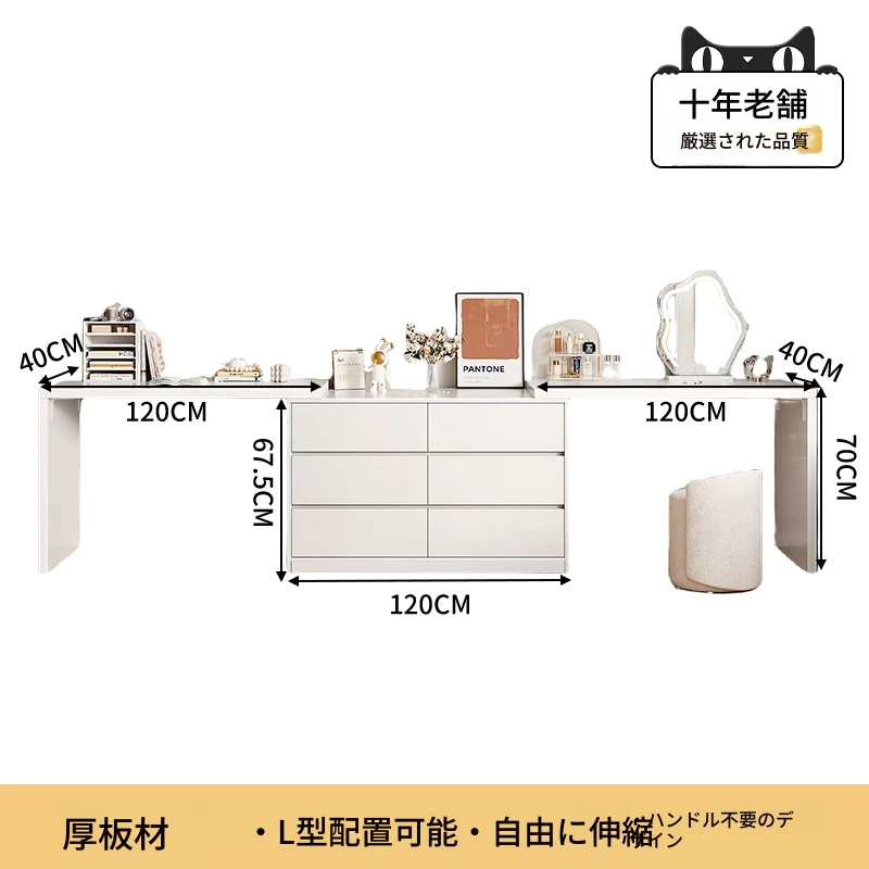【雲の鏡+皮製スツール+パソコンチェア】1.2mテーブル×2+1.2mチェスト 暖白