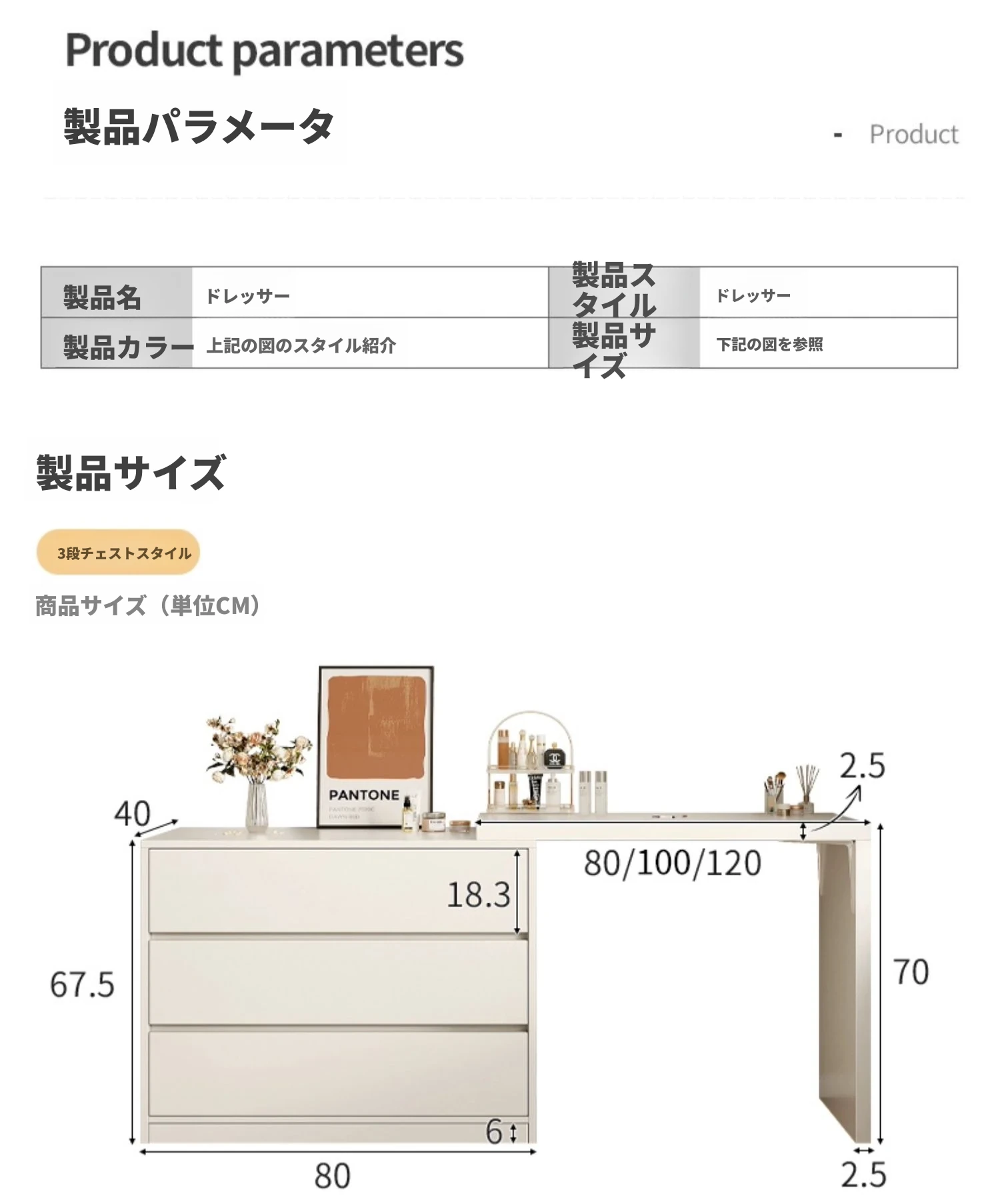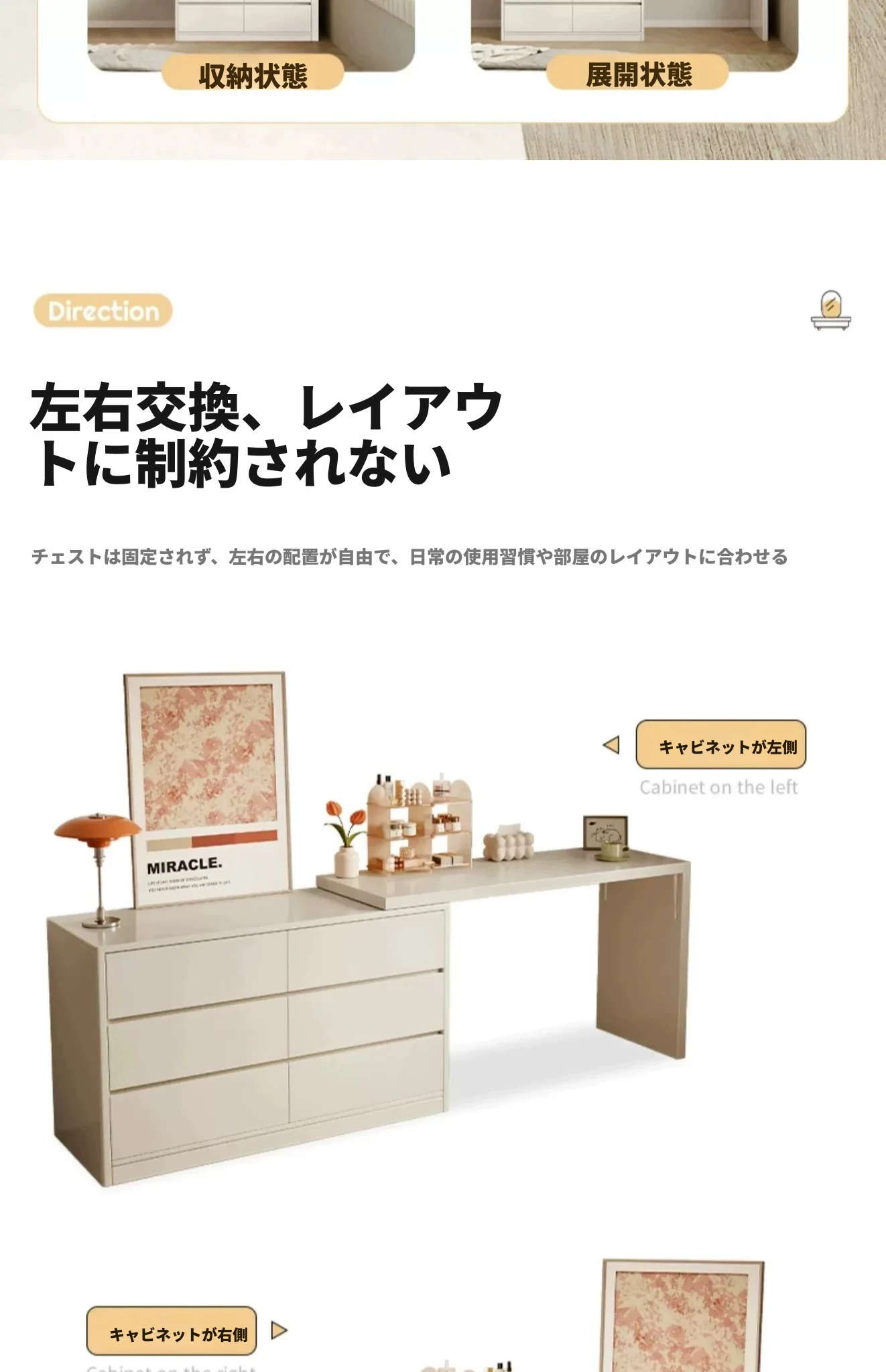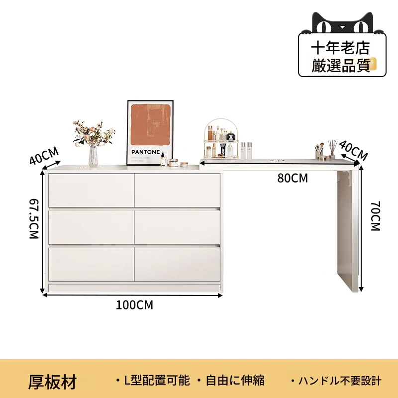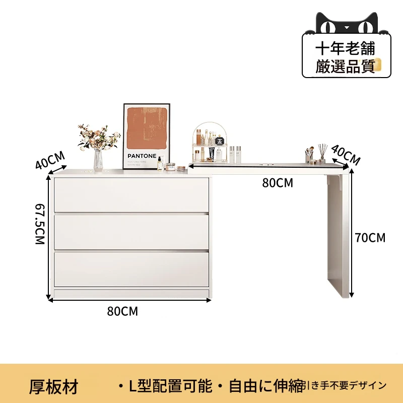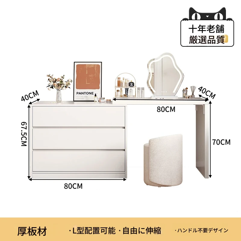 【雲の鏡+皮製スツールセット】0.8mテーブル+0.8m三段チェスト 暖白